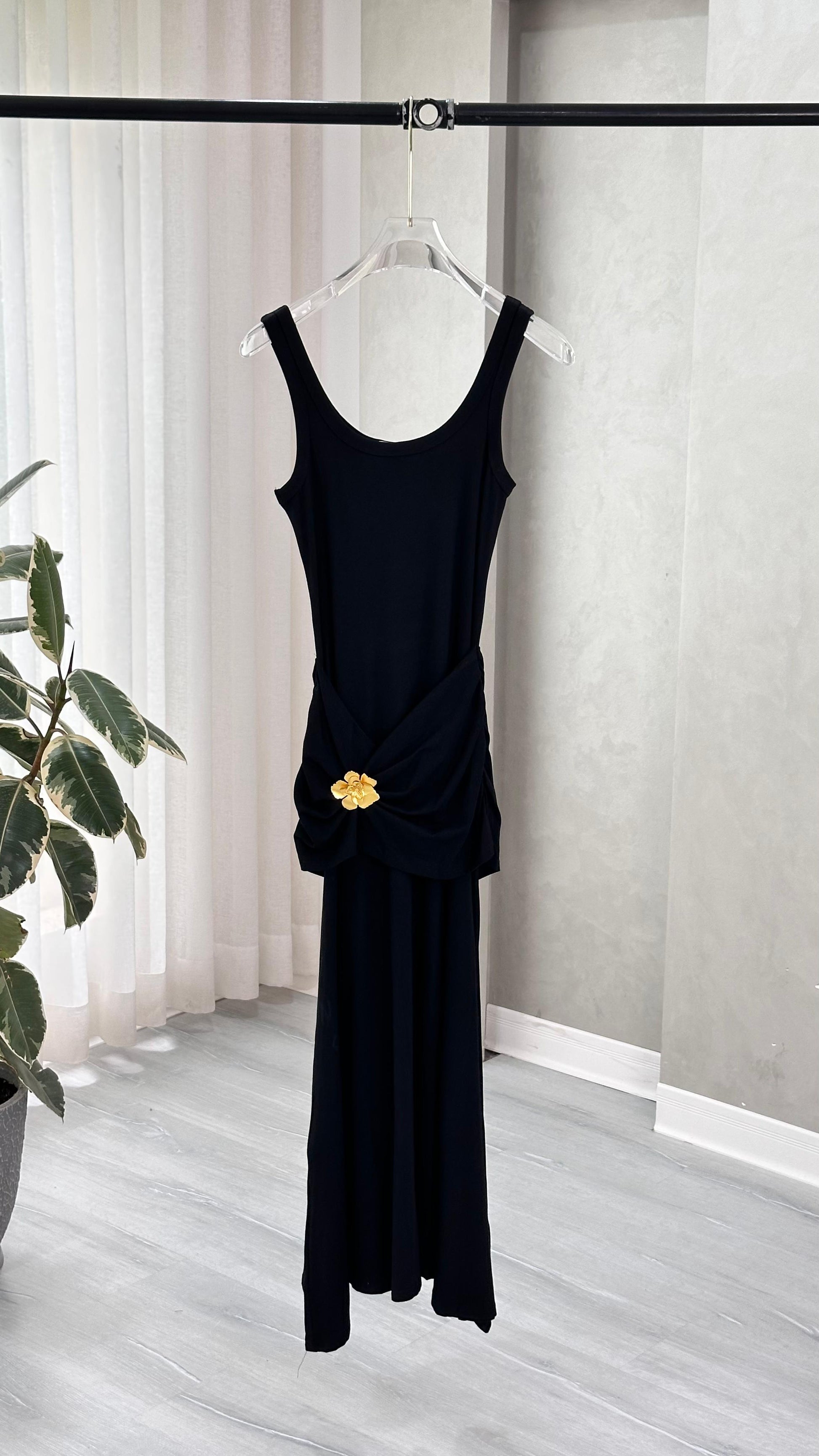 فستان طويل بقصة "ماكسي" أو "بنسل" تنساب حول الجسم بأناقة. يتميز هذا التصميم بنسيجه المريح وعالي الجودة الذي يوفر نعومة ومرونة فائقة. يأتي الفستان بحمالات كتف رفيعة أو عريضة (حسب الرؤية) وفتحة رقبة مستديرة أو مربعة ناعمة. التفصيلة المركزية البارزة هي الكسرات الجانبية المعقودة أو المثبتة بدبوس/حلقة، والتي تمنح تحديداً أنيقاً للخصر وتضيف ثنيات رقيقة تبرز جمال القوام. إنه خيار مثالي يجمع بين التصميم الجريء والأناقة الراقية.