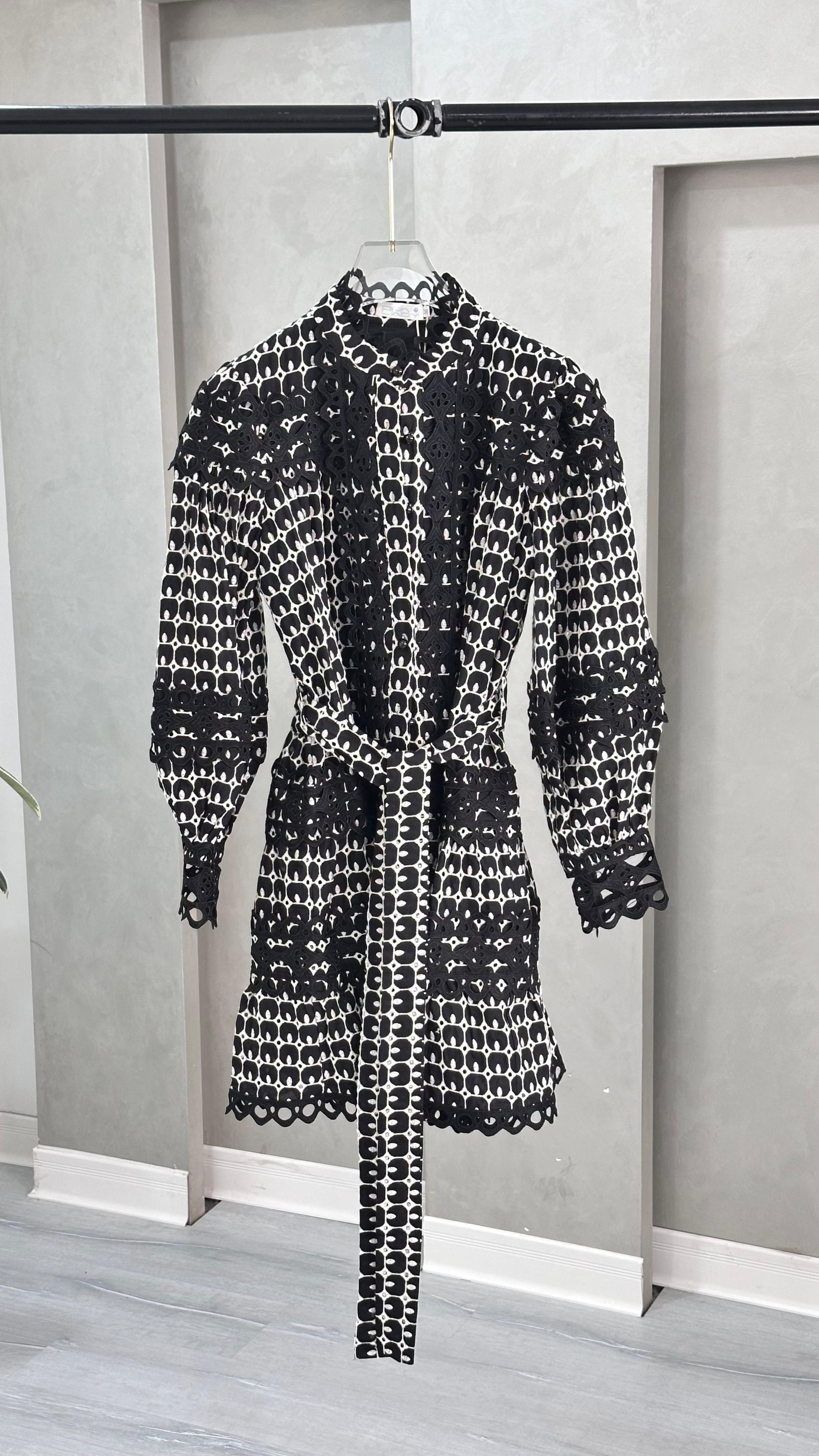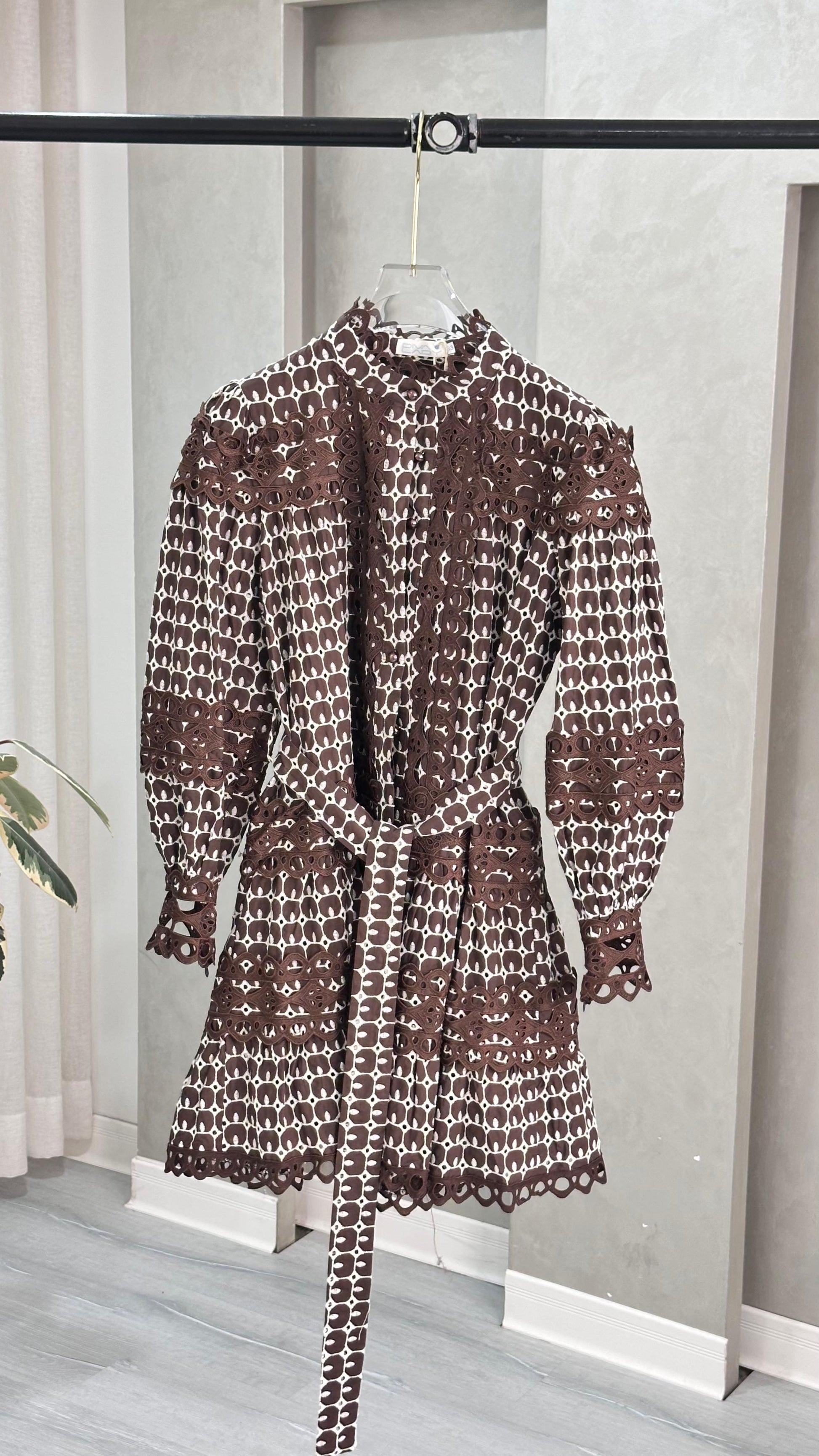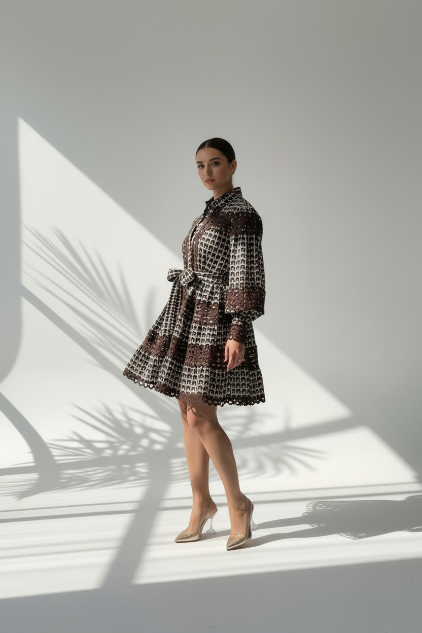 الفستان يتميز بنمط زخرفي متكرر يغطي القماش بالكامل، مع تفاصيل دقيقة من الدانتيل تضيف لمسة أنثوية راقية. التصميم يشمل أزرار أمامية تمتد من الياقة حتى أسفل الخصر، مما يمنح الفستان طابعًا كلاسيكيًا أنيقًا. الأكمام طويلة ومغلقة عند المعصم، مما يضفي توازنًا بين الرقي والاحتشام. التنورة واسعة ومفلّرة، تنتهي بحافة مزينة بدانتيل مقصوص بشكل متموج، يضفي حركة وانسيابية على الإطلالة. التناسق بين النقوش والدانتيل يمنح الفستان طابعًا فنيًا متقنًا يجمع بين التقاليد والحداثة.