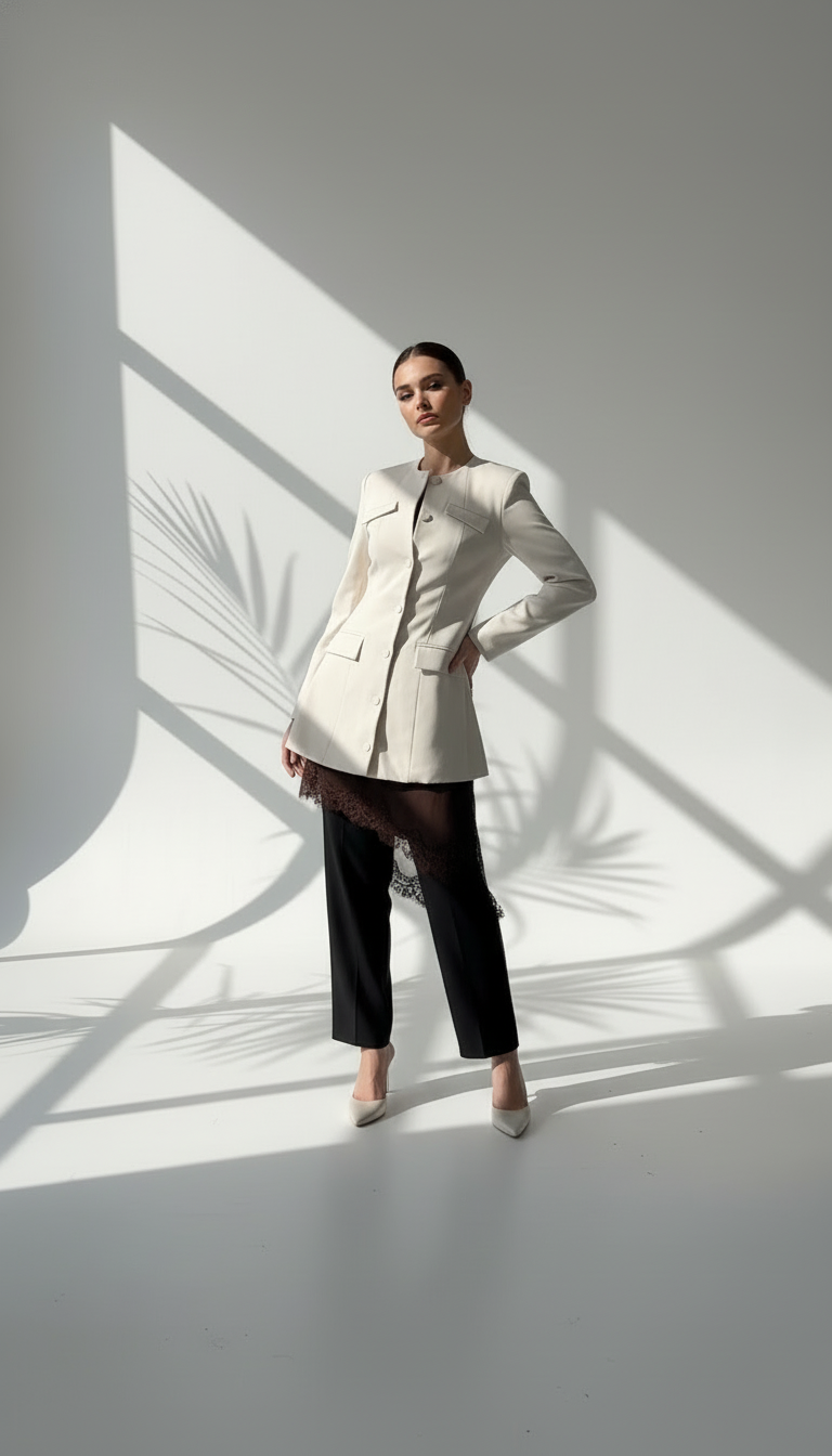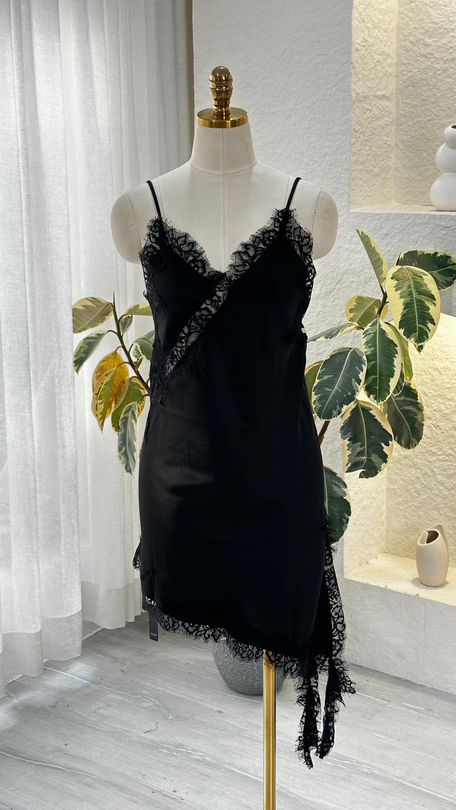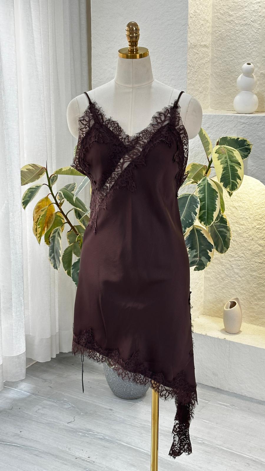 التفاصيل الدانتيل على الأطراف تعطيه لمسة فاخرة، والقصّة المائلة من الأسفل تضيف جمال وحركة للفستان.
