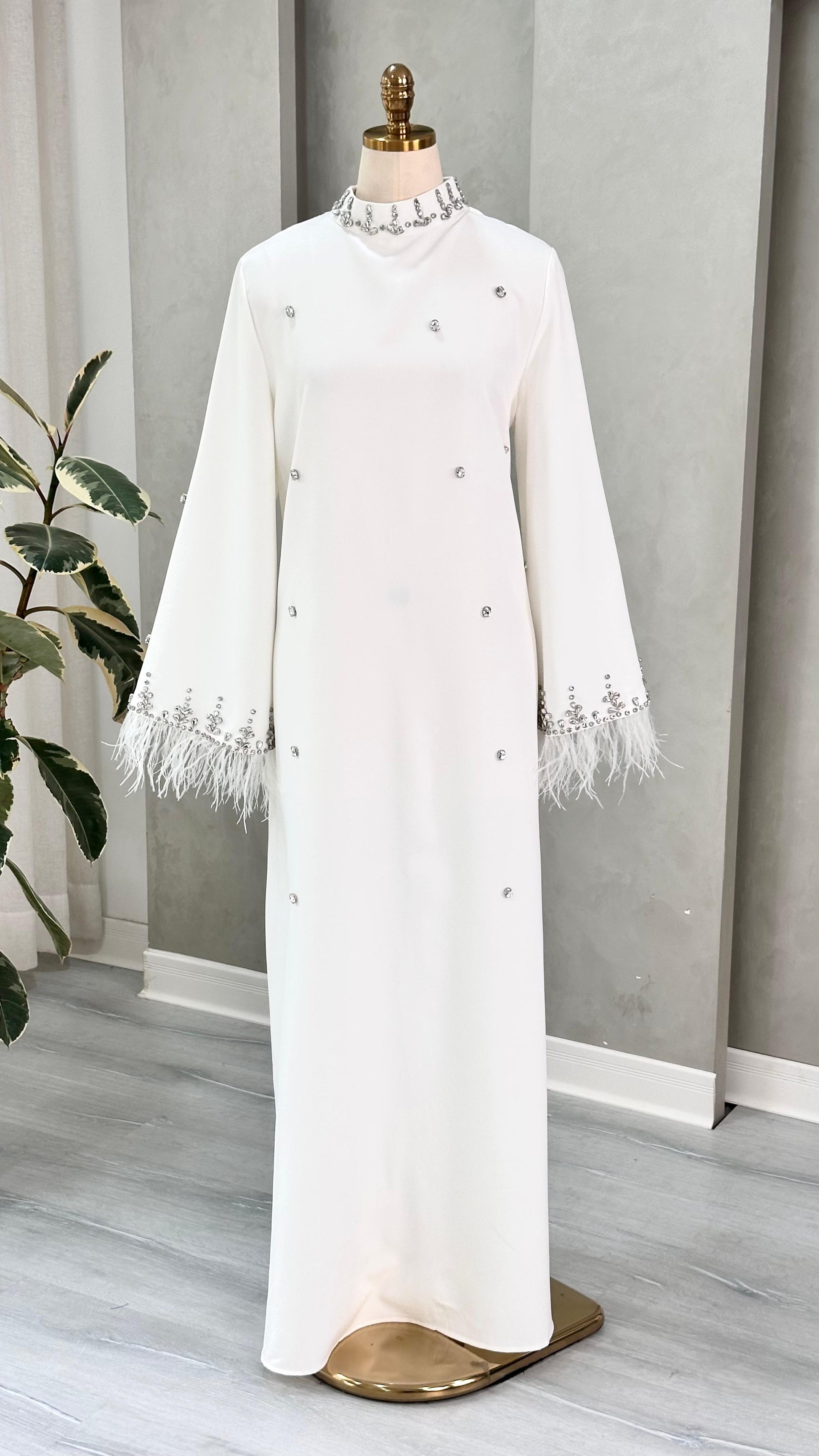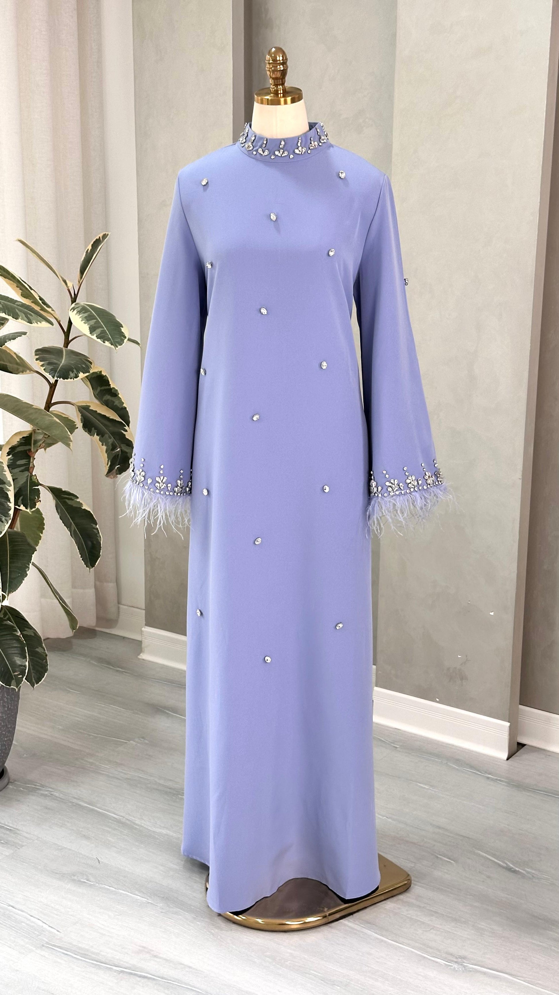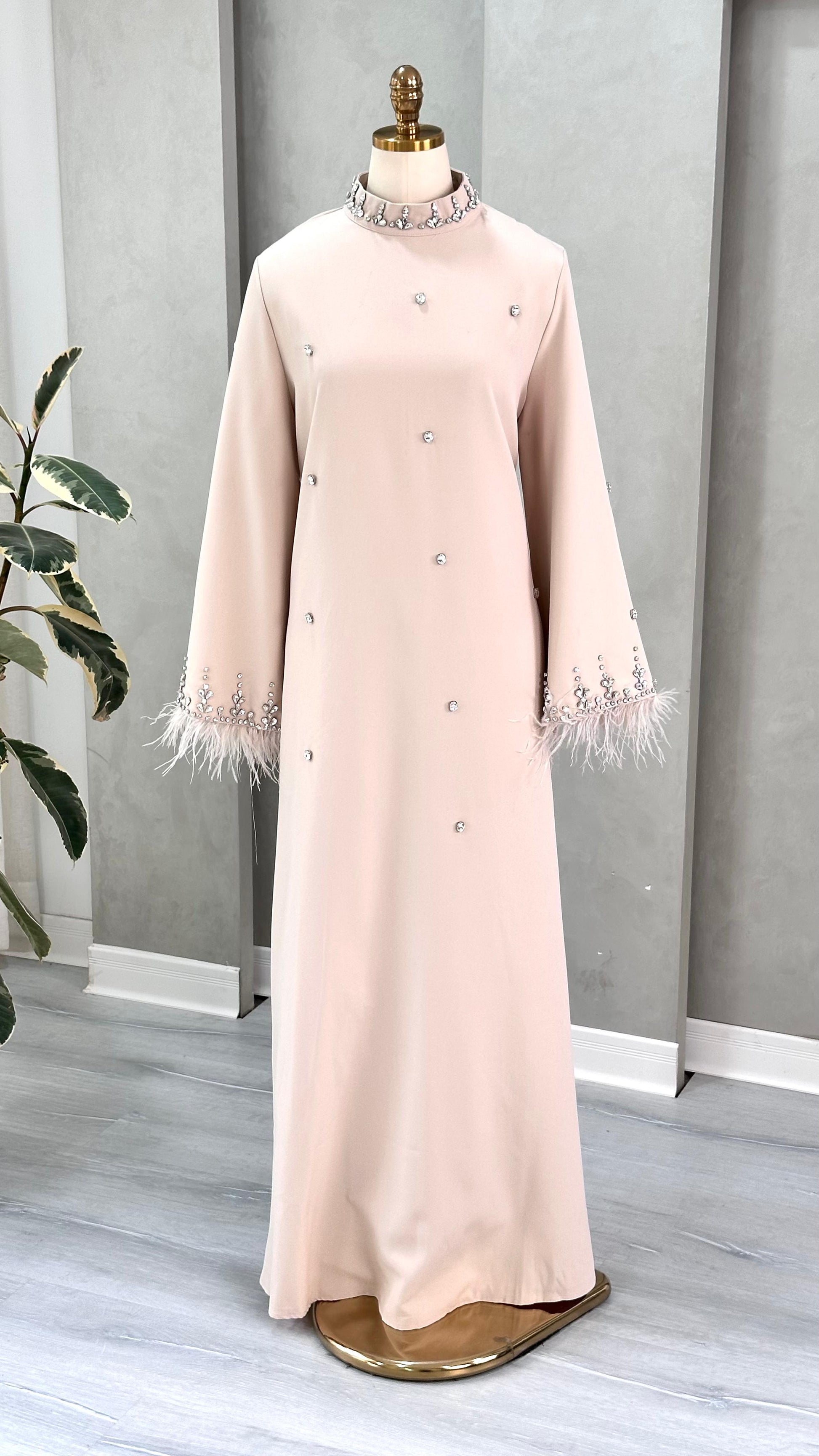 - **التنورة**: تنسدل بانسيابية حتى الأرض، بقصة مستقيمة وناعمة، مما يمنح الفستان طابعاً ملكياً وهادئاً.