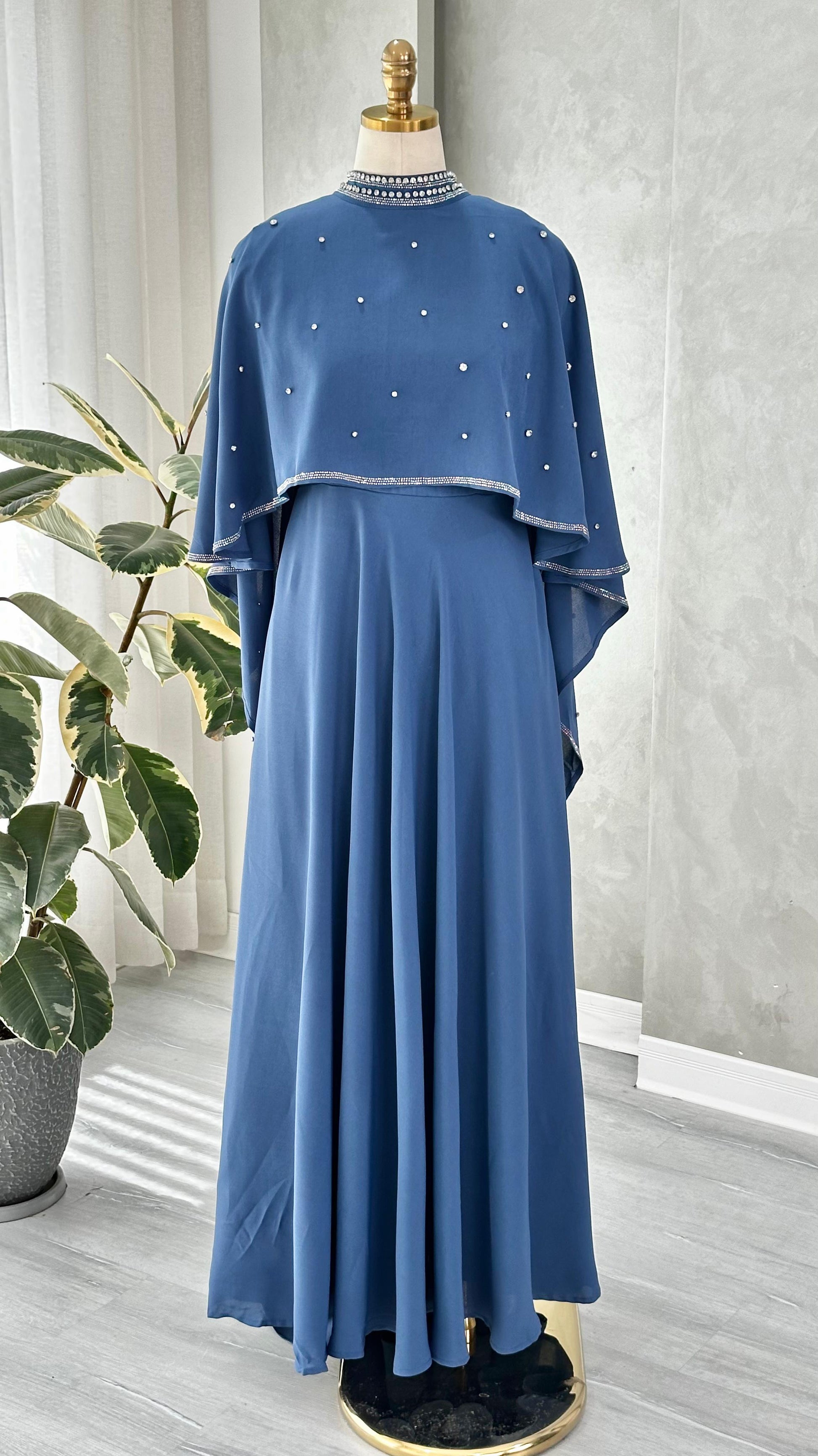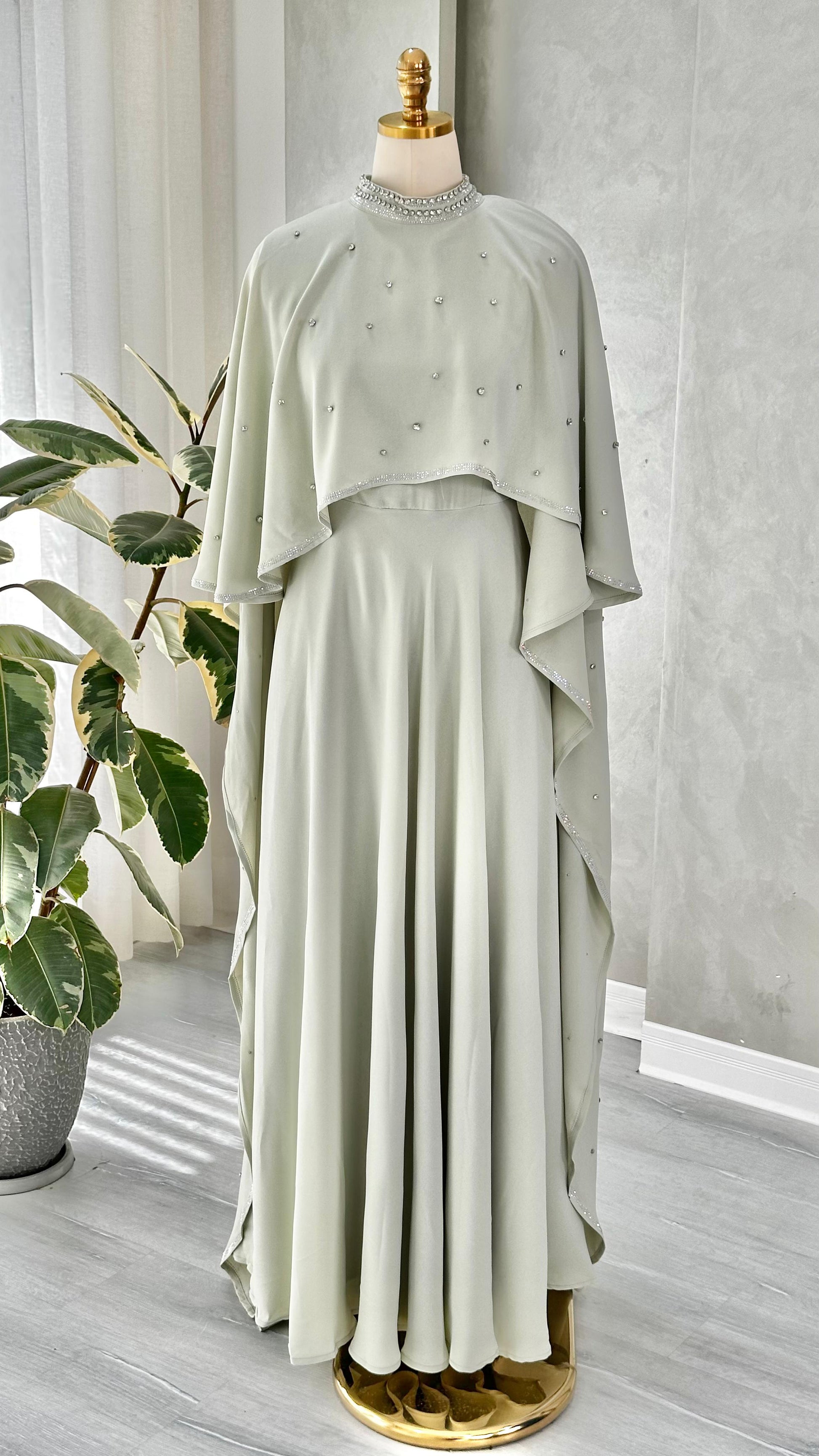 - **الرقبة**: مرتفعة ومغلقة، مزينة بحافة زخرفية لامعة تضيف لمسة فاخرة حول العنق.