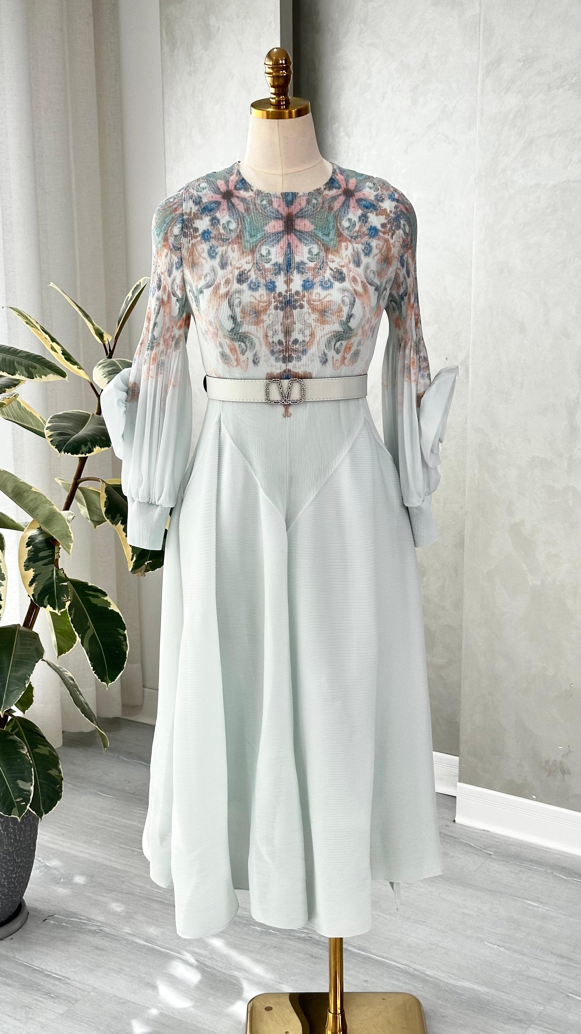 - **الخصر**: محدد بحزام من نفس القماش، مزود بمشبك مزدوج دائري، يضفي توازناً بصرياً ويبرز شكل الجسم.