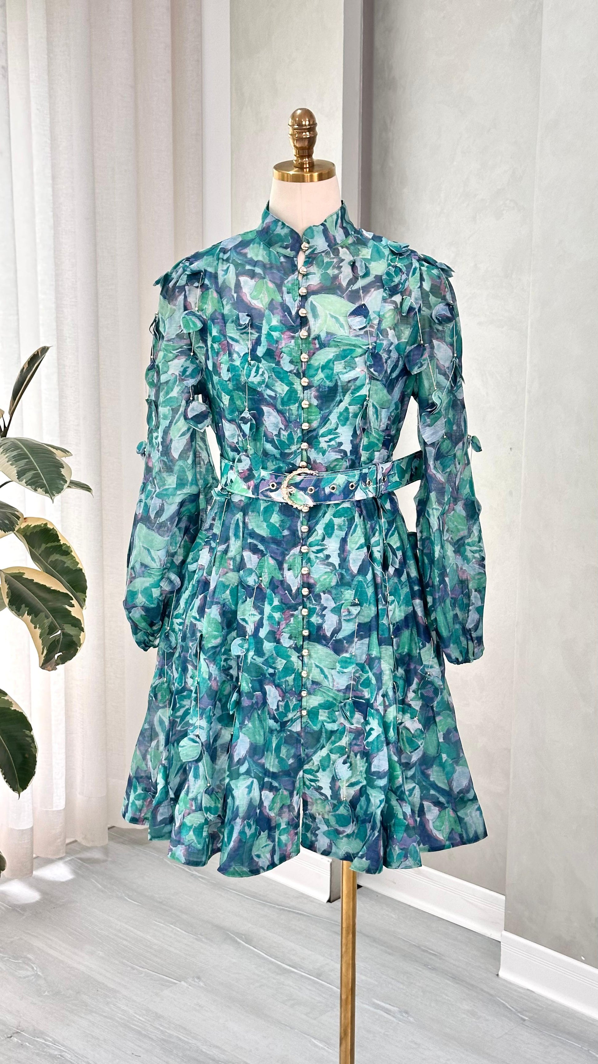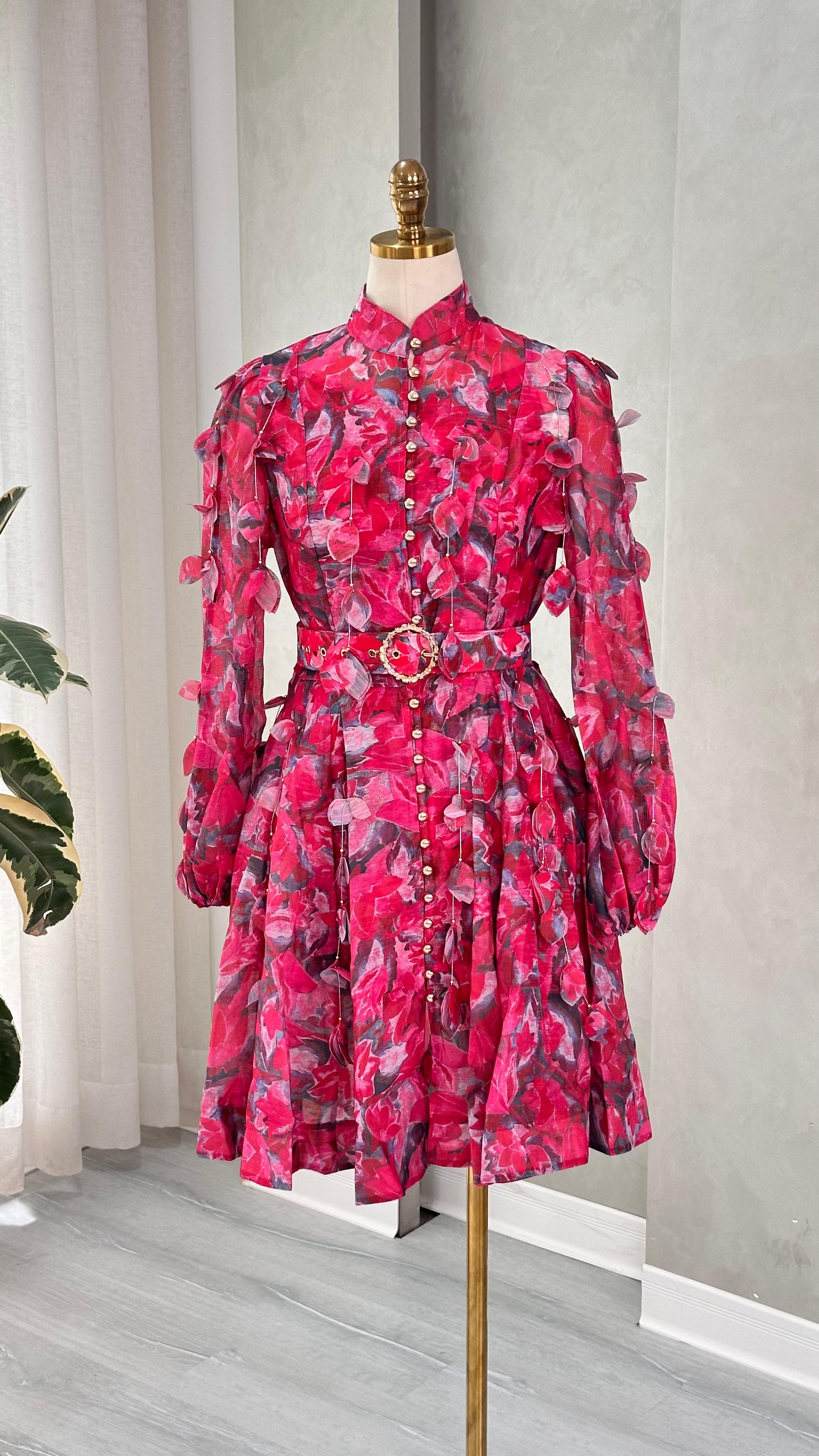 - **الخصر**: محدد بحزام من نفس القماش، مزود بمشبك معدني، مما يمنح الفستان شكلاً متناسقاً ويبرز القوام.