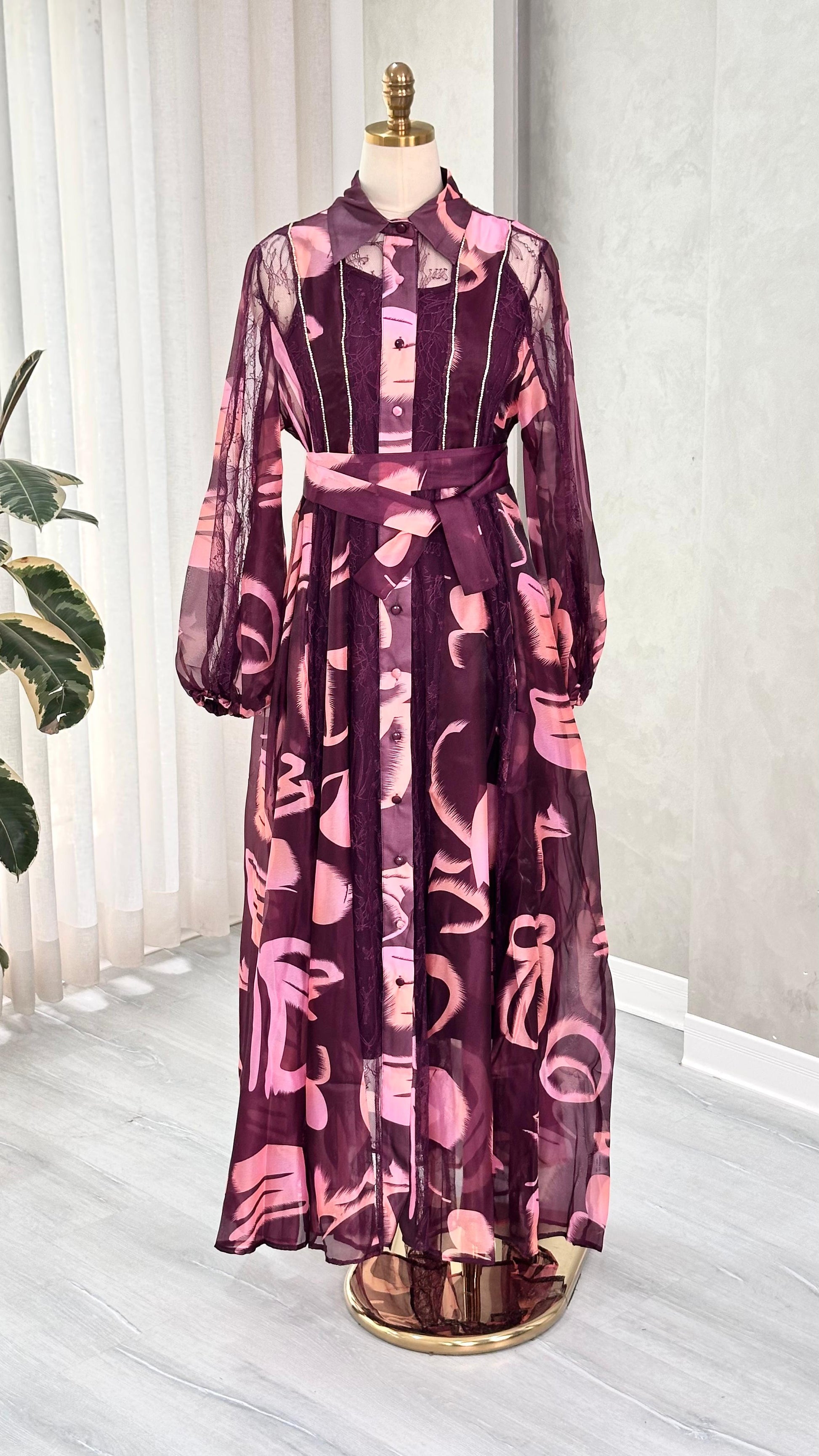 - **النقشة**: يغطي القماش نمط فني تجريدي متكرر، يضفي على الفستان طابعاً بصرياً مميزاً يجمع بين الجرأة والنعومة.