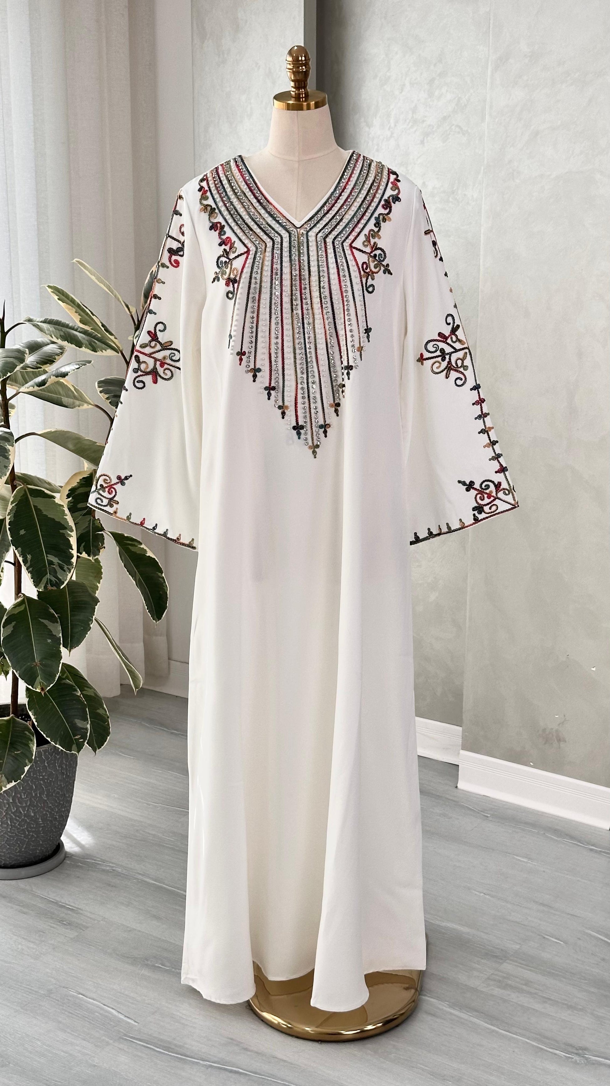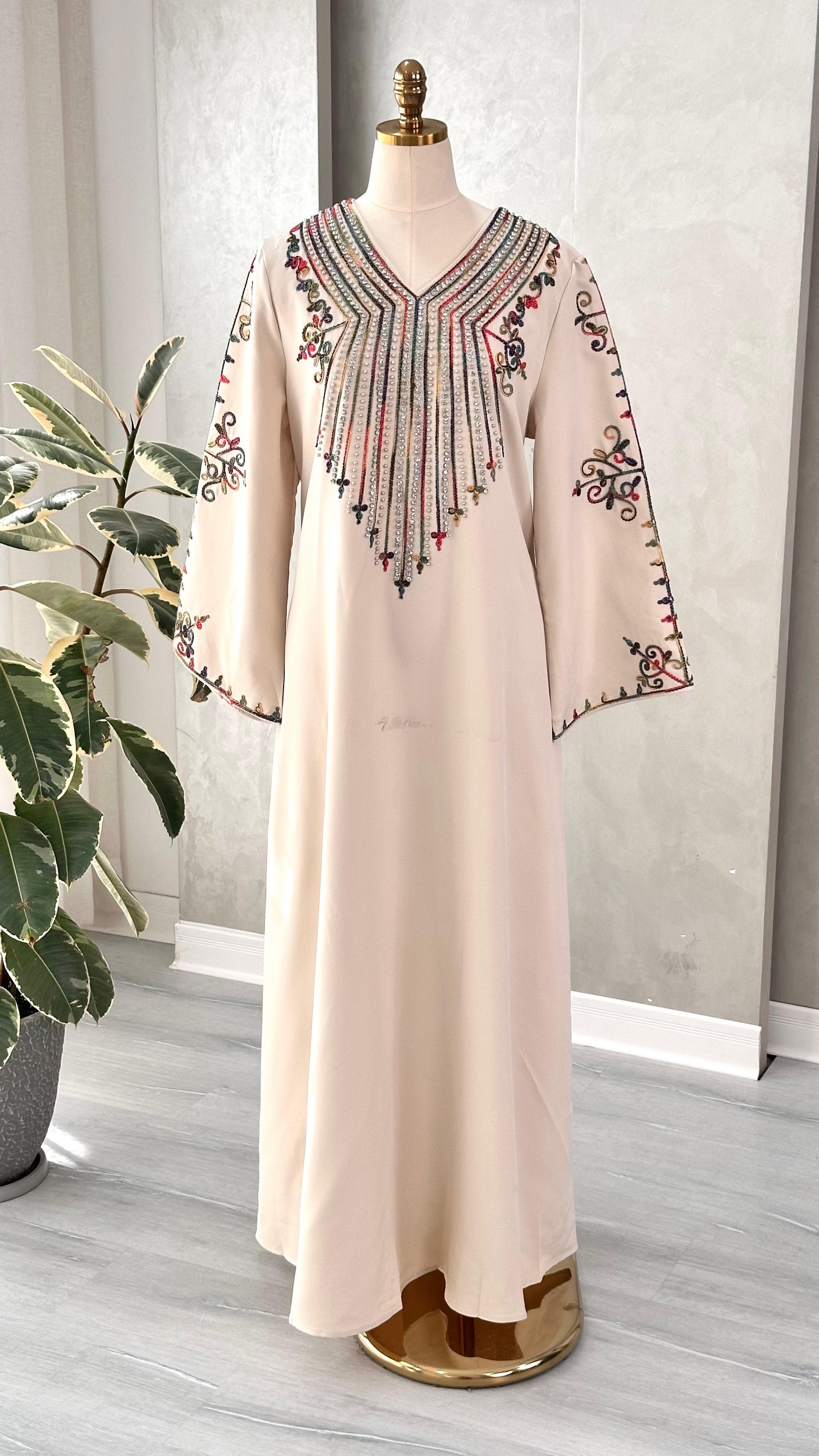 التطريزات متعددة الألوان وتُشكل أنماطًا هندسية وزهرية، وتظهر أيضًا على أطراف الأكمام الواسعة التي تنسدل بحرية، مما يعزز الطابع التراثي للفستان. الأكمام نفسها طويلة وعريضة، وتمنح التصميم حضورًا مميزًا.