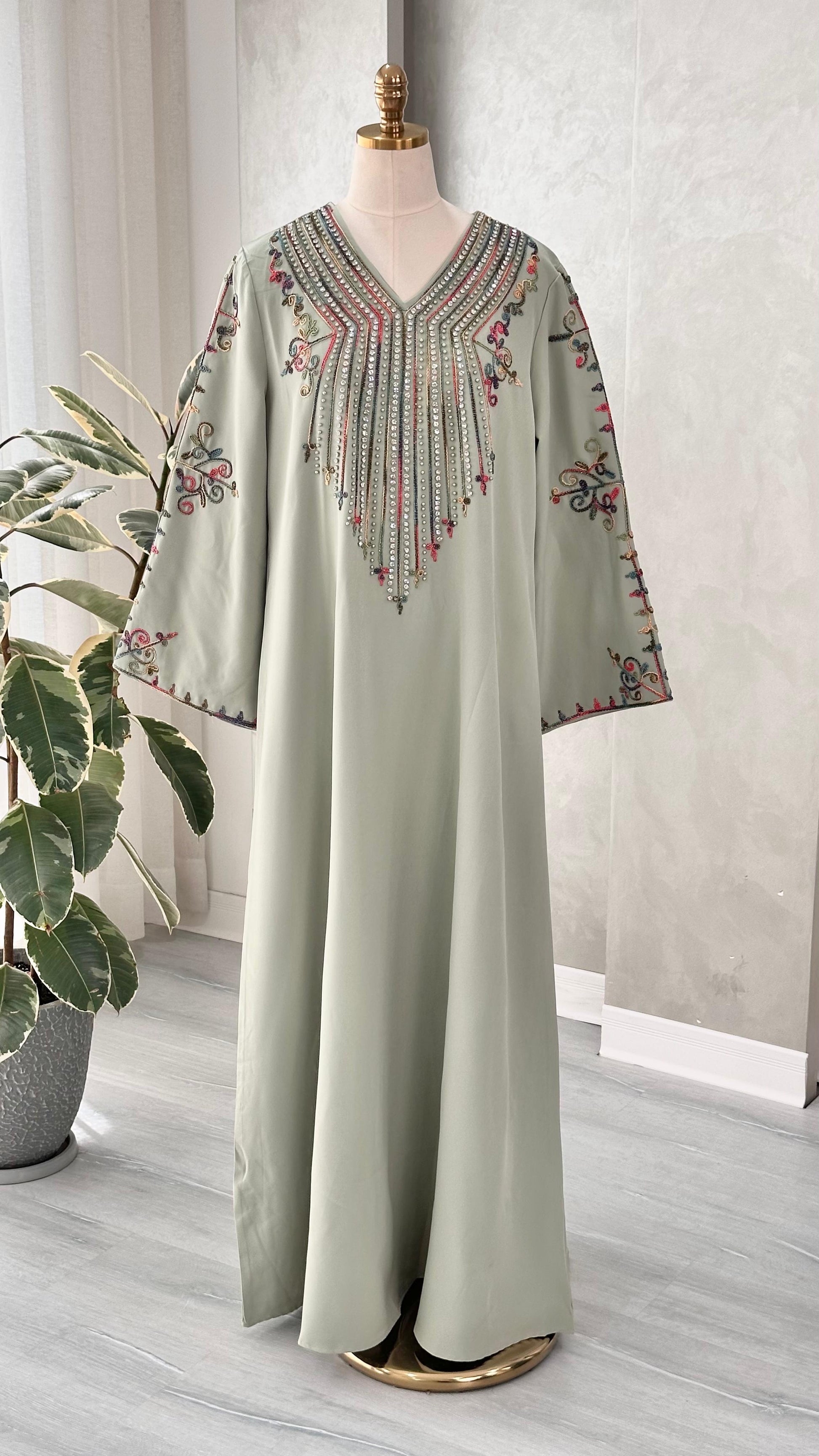 الفستان طويل بتصميم تقليدي، يمتد حتى الأرض، ويتميز بقماش ناعم وانسيابي يمنحه مظهرًا مريحًا وأنيقًا. فتحة الرقبة على شكل حرف V، مزينة بتطريزات دقيقة تمتد بشكل متماثل نحو الكتفين، وتُضفي طابعًا فنيًا متقنًا على الجزء العلوي من الفستان.