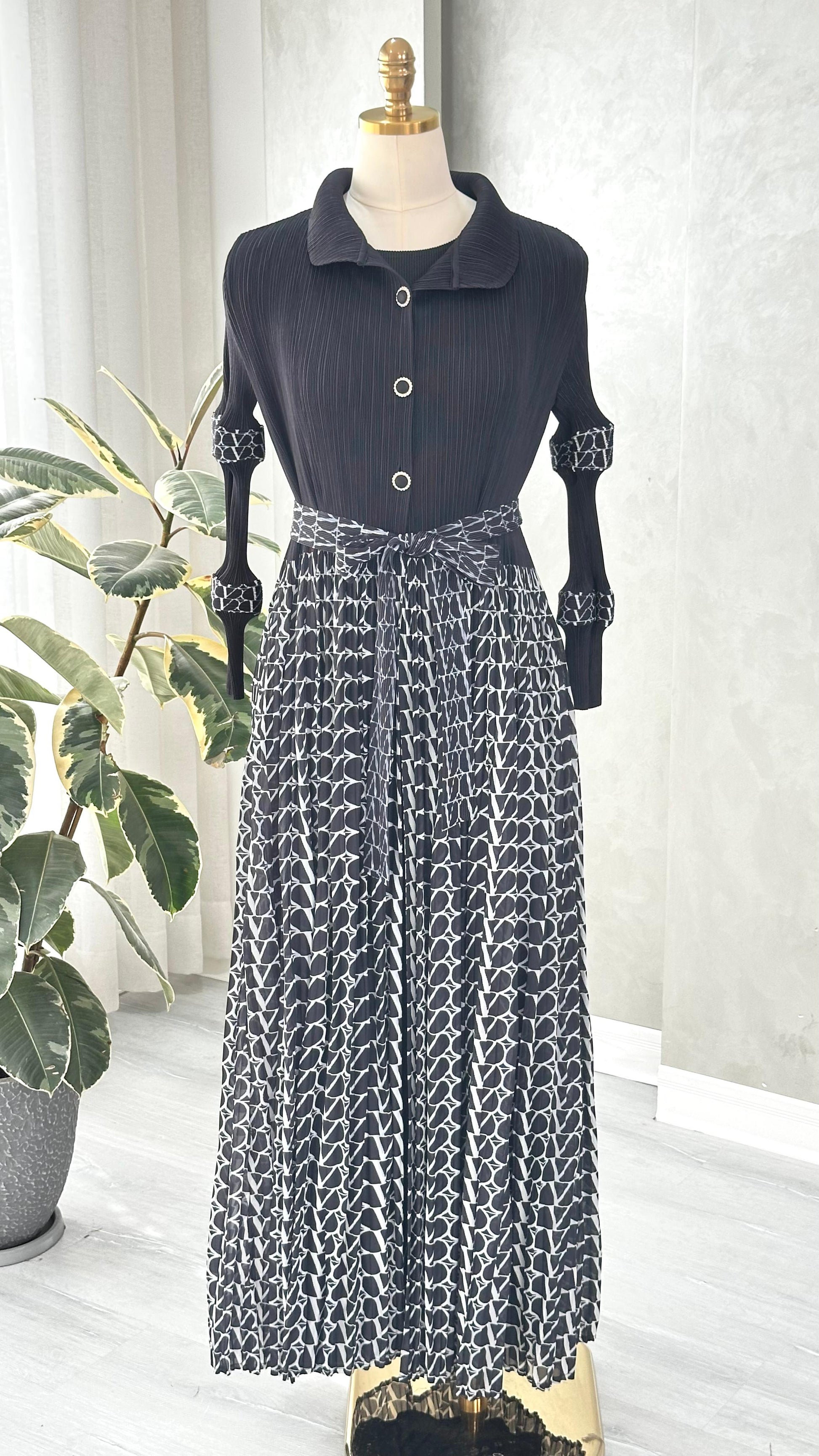 - **التنورة**: تنسدل حتى الأرض، مزينة بنمط هندسي متكرر يغطي الجزء السفلي فقط، مما يخلق تبايناً بصرياً جذاباً مع الجزء العلوي السادة. القصة واسعة قليلاً وتسمح بالحركة بسلاسة.
