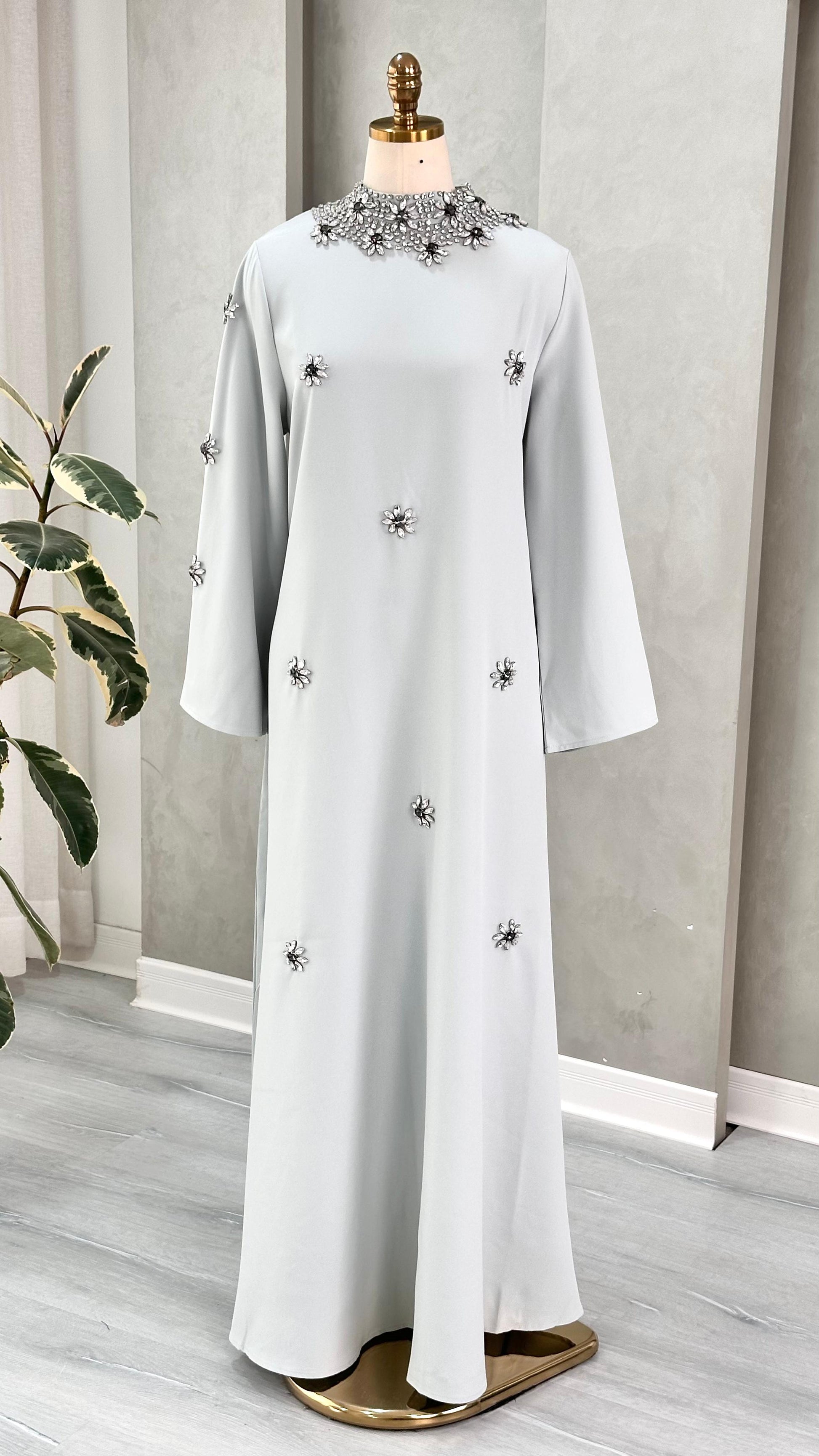 الفستان طويل ذو تصميم محتشم، يتميز بياقة مرتفعة مزينة بتطريزات دقيقة على شكل زهور متقنة الصنع. تمتد هذه الزخارف بشكل متناثر ومنسق على الجزء الأمامي من الفستان وكذلك على الأكمام، مما يضفي عليه طابعًا أنيقًا ومفعمًا بالتفاصيل.