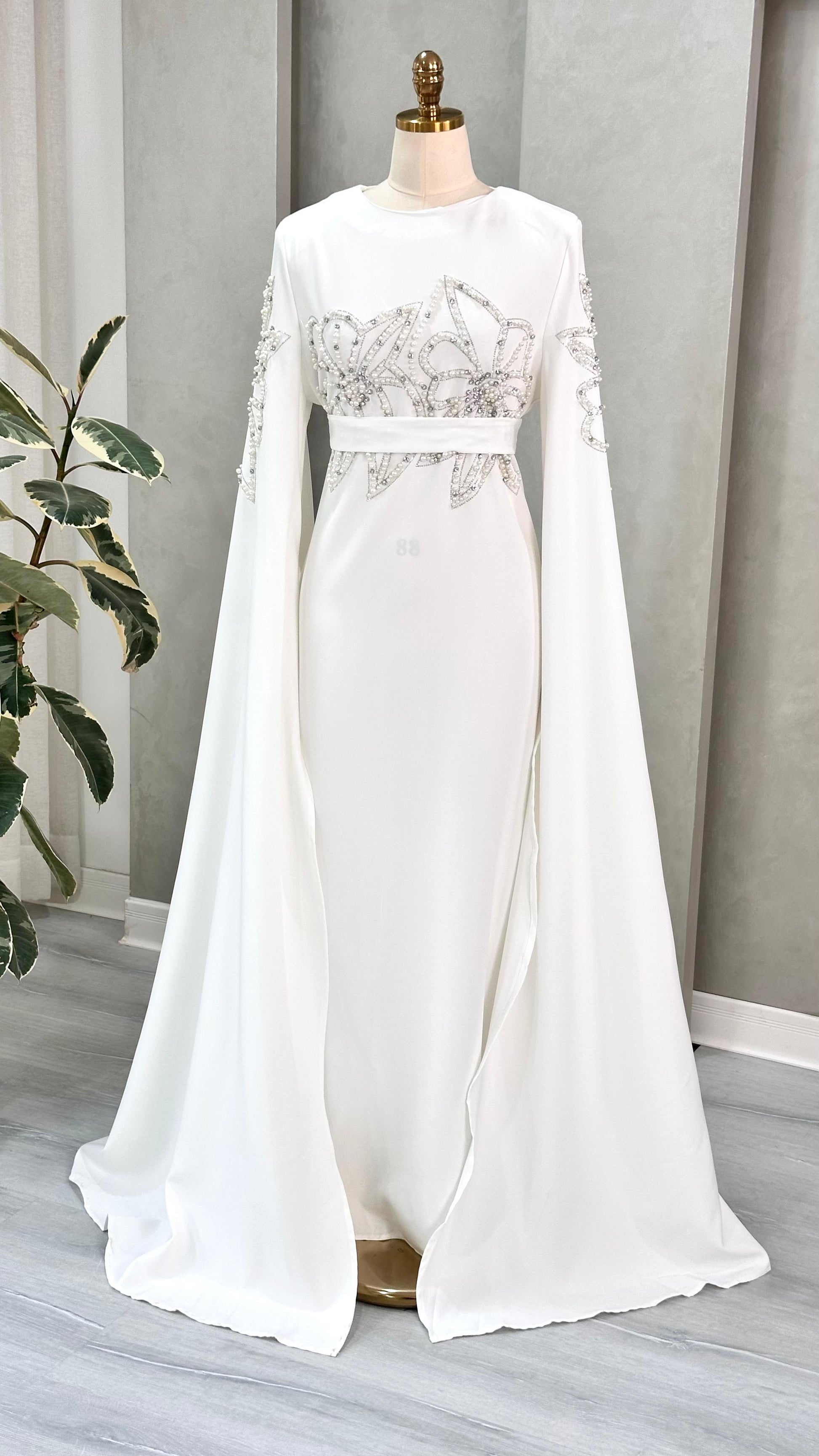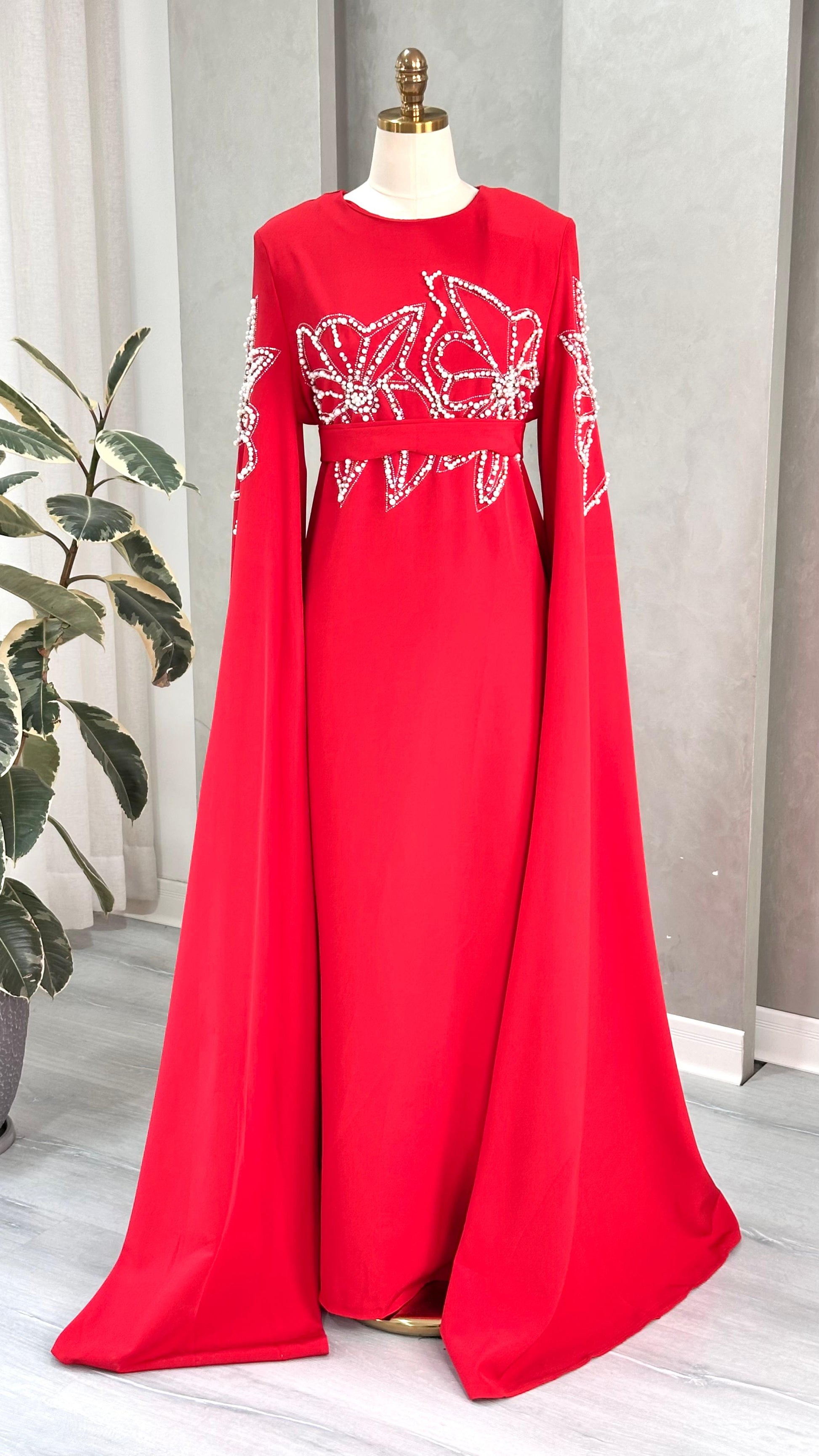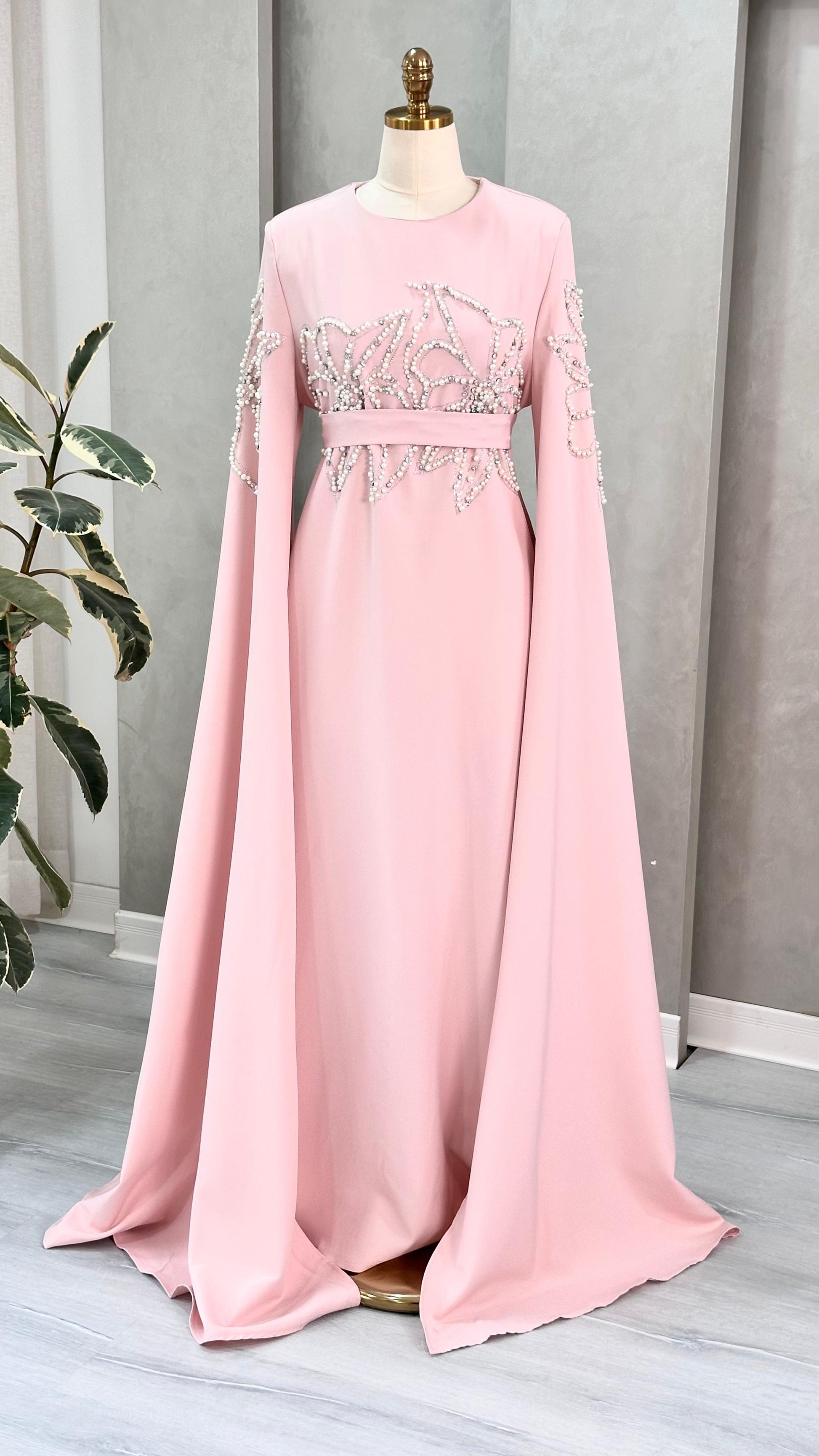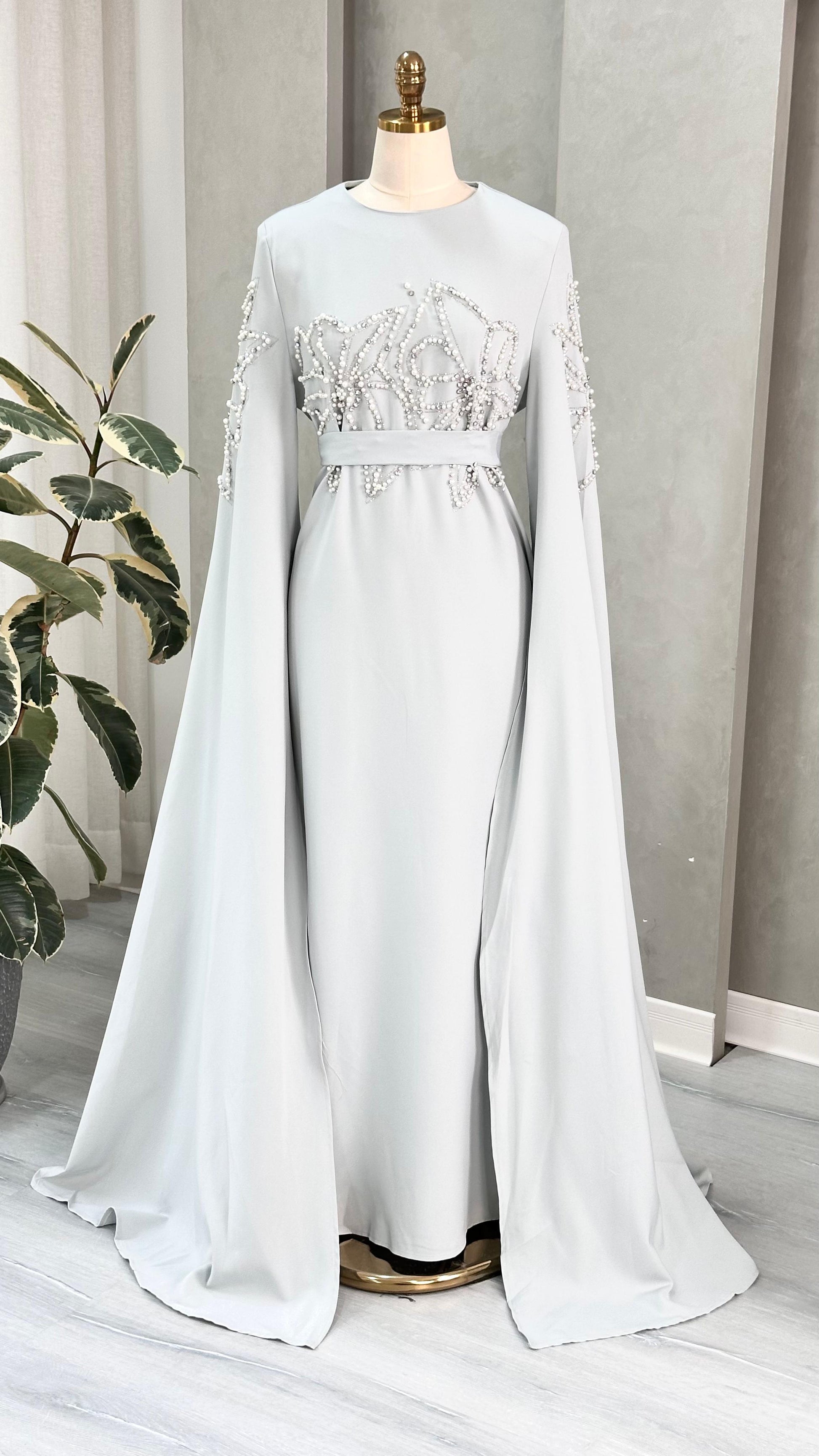 الفستان طويل وذو تصميم فاخر، يتميز بياقة مرتفعة وأكمام واسعة تنسدل حتى الأرض بأسلوب يشبه الكاب، مما يمنحه حضورًا ملكيًا. الجزء العلوي مزين بتطريزات دقيقة على شكل زخارف نباتية أو تجريدية، تمتد على الصدر والأكمام بشكل متناظر، وتضفي لمسة براقة على القماش.