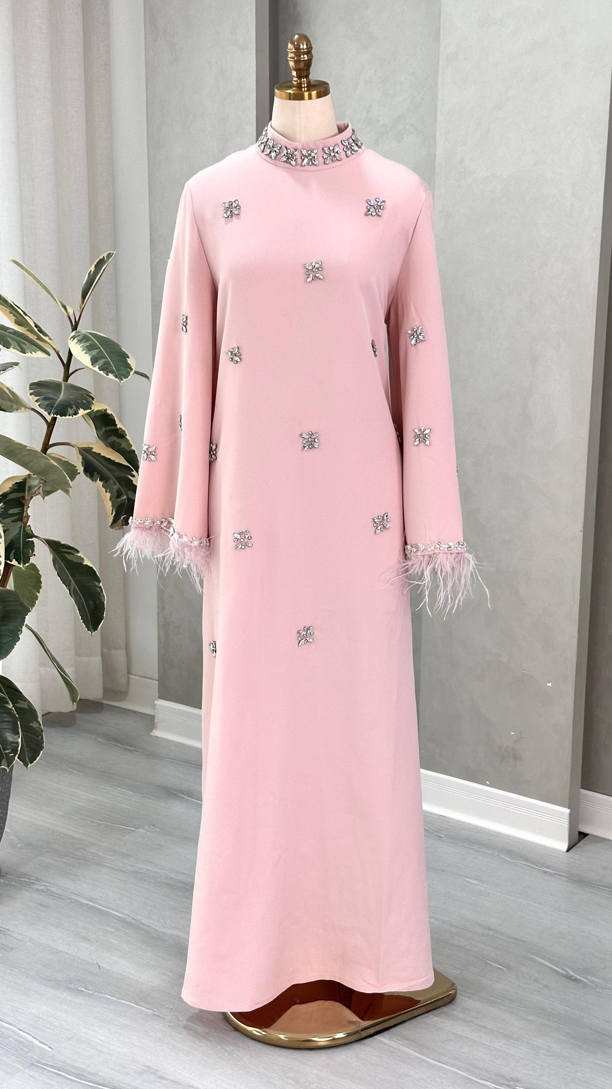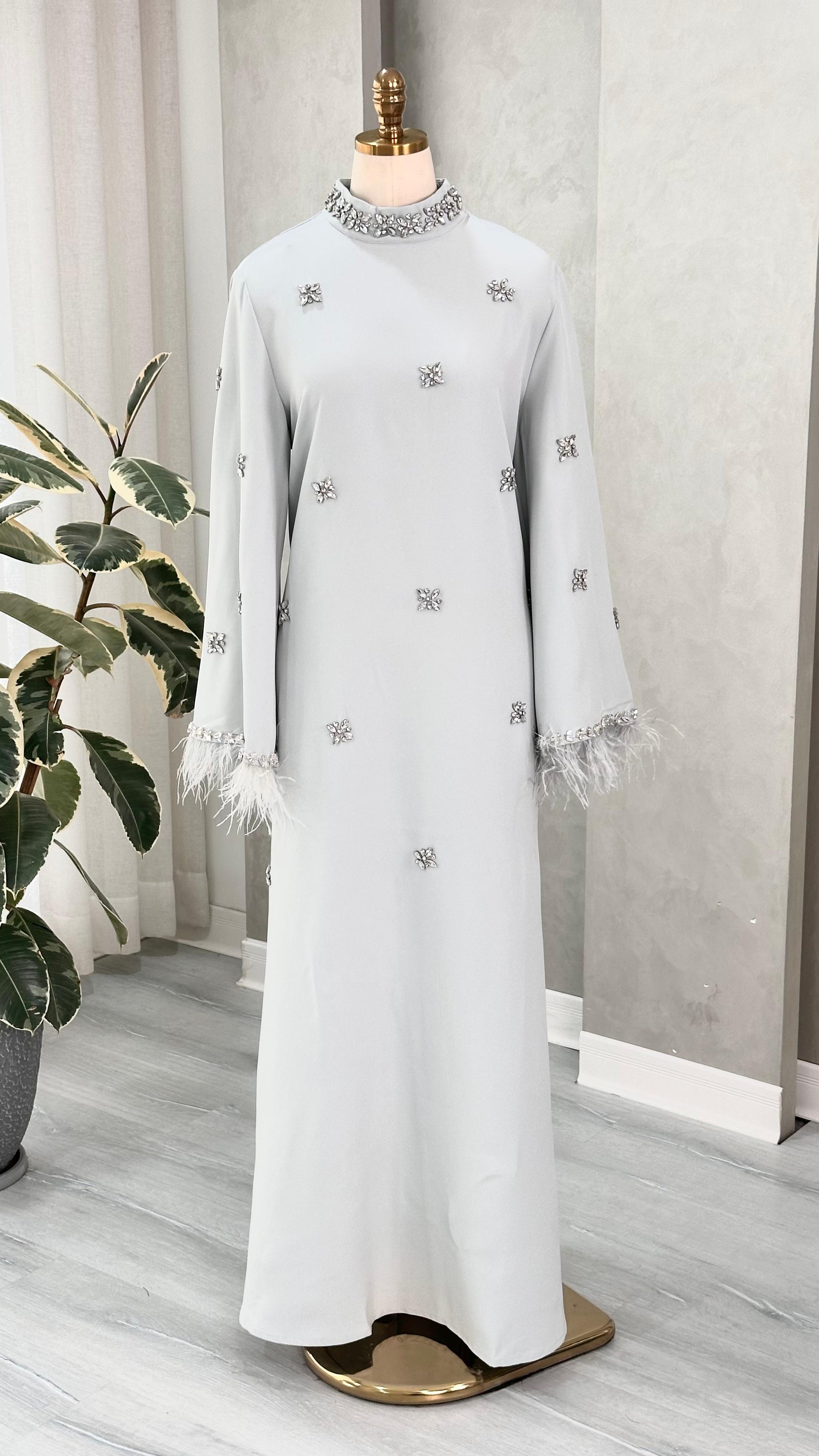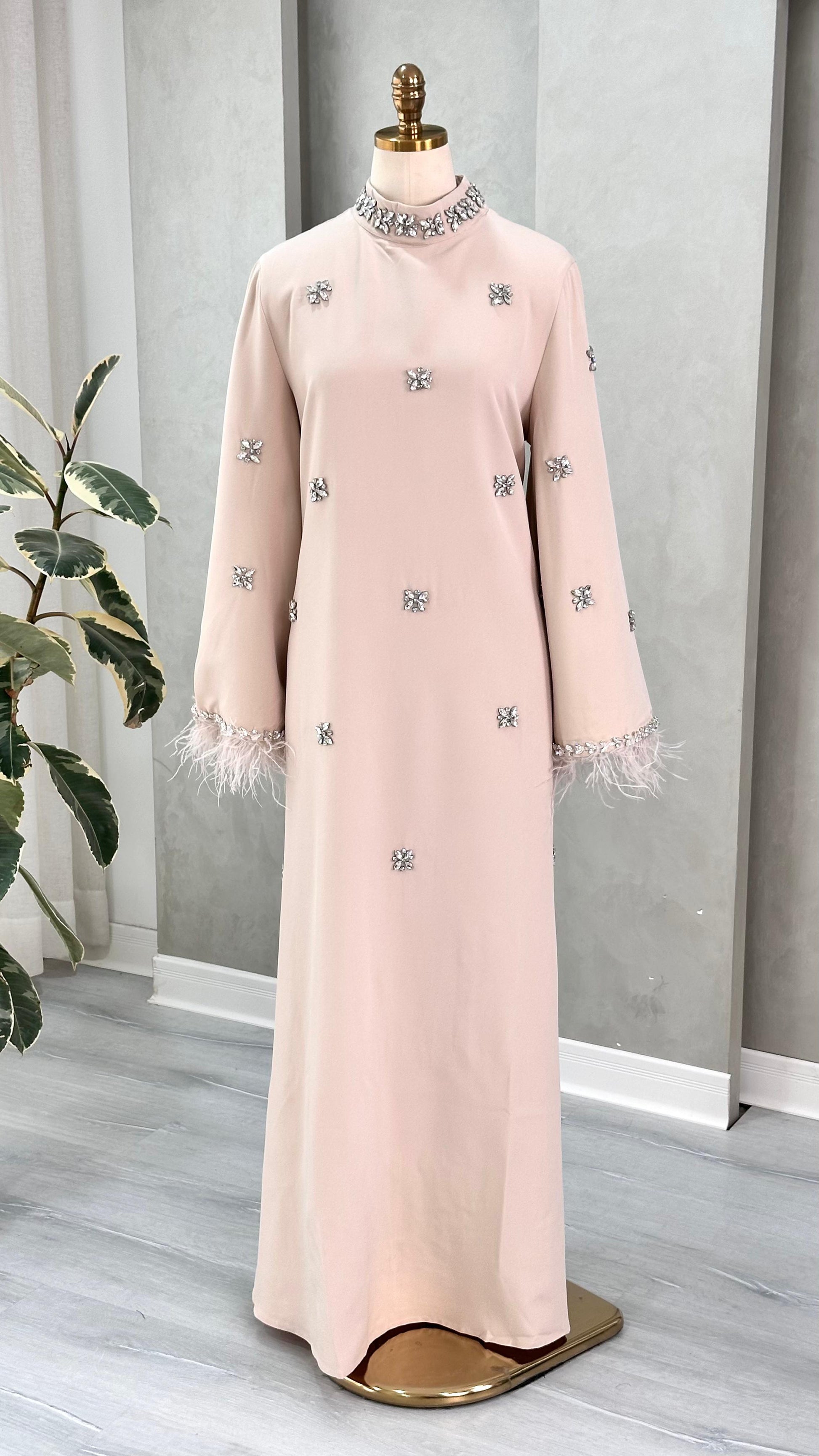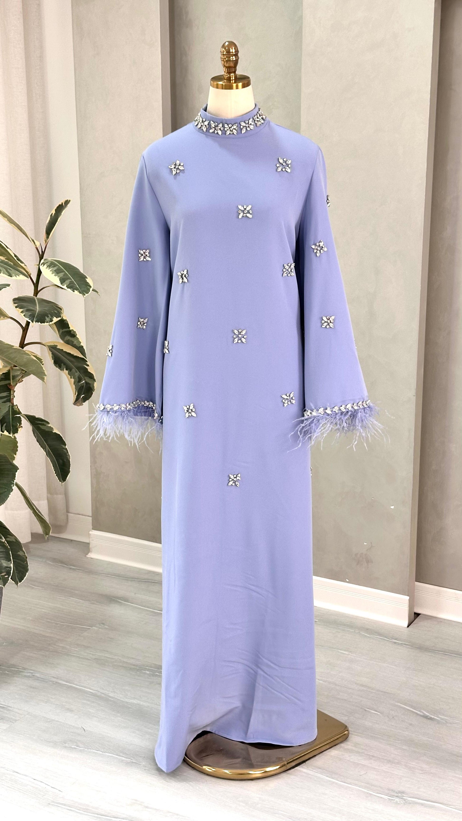 الأكمام واسعة وتنتهي بحافة مزينة بخامة ريشية ناعمة، تضيف ملمسًا فاخرًا وحركة خفيفة عند الأطراف. التصميم بالكامل يمتد حتى الأرض، ويعكس بساطة راقية ممزوجة بتفاصيل فنية دقيقة، ما يجعله مناسبًا للإطلالات الرسمية والمناسبات الرفيعة.