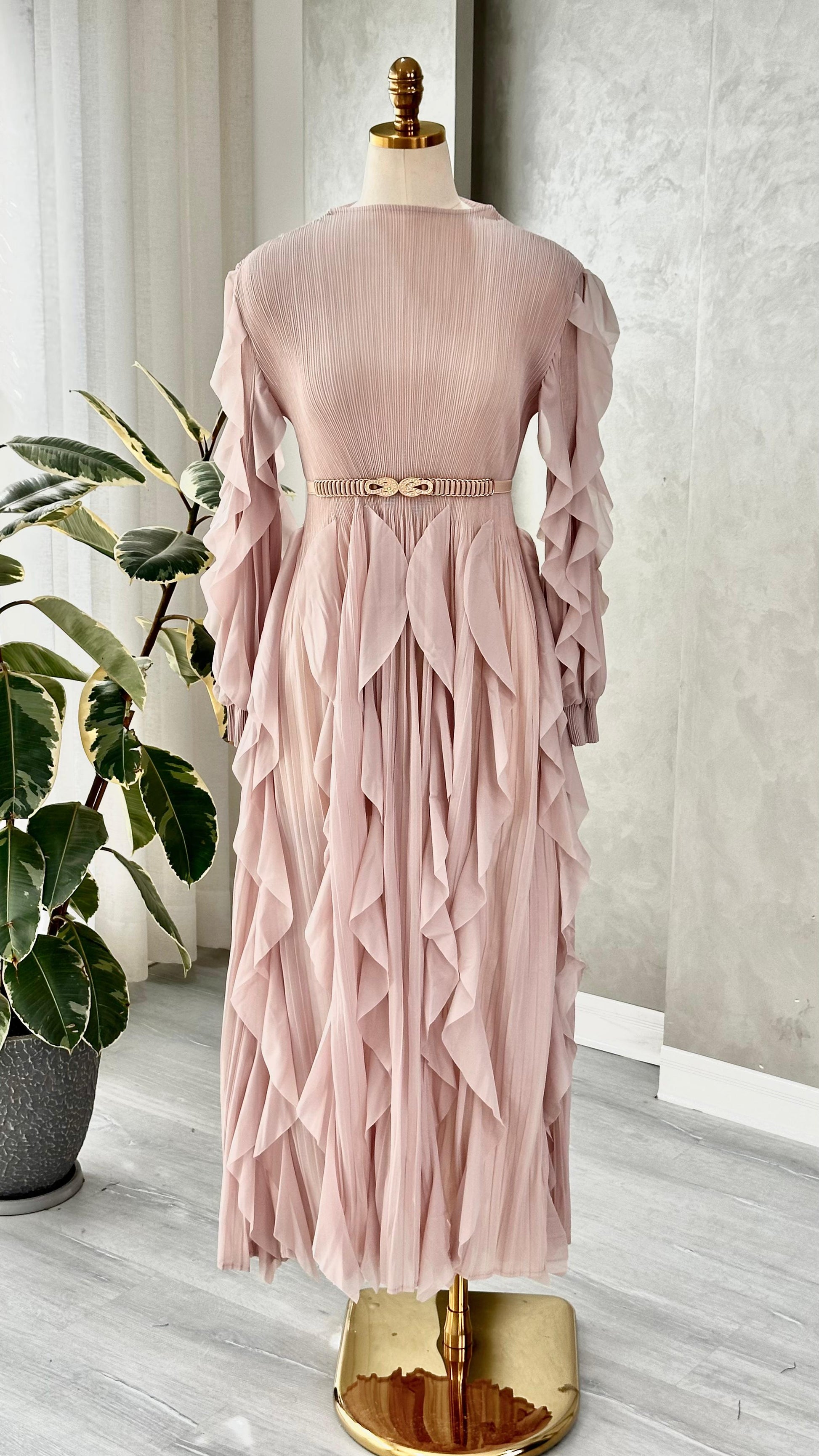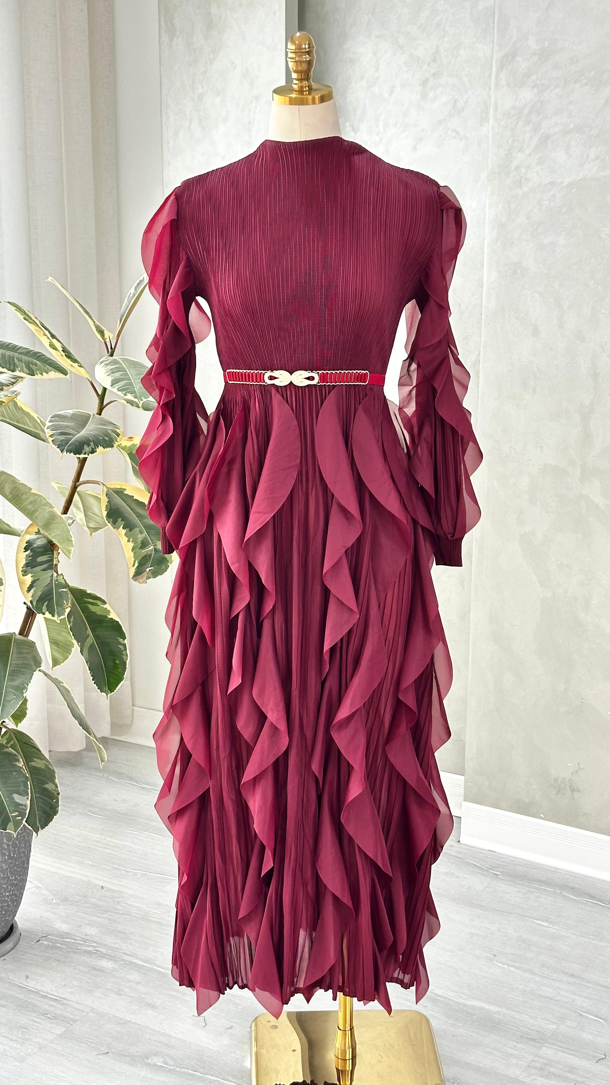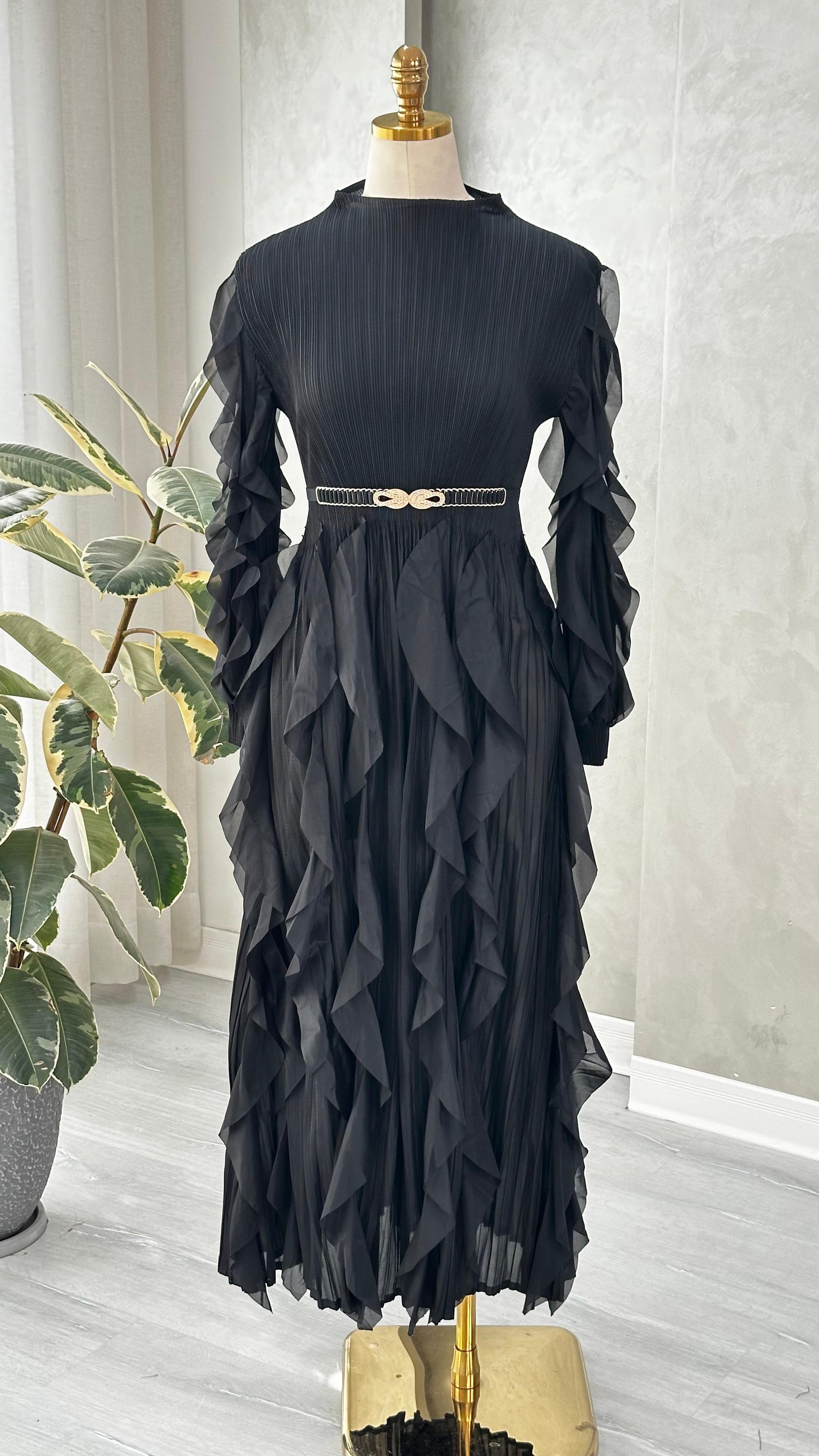الفستان متوسط الطول ويتميز بياقة عالية تضفي عليه طابعًا رسميًا أنيقًا. القماش مزين بثنيات طولية دقيقة تغطي كامل التصميم، مما يمنحه ملمسًا غنيًا وحركة انسيابية. الأكمام طويلة وتزينها طبقات كشكش متدرجة تنسدل من الكتف حتى المعصم، وتستمر هذه التفاصيل المتدرجة أيضًا على التنورة، مما يضيف حجماً بصريًا وتفاصيل ديناميكية.