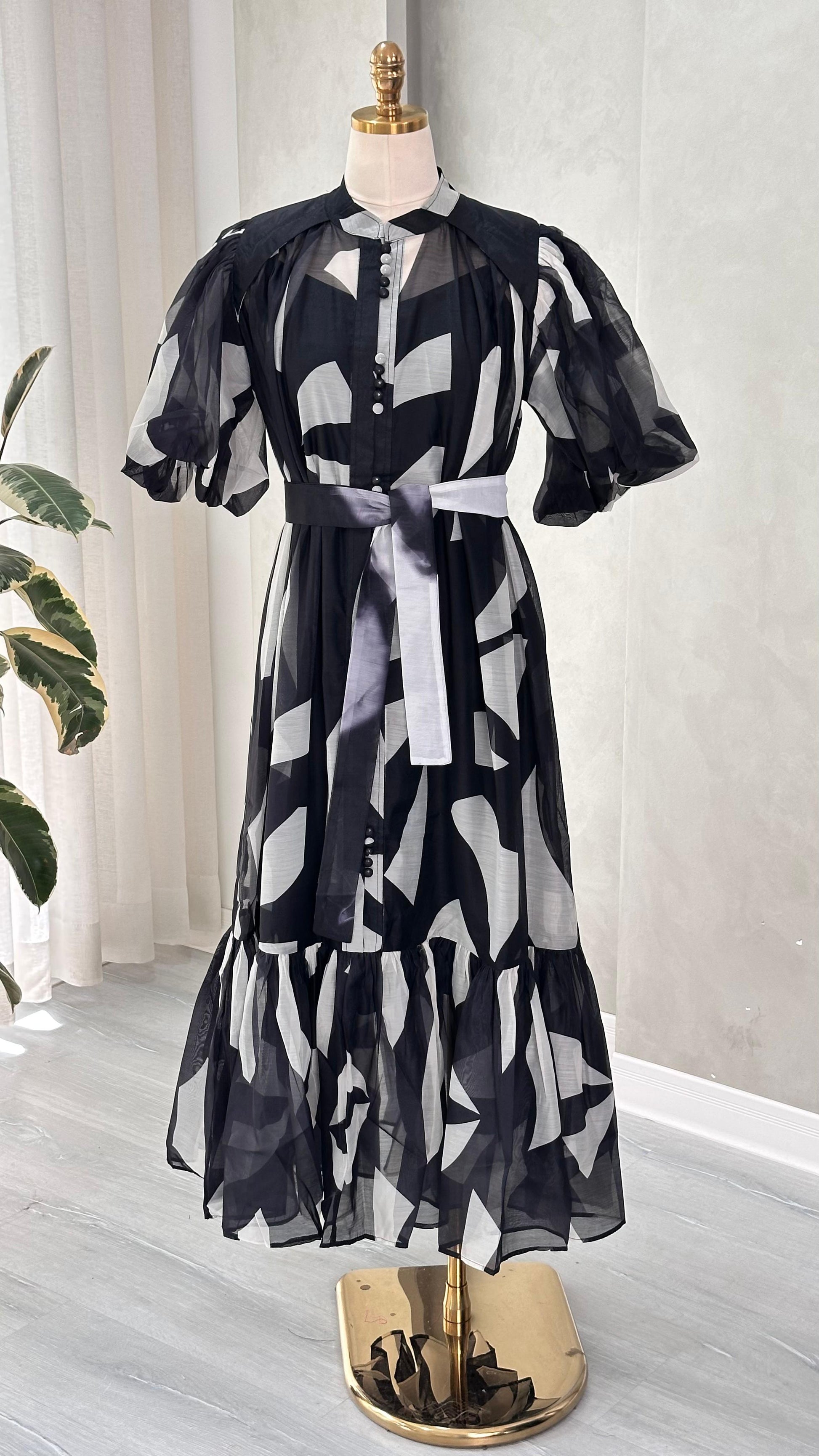 الفستان يتميز بتصميم أنيق وطابع كلاسيكي. قصته مستقيمة وطولها يصل حتى الأرض، مما يمنحه مظهراً انسيابياً ومتناسقاً. الجزء العلوي مزود بياقة رسمية وأكمام طويلة، مع صف أزرار يمتد من أعلى الصدر حتى منطقة الخصر. الخصر محدد بخياطة واضحة تبرز شكل الجسم، بينما الجزء السفلي ينزل بانسيابية دون تفاصيل إضافية، ما يعزز البساطة والرقي في التصميم. الفستان يبدو كقطعة واحدة متكاملة تجمع بين الطابع الرسمي والأنوثة الهادئة.
