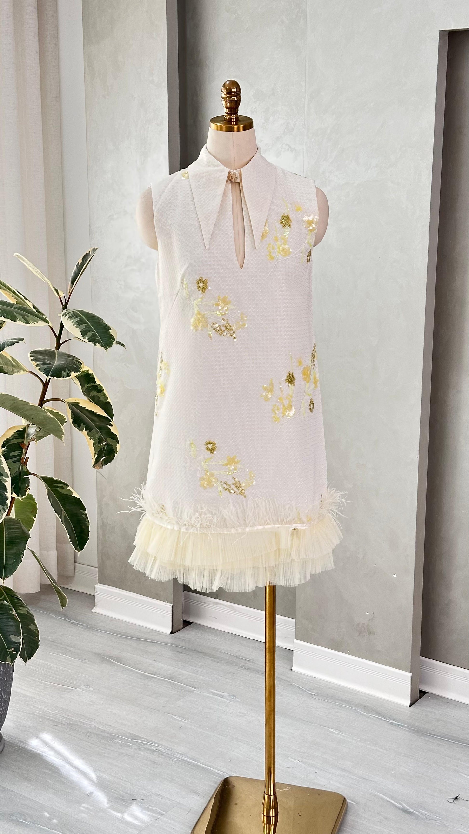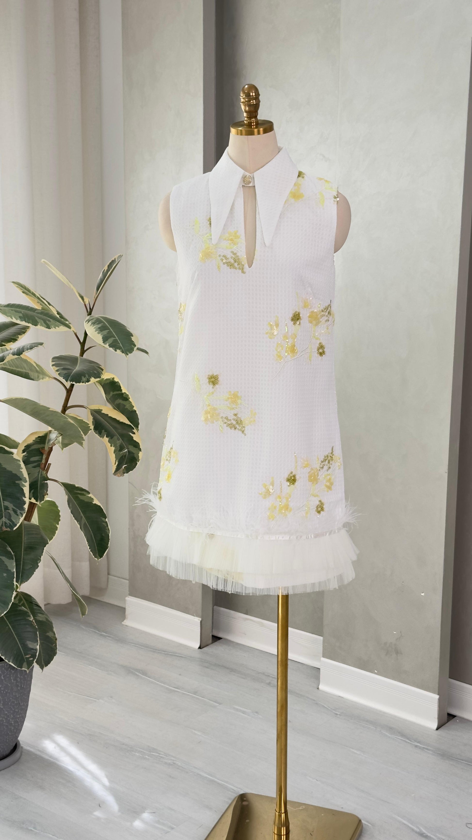 الفستان بلا أكمام ويتميز بياقة مدببة أنيقة مع فتحة صغيرة عند الصدر تضيف لمسة ناعمة للتصميم. يزين الجزء الأمامي تطريز نباتي متناثر على شكل زهور، يمنح الفستان طابعًا حيويًا ومفعمًا بالتفاصيل.