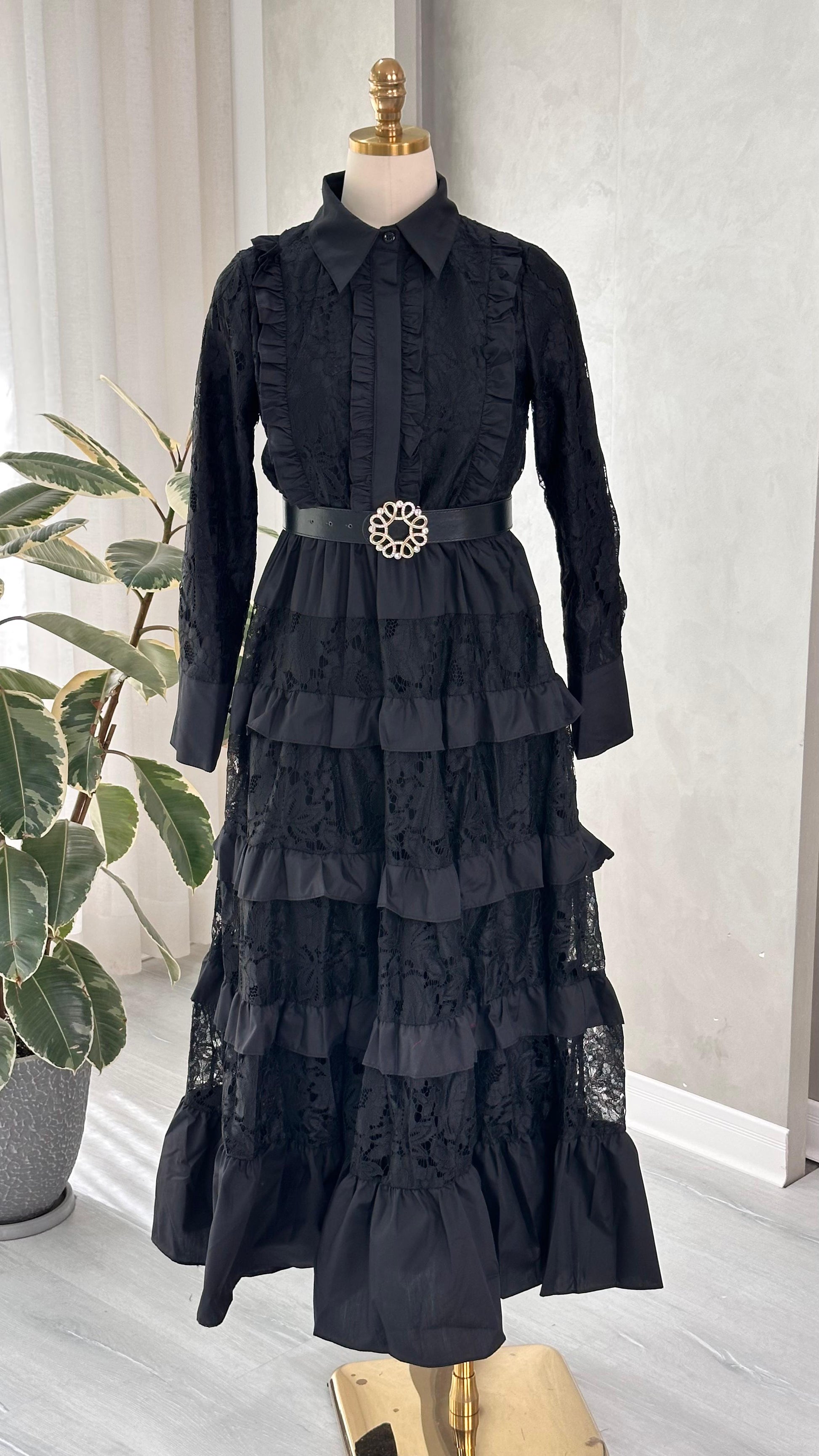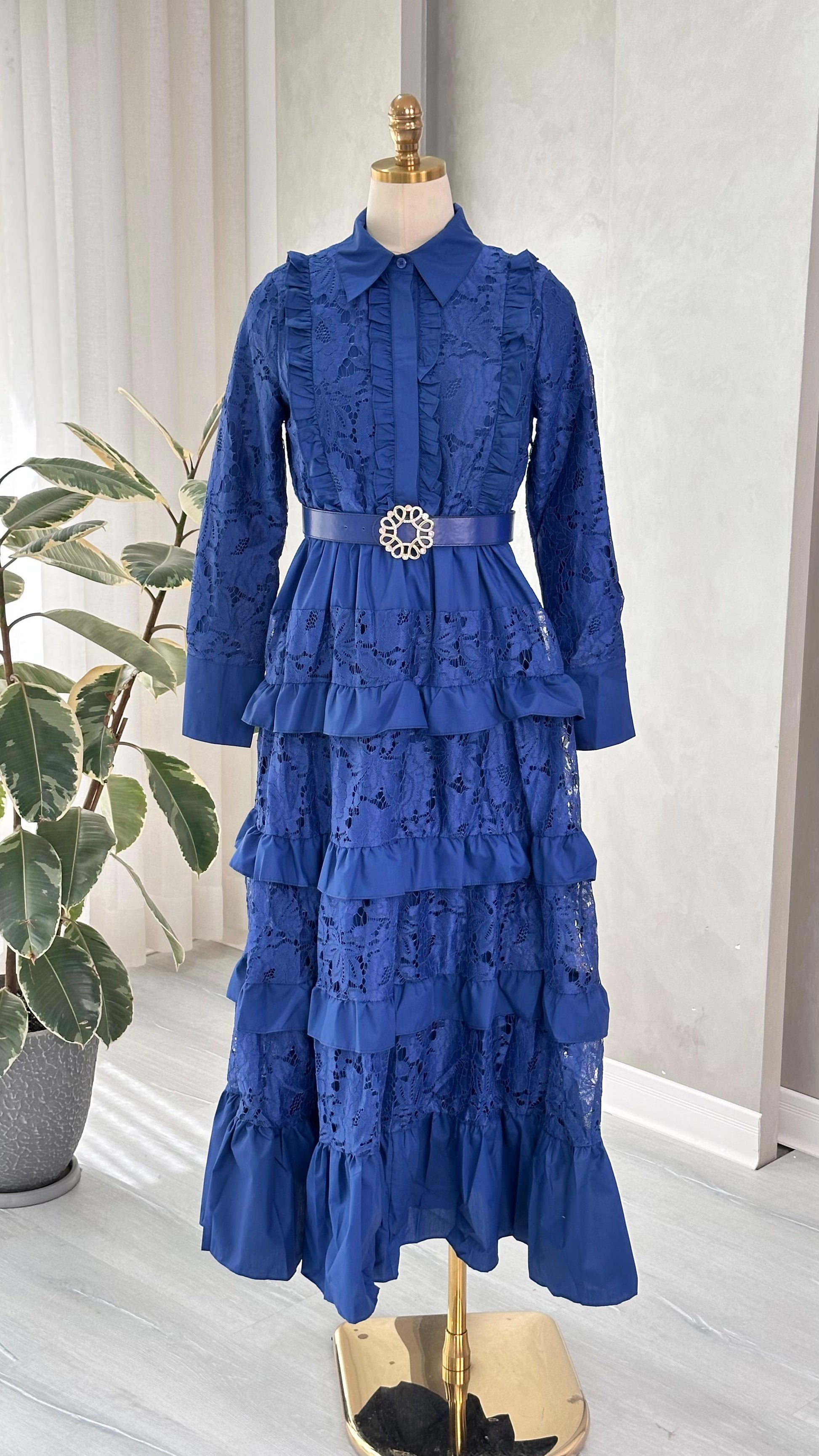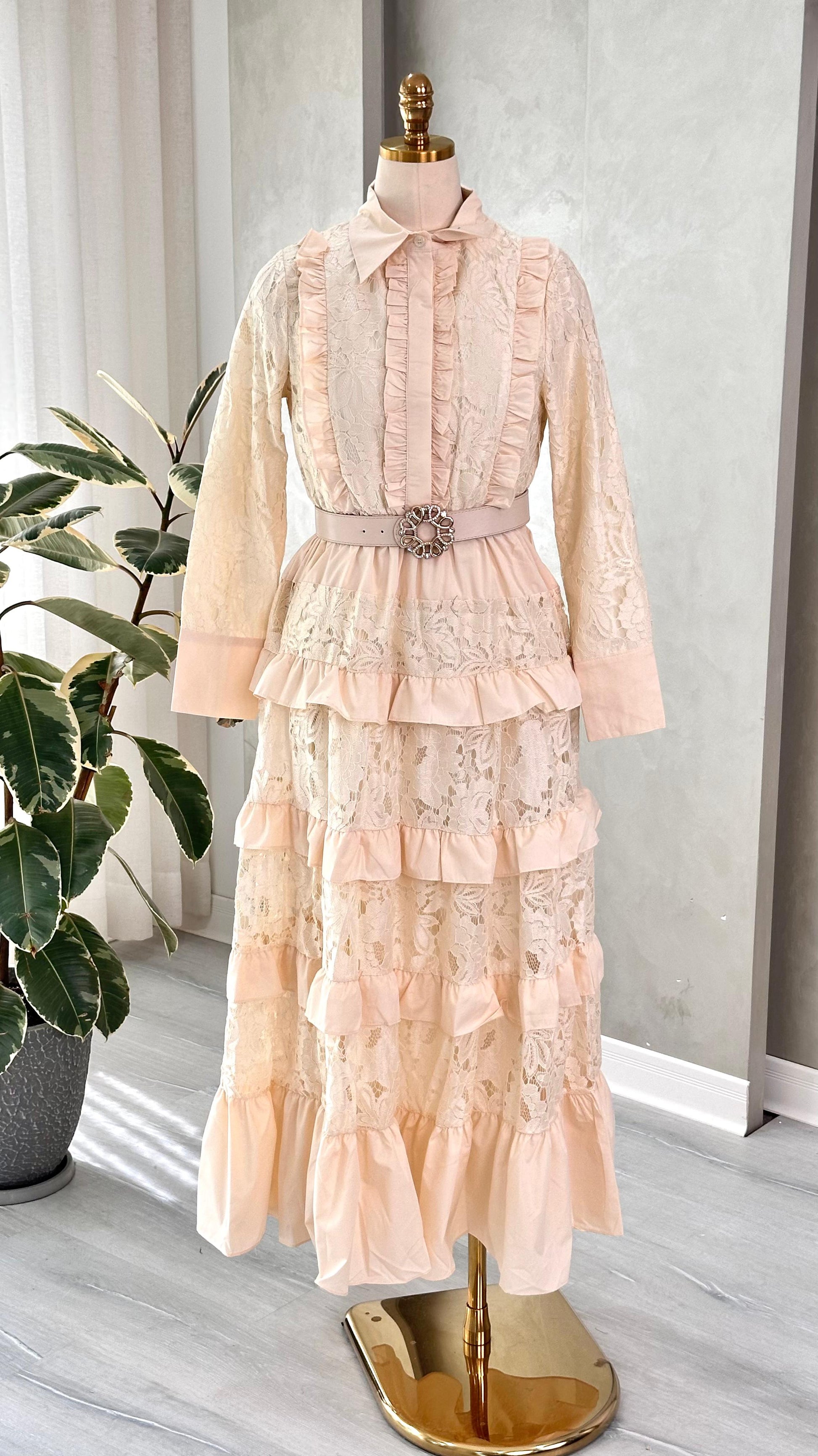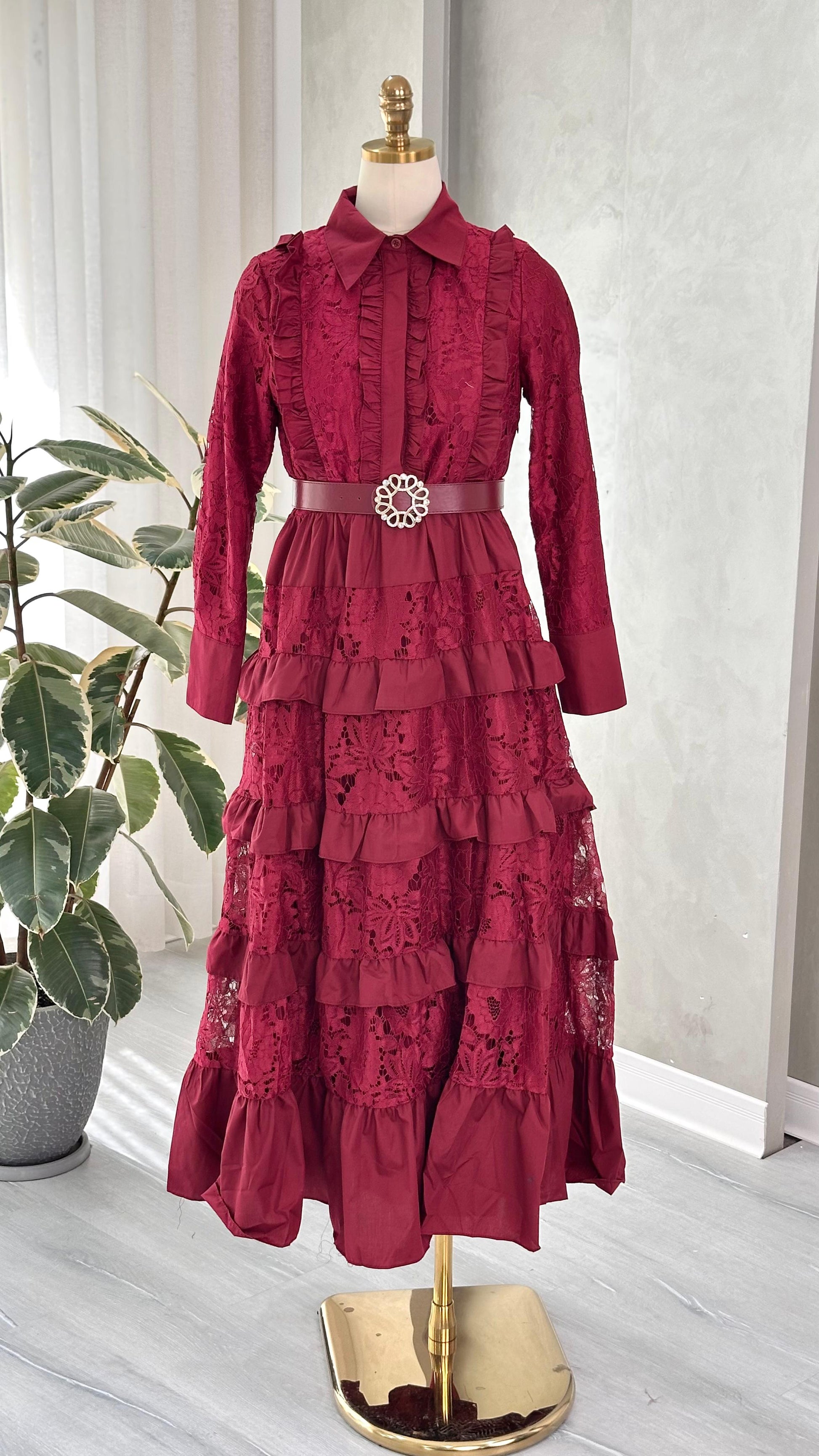 الفستان مصنوع من قماش الدانتيل الغني بالتفاصيل، ويتميز بأكمام طويلة شفافة من نفس الخامة، تضيف لمسة أنثوية ناعمة. يحيط بالرقبة فتحة على شكل V مزينة بحافة دانتيل مزخرفة، تعزز من أناقة التصميم. الجزء العلوي من الفستان مصمم بشكل ضيق ليبرز الخصر، ويكتمل بحزام من نفس القماش مزود بمشبك معدني مربع الشكل.