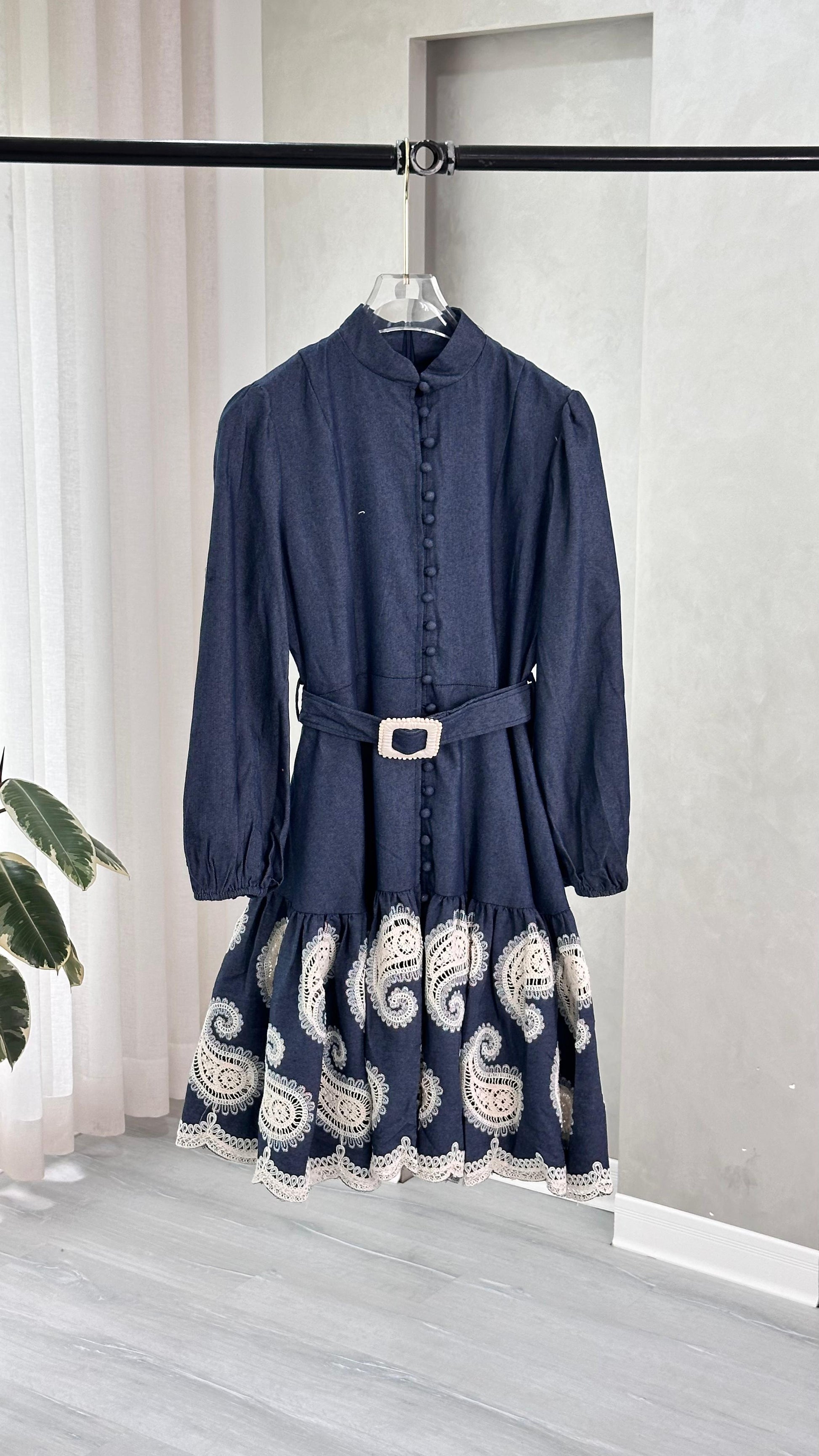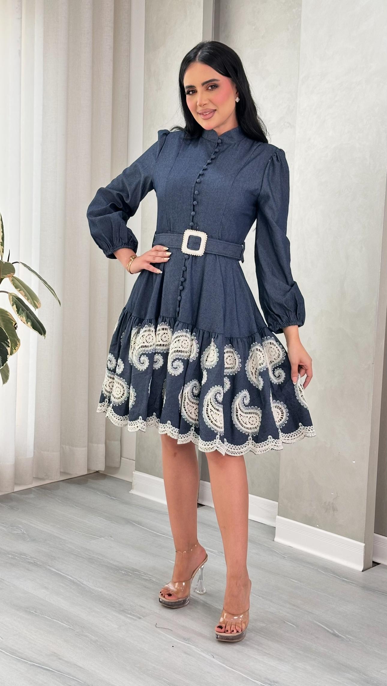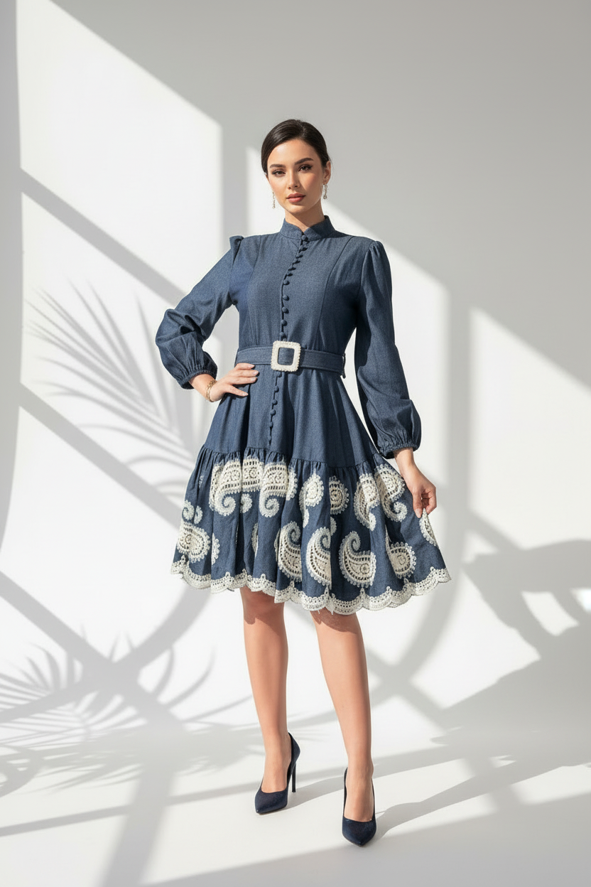 فستان قصير بتصميم "A-line" ينساب بأناقة ويمنح قصة مريحة وأنيقة في آن واحد. مصنوع من خامة ذات جودة عالية توفر ملمساً ناعماً ومظهراً متماسكاً. يتميز الفستان بأكمام طويلة بـ "أساور" واسعة ومطوية، وفتحة صدر على شكل قميص مع ياقة كلاسيكية. التفاصيل الأبرز هي الحزام العريض الذي يحدد الخصر، والجزء السفلي الذي يحتوي على طبقات من الكشكشة (Frills) بنمط أو نقش مطبوع يضيف عمقاً وتميزاً للتصميم. هذا الزي مثالي للإطلالات التي تتطلب أناقة فريدة ومفعمة بالتفاصيل.