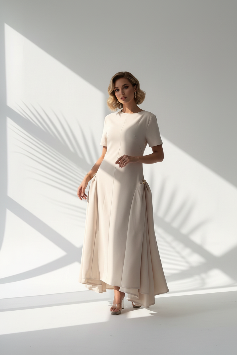 فستان أنيق بتصميم كلاسيكي عصري، يتميز بقصة واسعة وانسيابية تضيف لمسة من الرقي والأنوثة. مزود بأكمام قصيرة لمظهر أنثوي ناعم، مع تفاصيل طيات عمودية تمنح التصميم حركة وجاذبية. مثالي للمناسبات الخاصة والسهرات، ويجمع بين البساطة والفخامة في آن واحد.