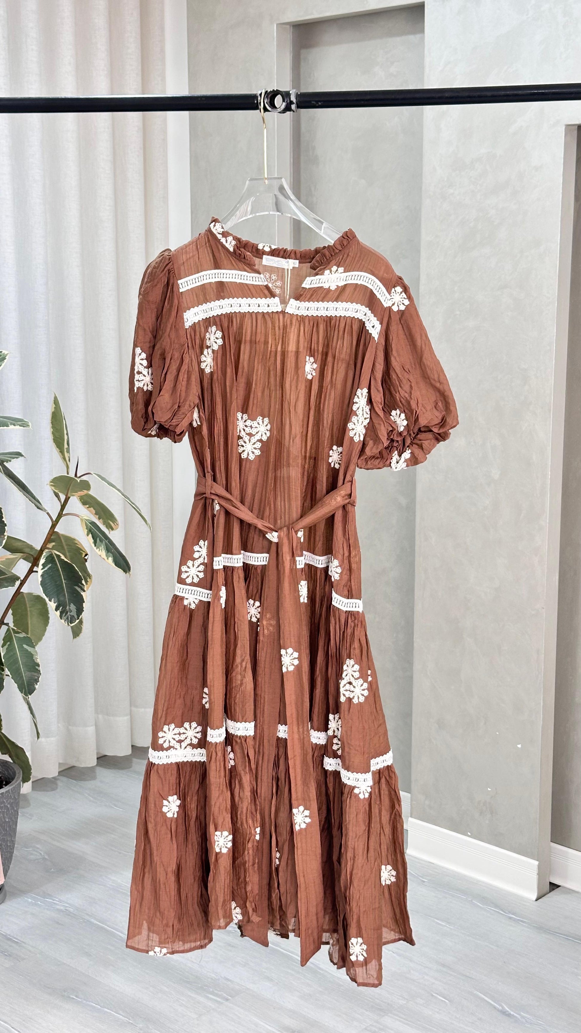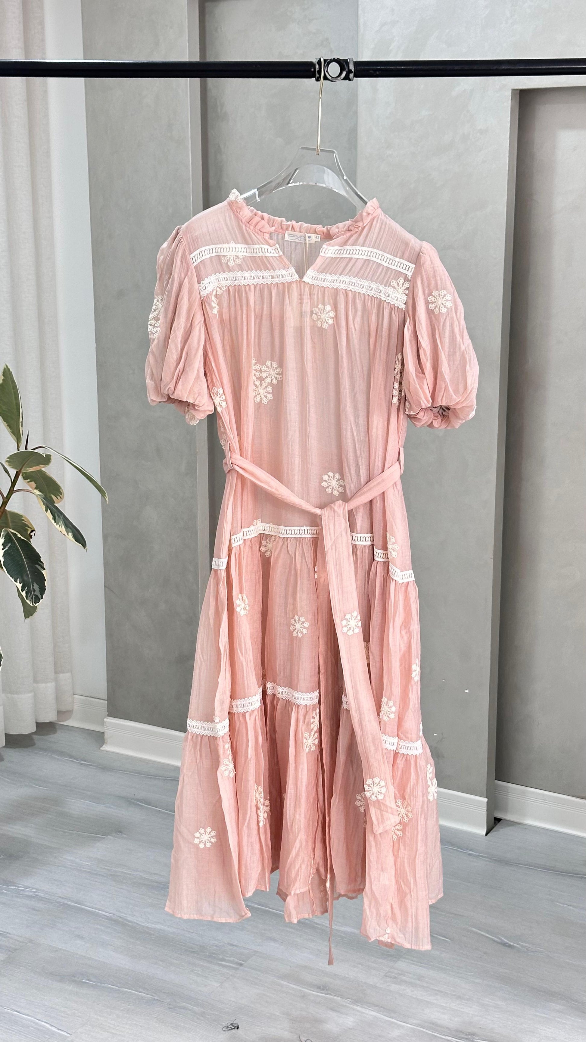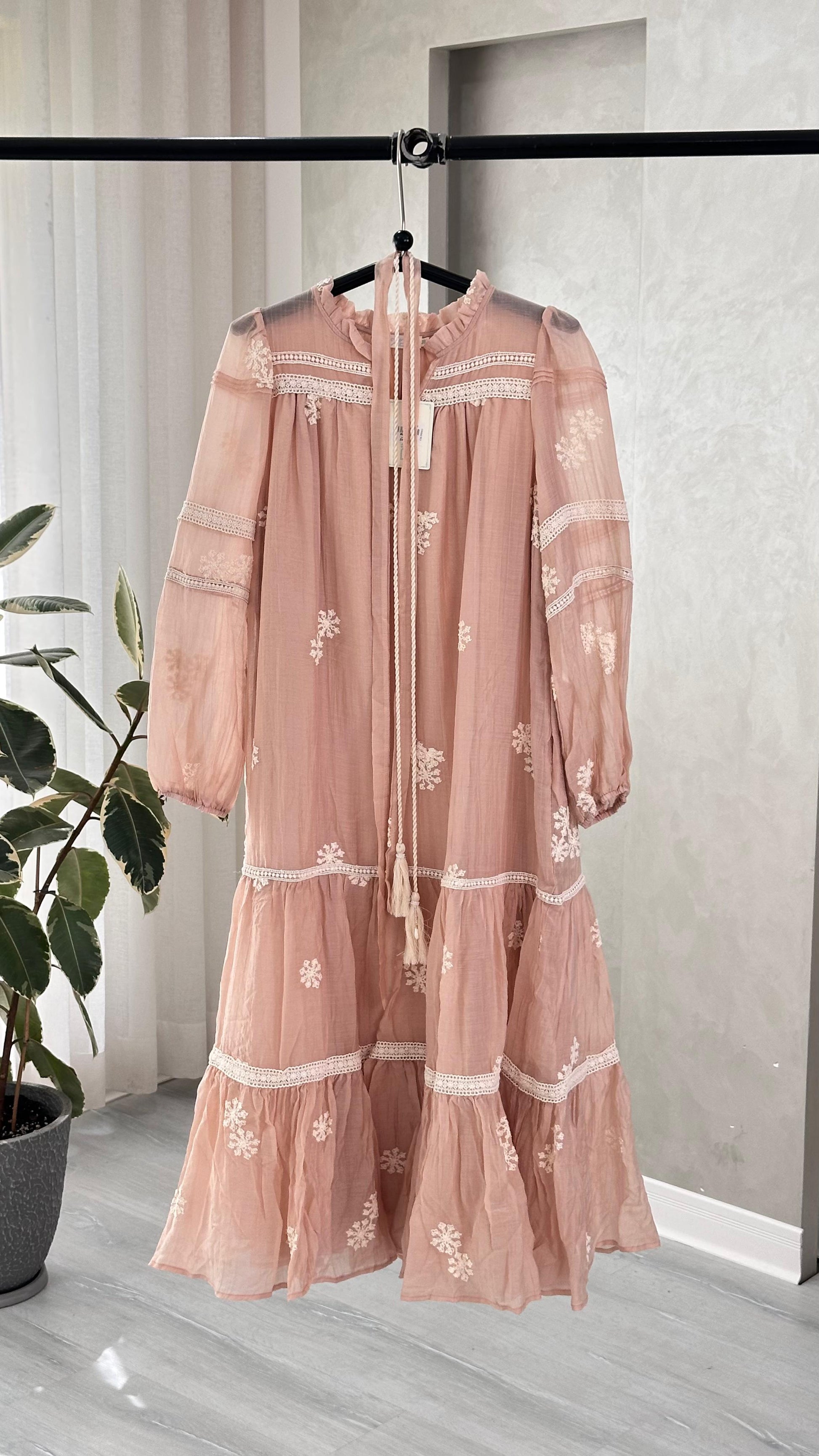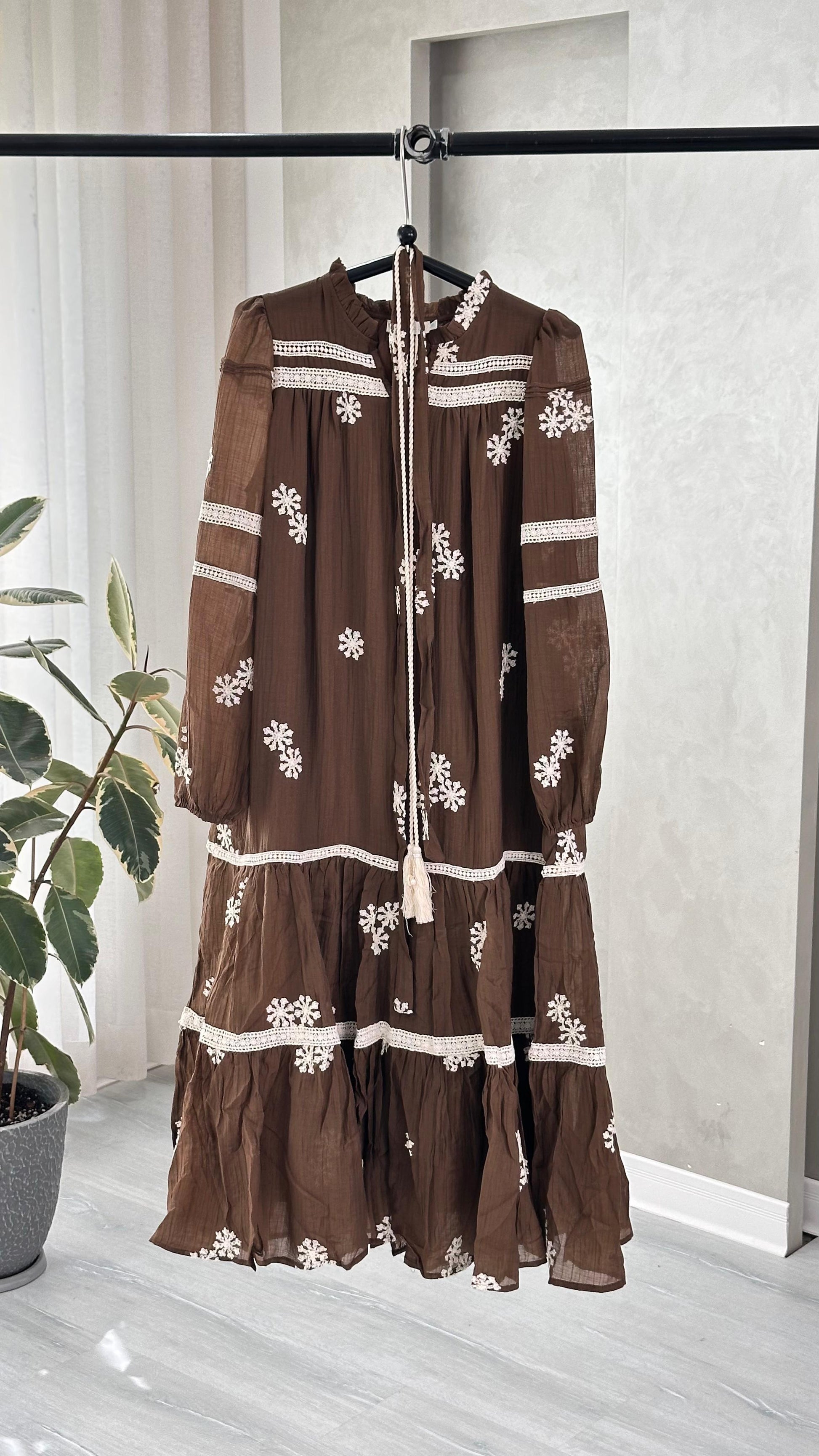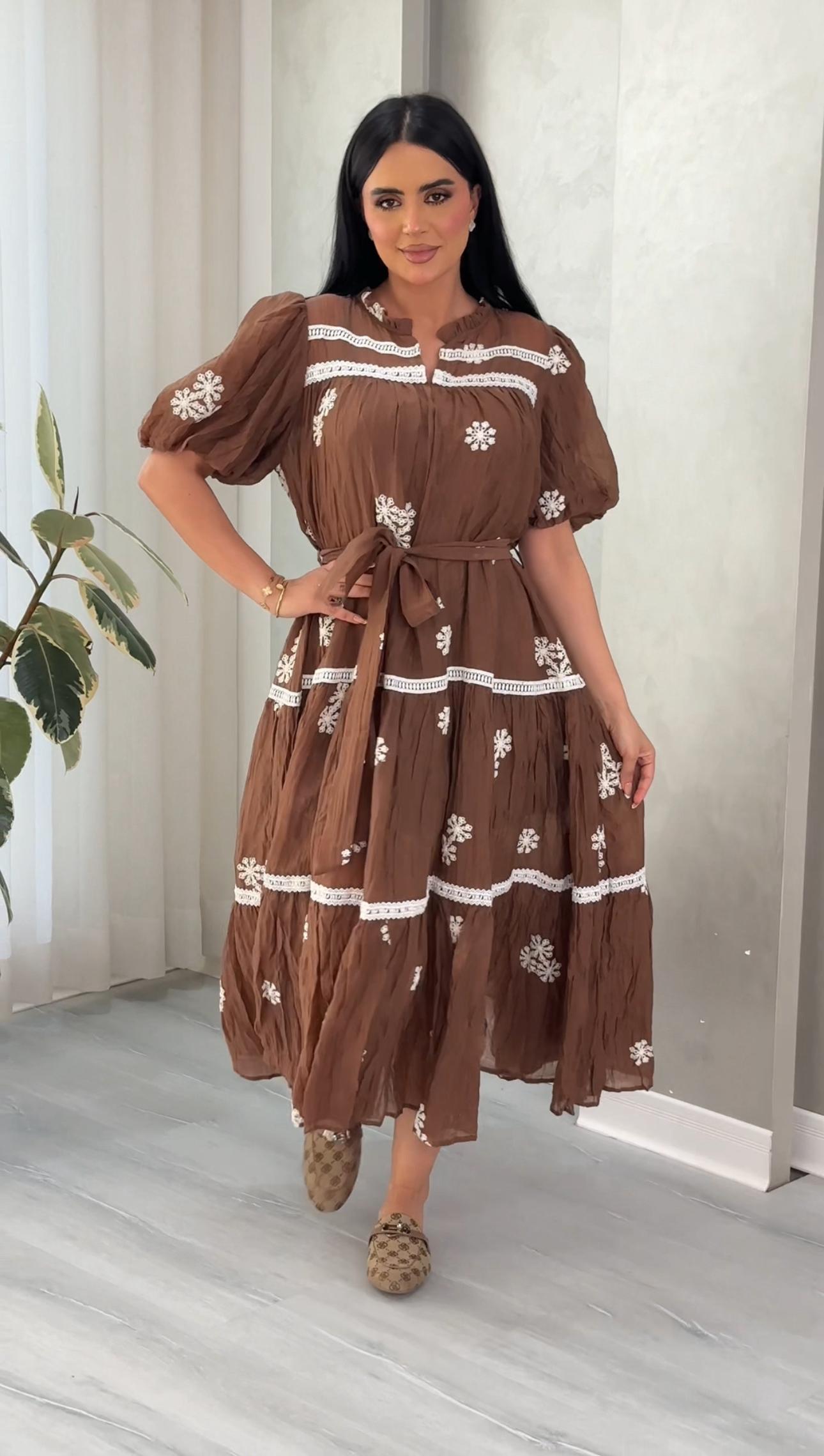 الفستان طويل يصل إلى الكاحل، يتميز بتصميم أنثوي مستوحى من الطابع الريفي الأنيق: