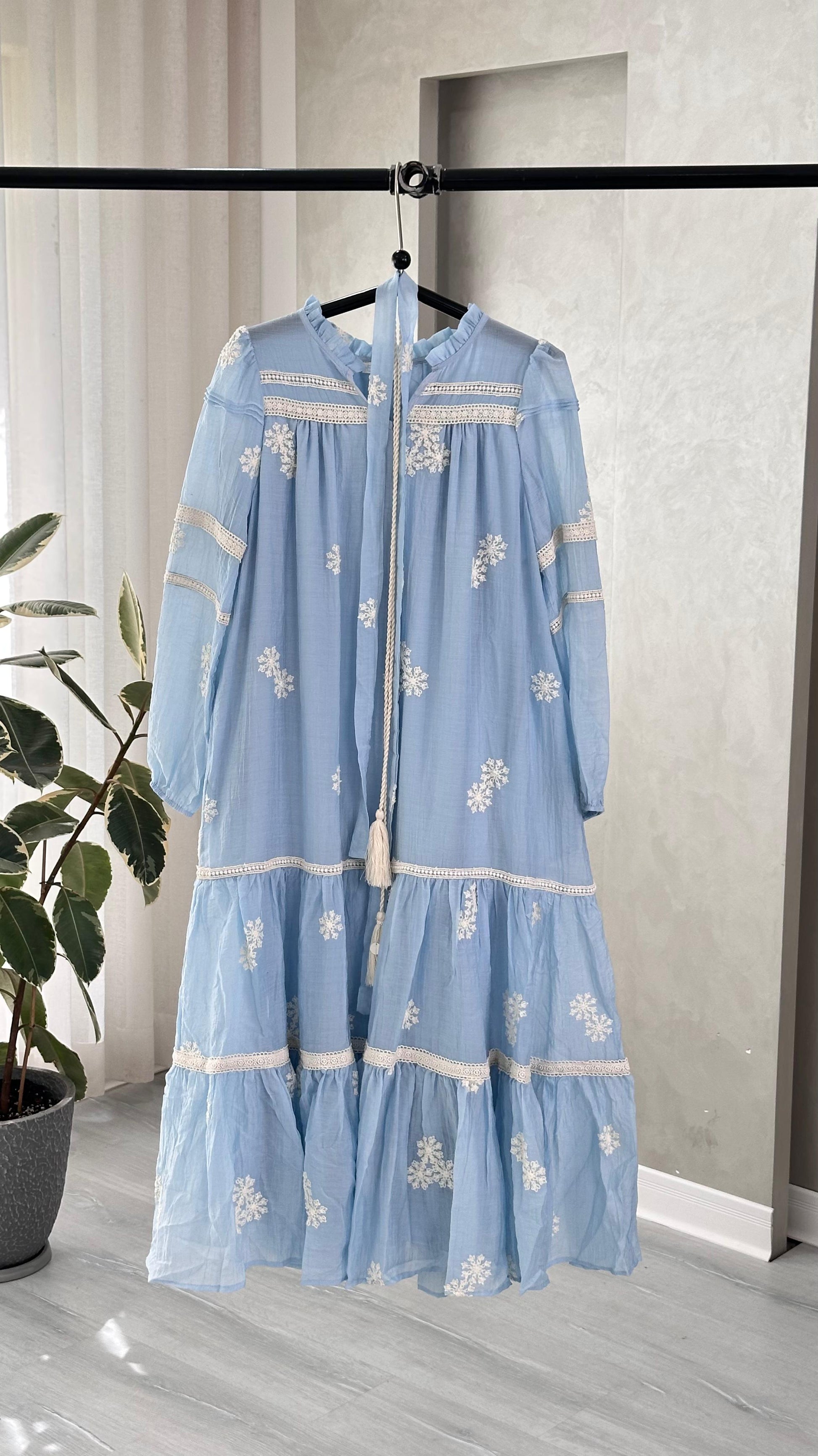 - **التنورة واسعة ومريحة**، تتخللها خطوط دانتيل أفقية متكررة، وتزينها تطريزات متناثرة تضيف حركة بصرية ناعمة.