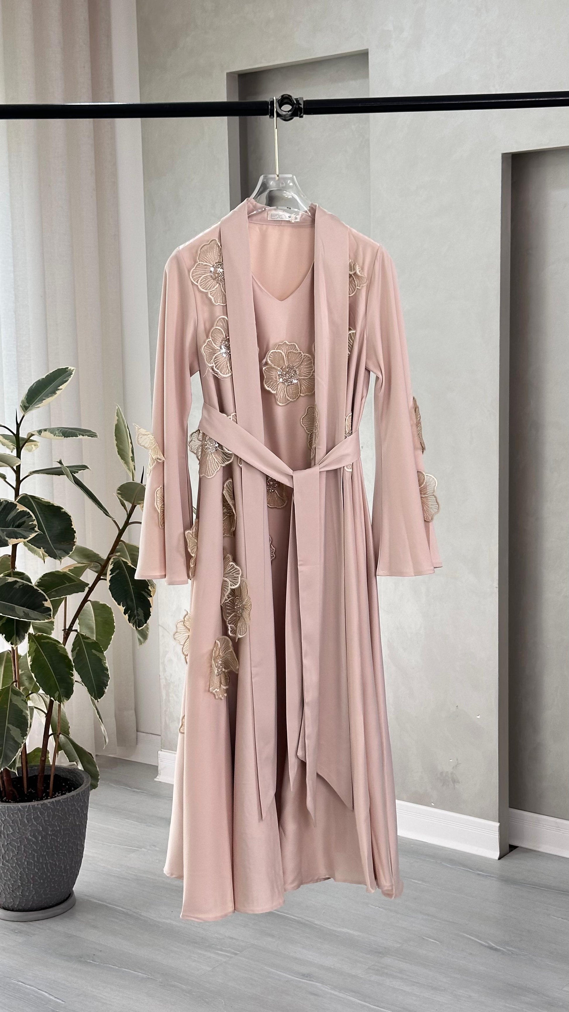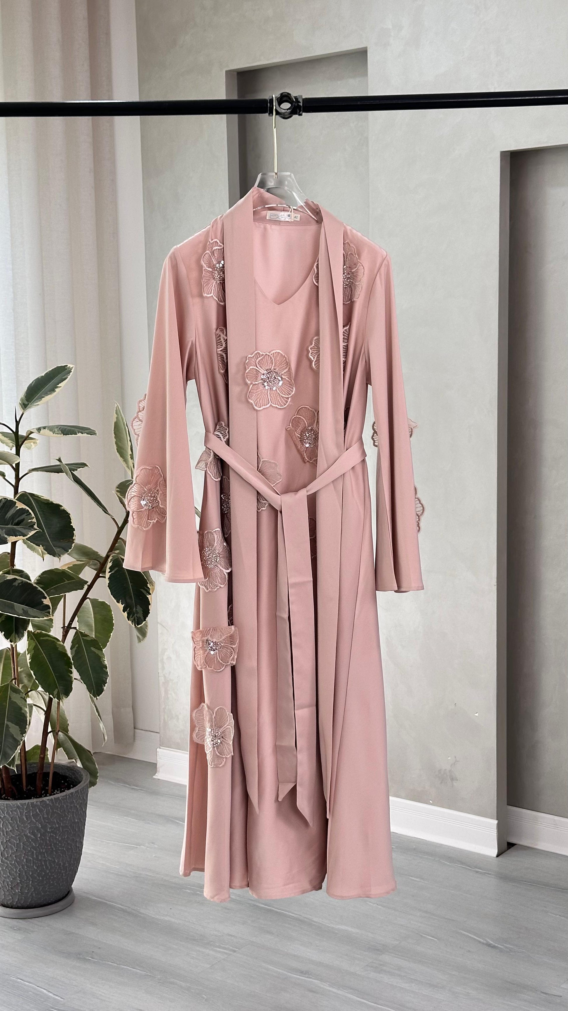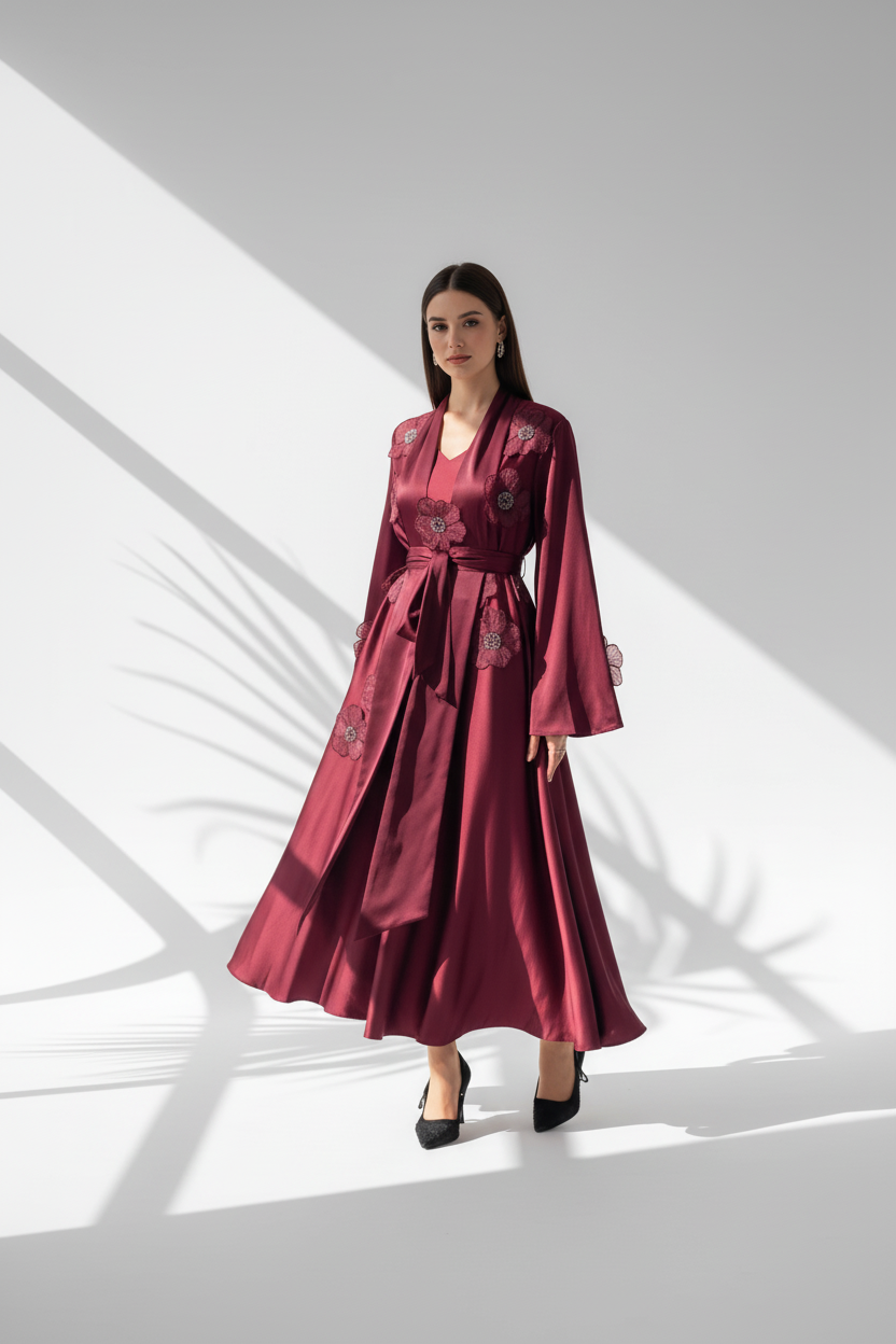 • حزام عريض من نفس القماش يلتف حول الخصر ويُربط من الأمام، ليبرز الجسم ويضفي شكلًا أنسيابيًا جميلًا.