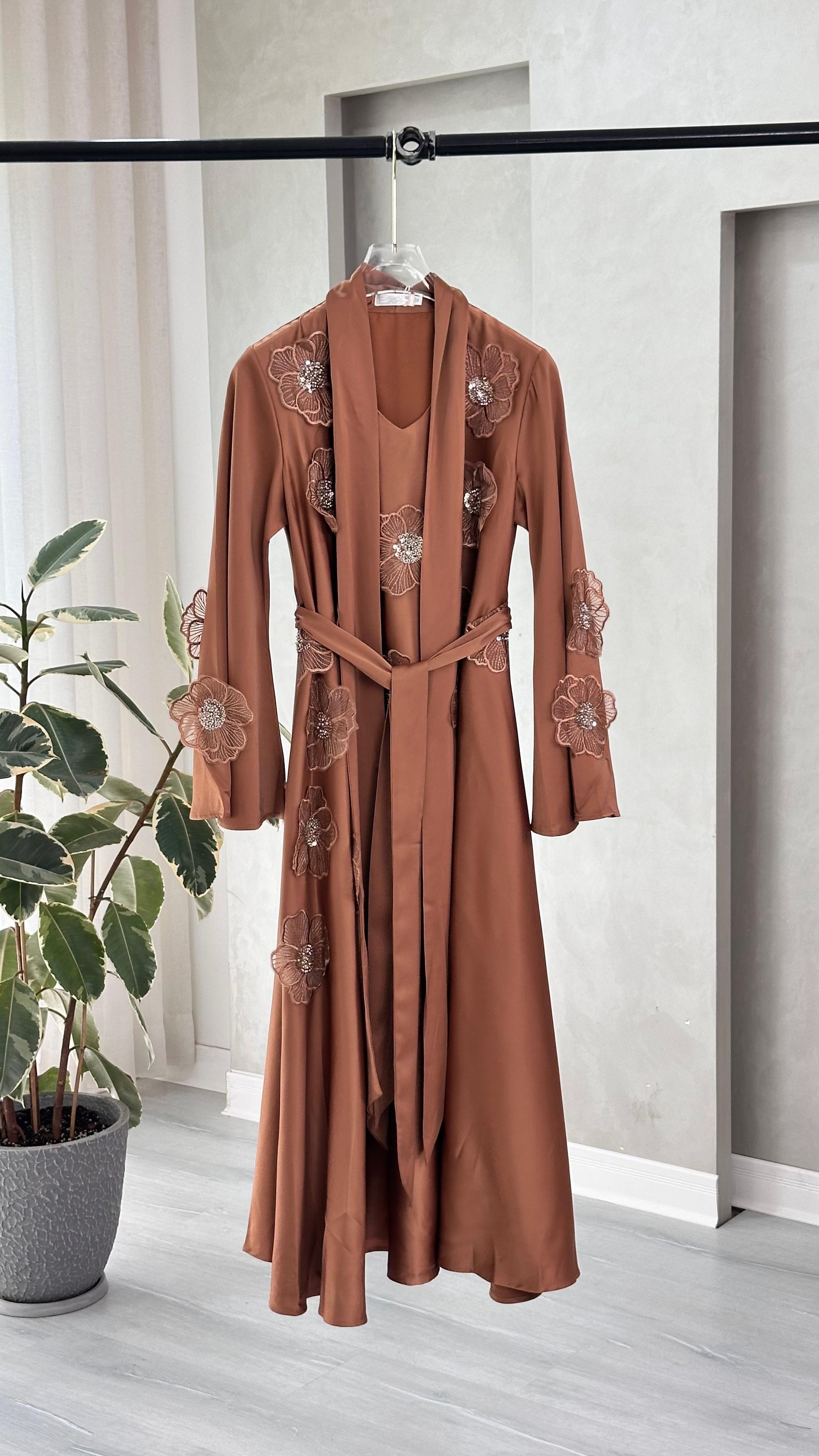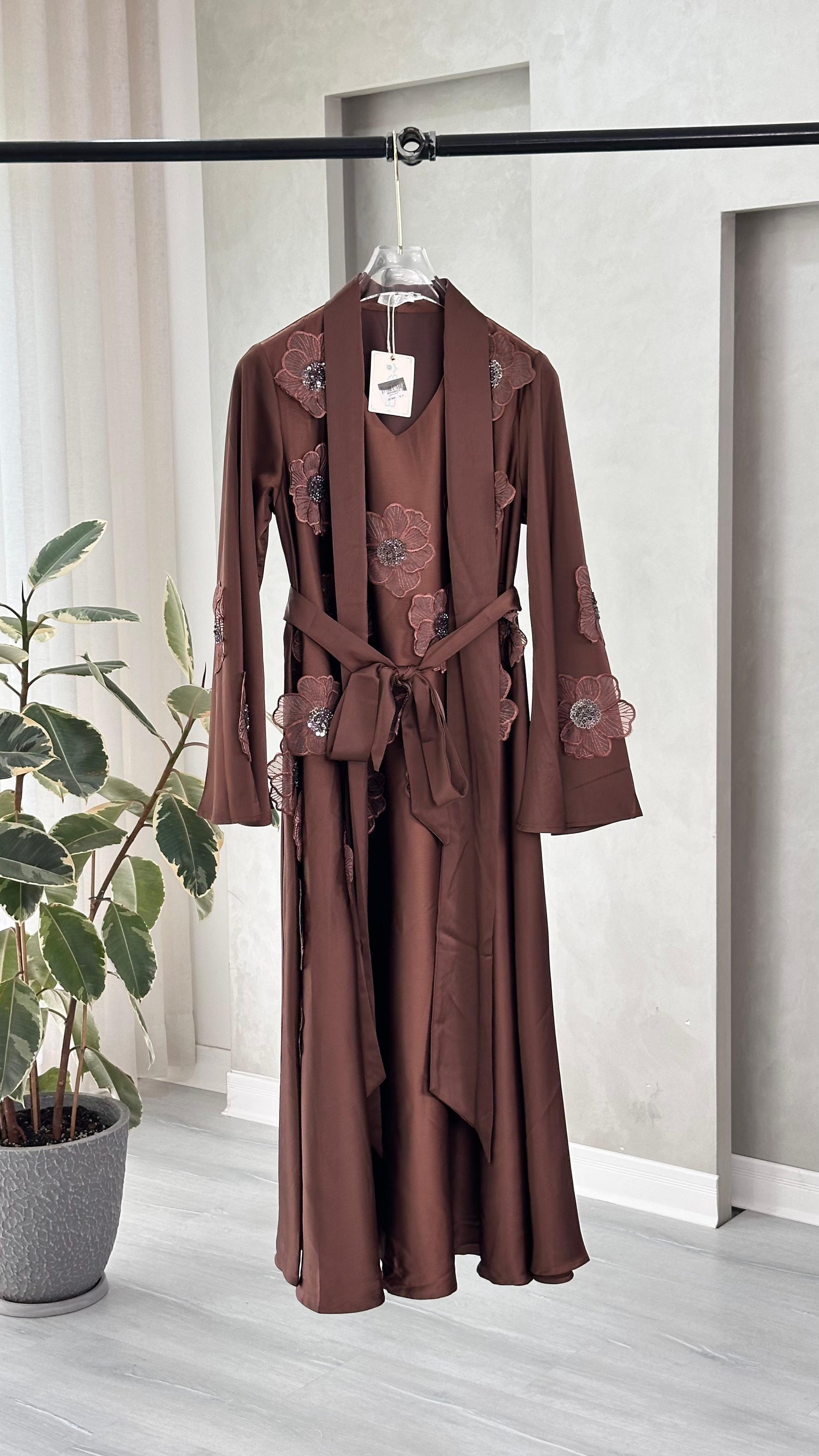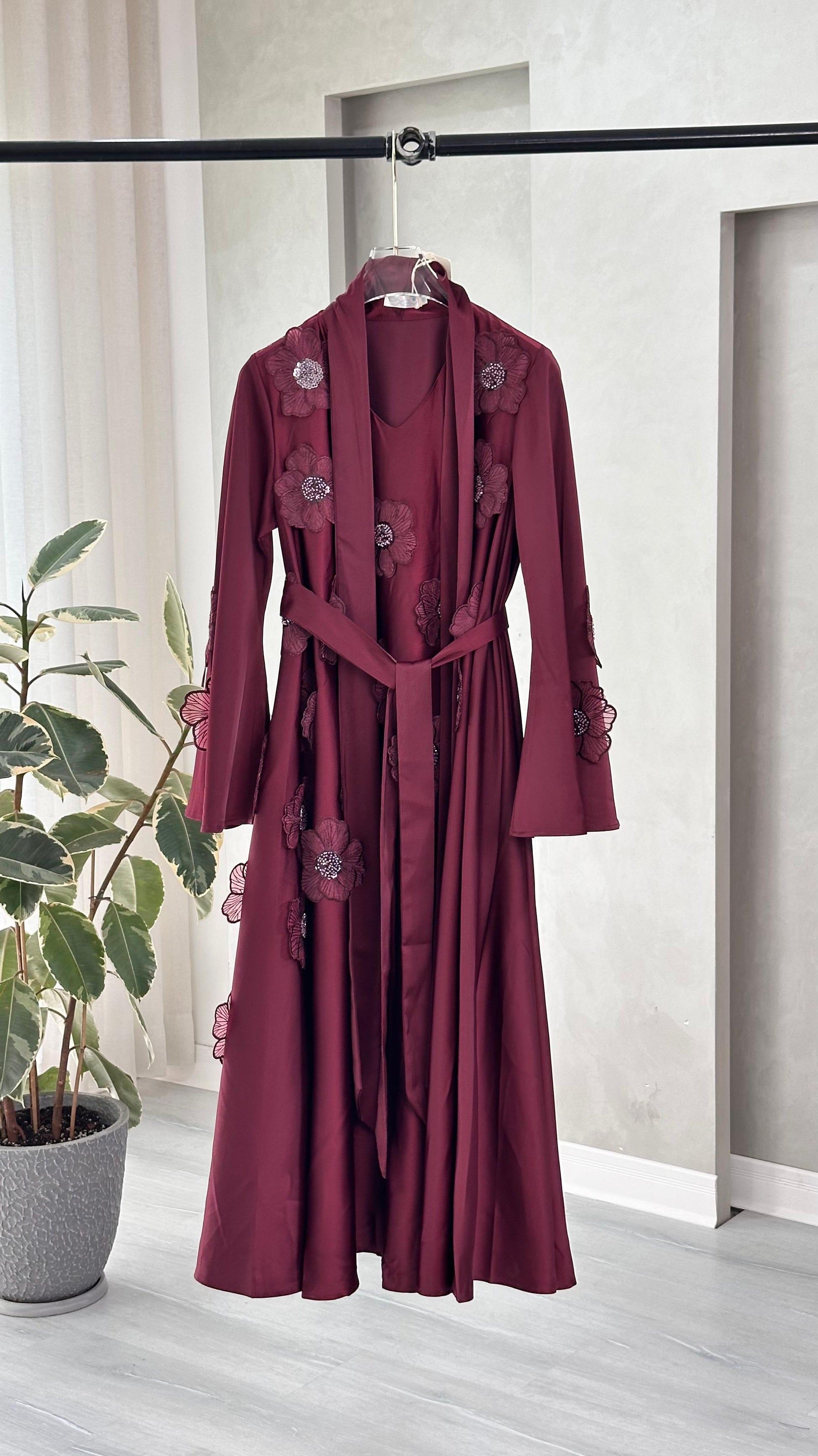 • حزام عريض من نفس القماش يلتف حول الخصر ويُربط من الأمام، ليبرز الجسم ويضفي شكلًا أنسيابيًا جميلًا.
