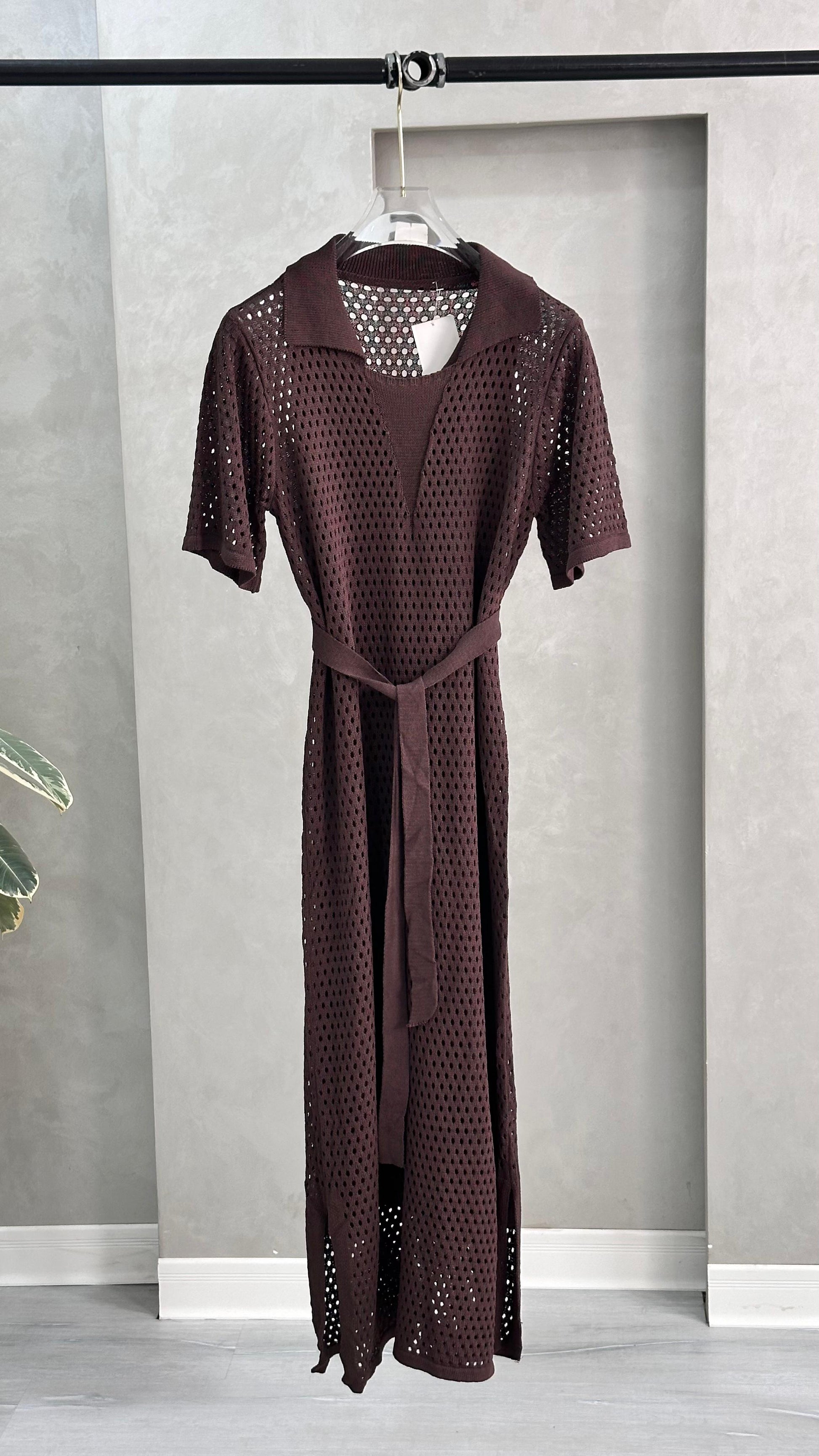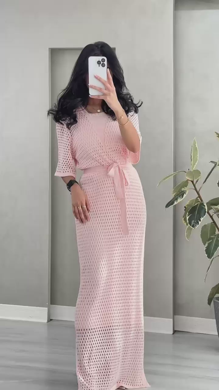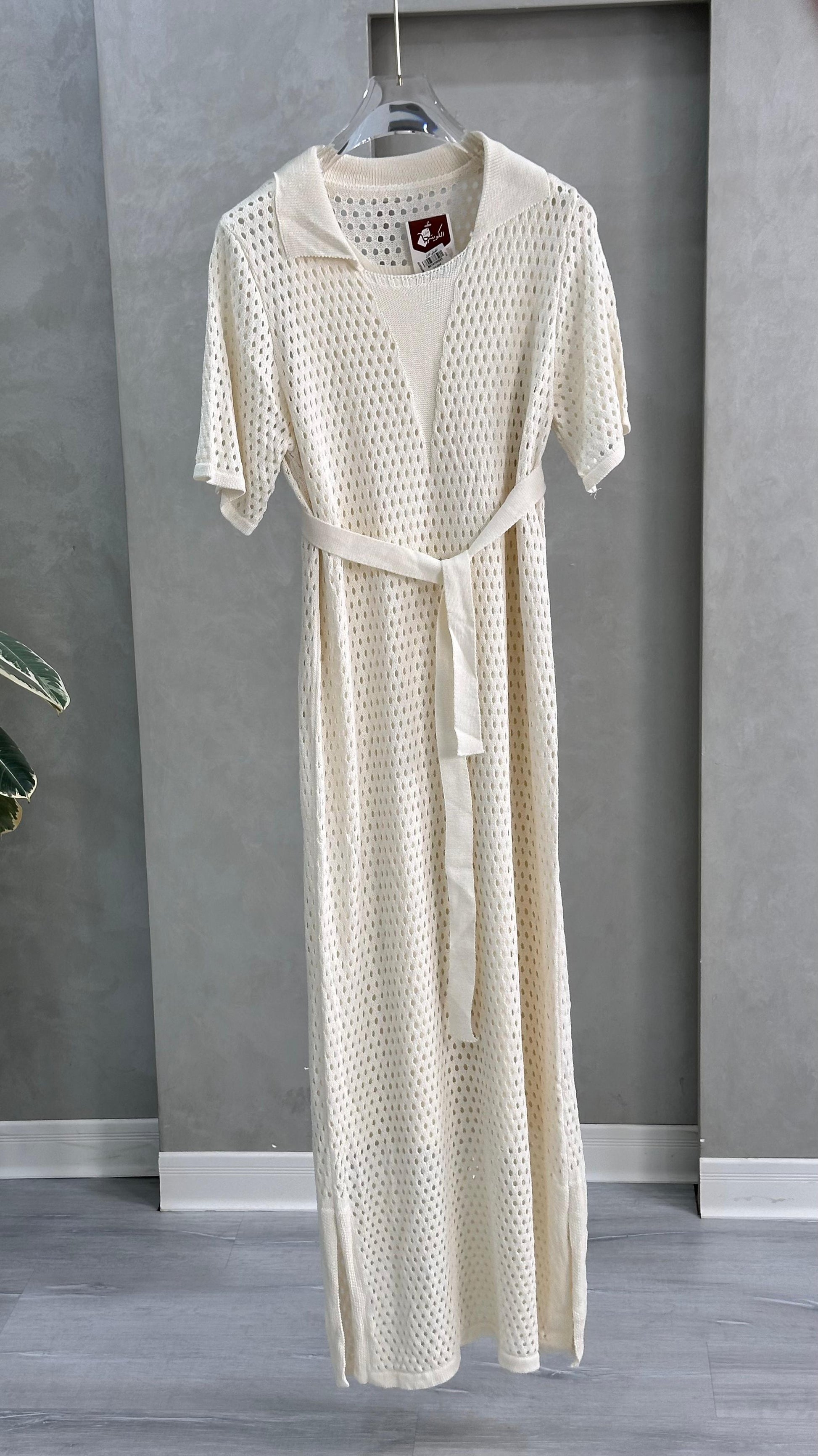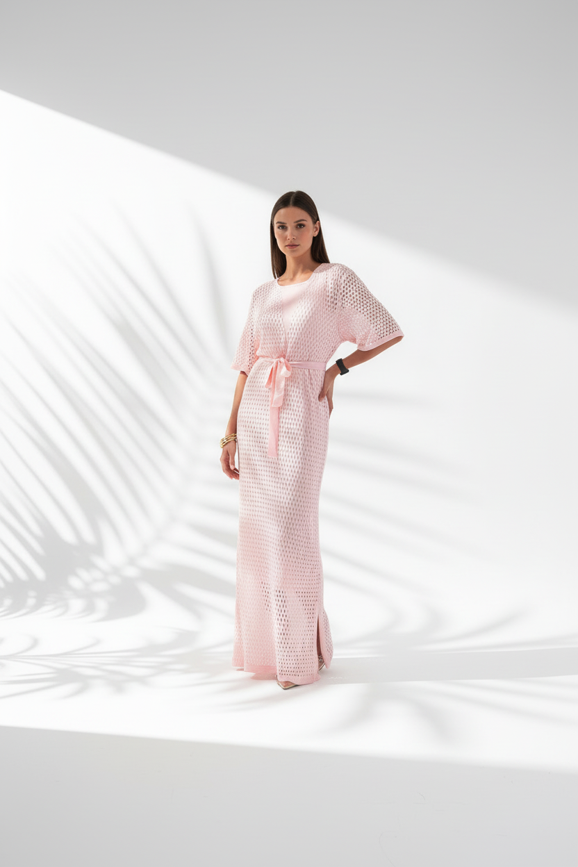 يتميز بتفاصيل شبكية أنيقة ولمسة خفيفة تناسب الإطلالات اليومية أو الشاطئية. مزود بحزام خصر بنفس القماش لإبراز القوام وإضافة لمسة أنثوية جذابة.