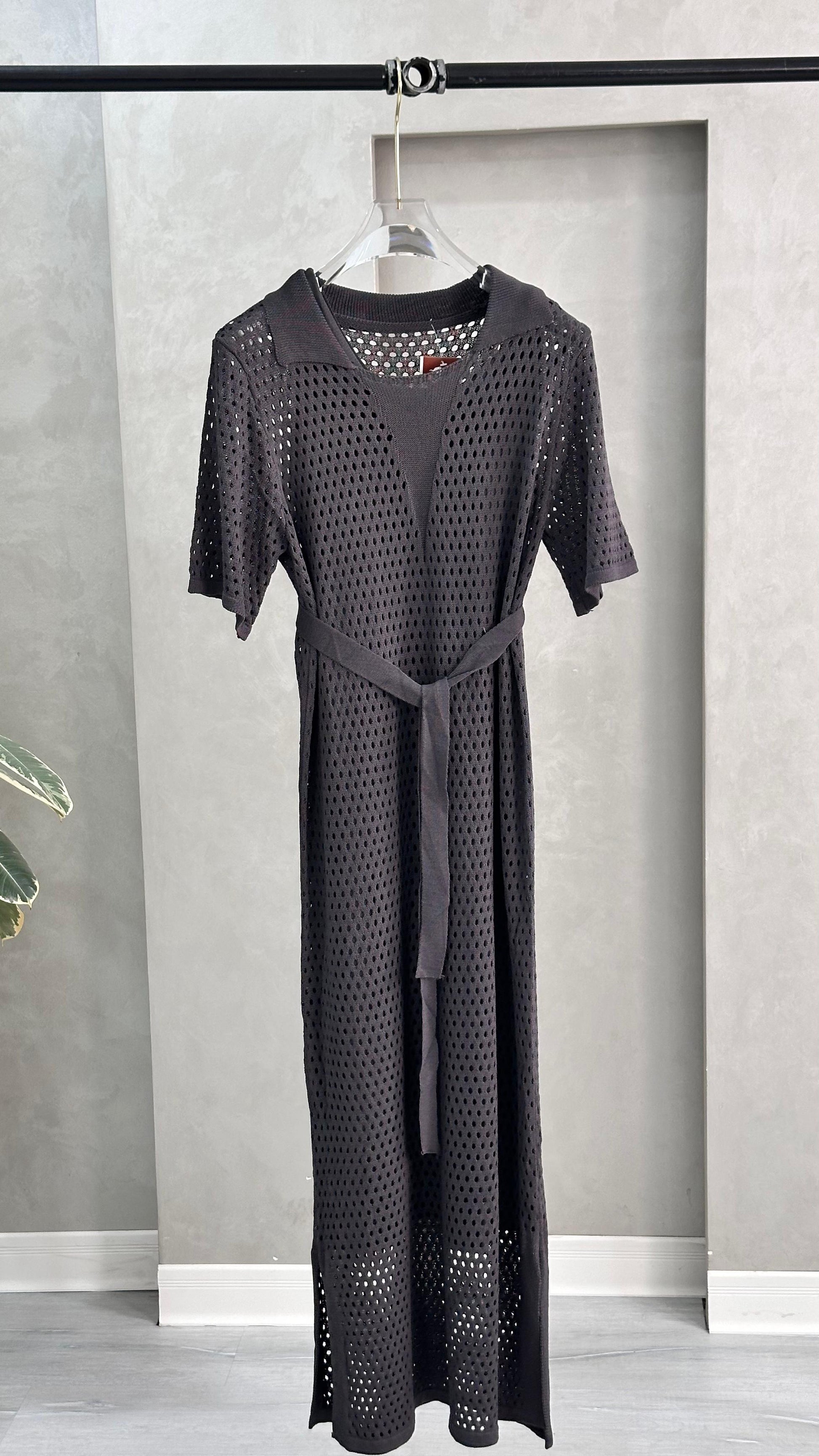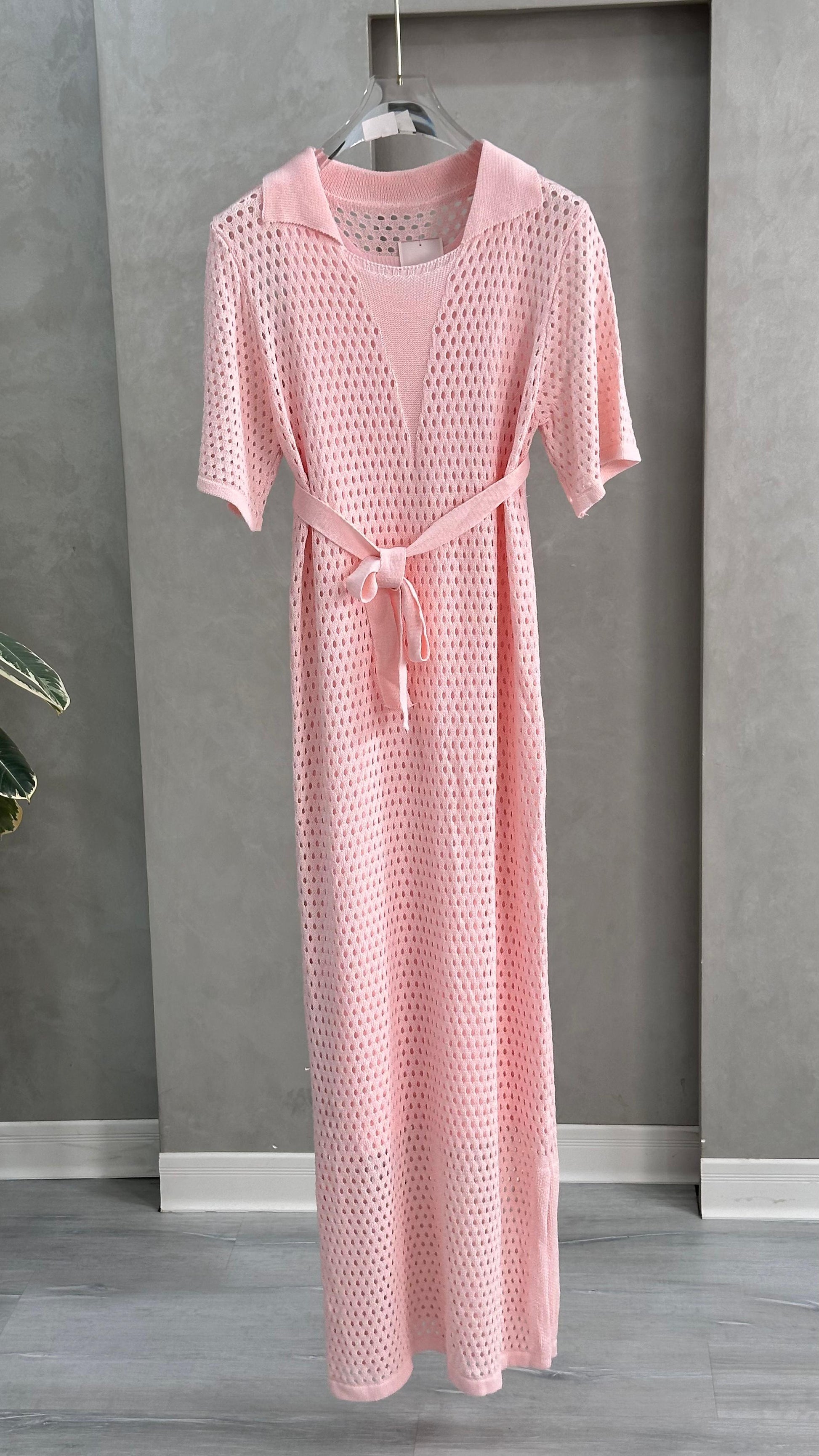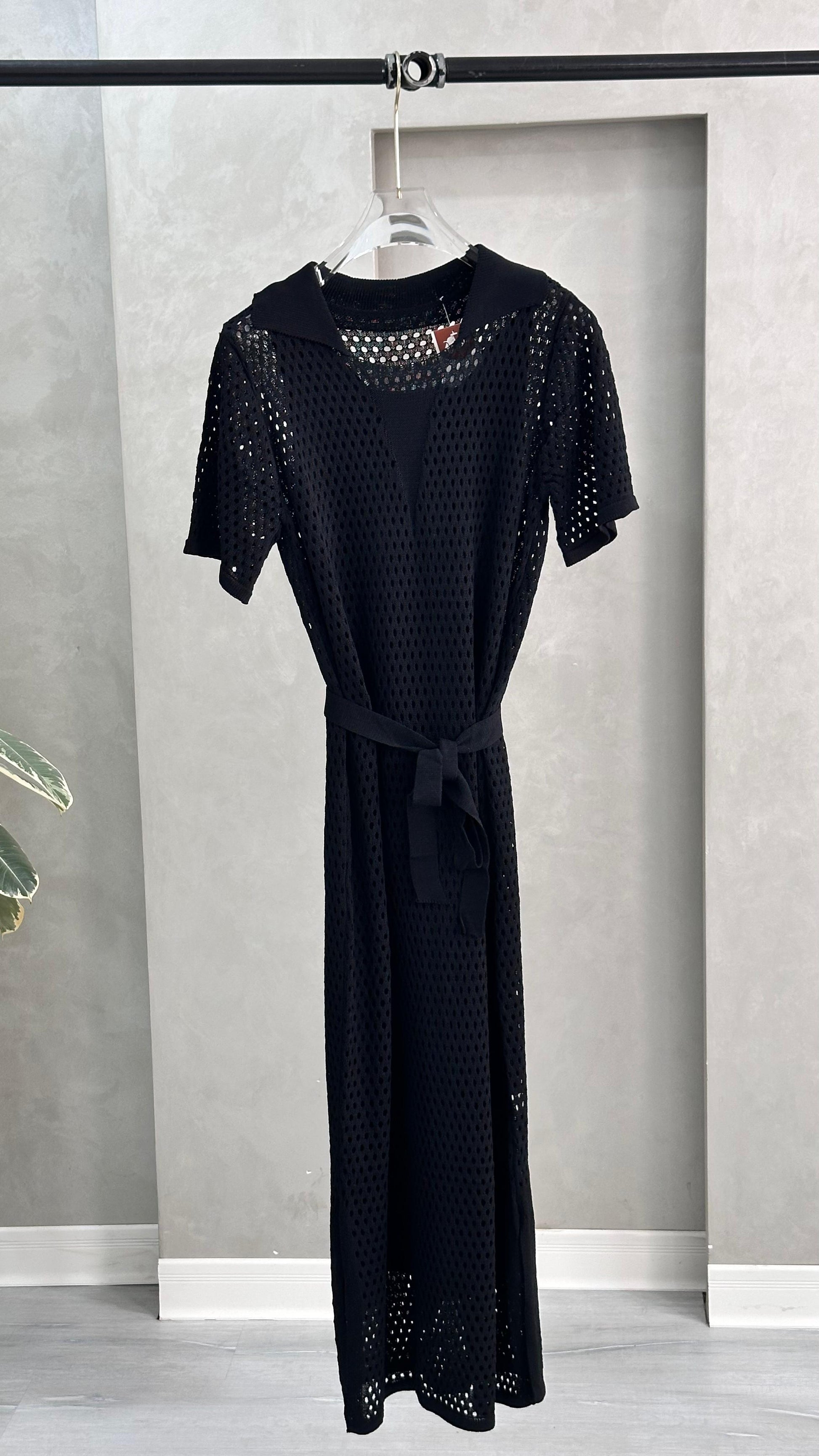 يتميز بتفاصيل شبكية أنيقة ولمسة خفيفة تناسب الإطلالات اليومية أو الشاطئية. مزود بحزام خصر بنفس القماش لإبراز القوام وإضافة لمسة أنثوية جذابة.