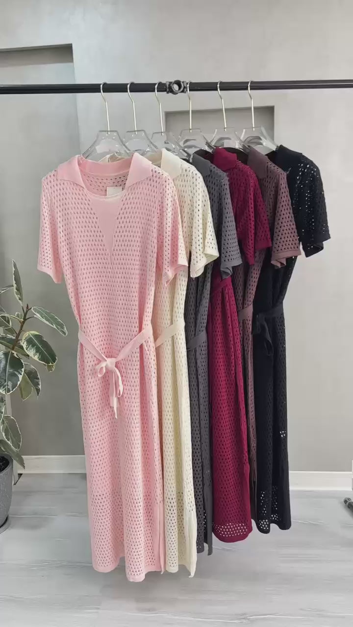 تألقي بإطلالة أنيقة ومريحة مع هذا الفستان الشبكي الطويل المصمم بأكمام قصيرة وقصة ناعمة مثالية لأيام الصيف.