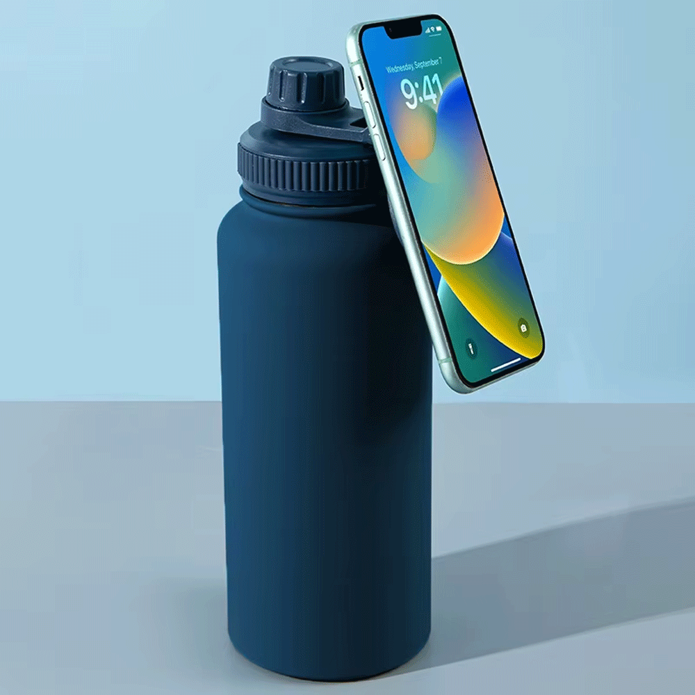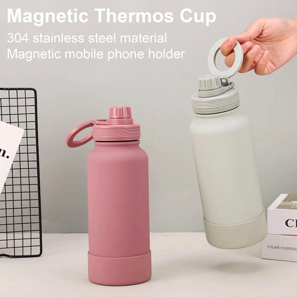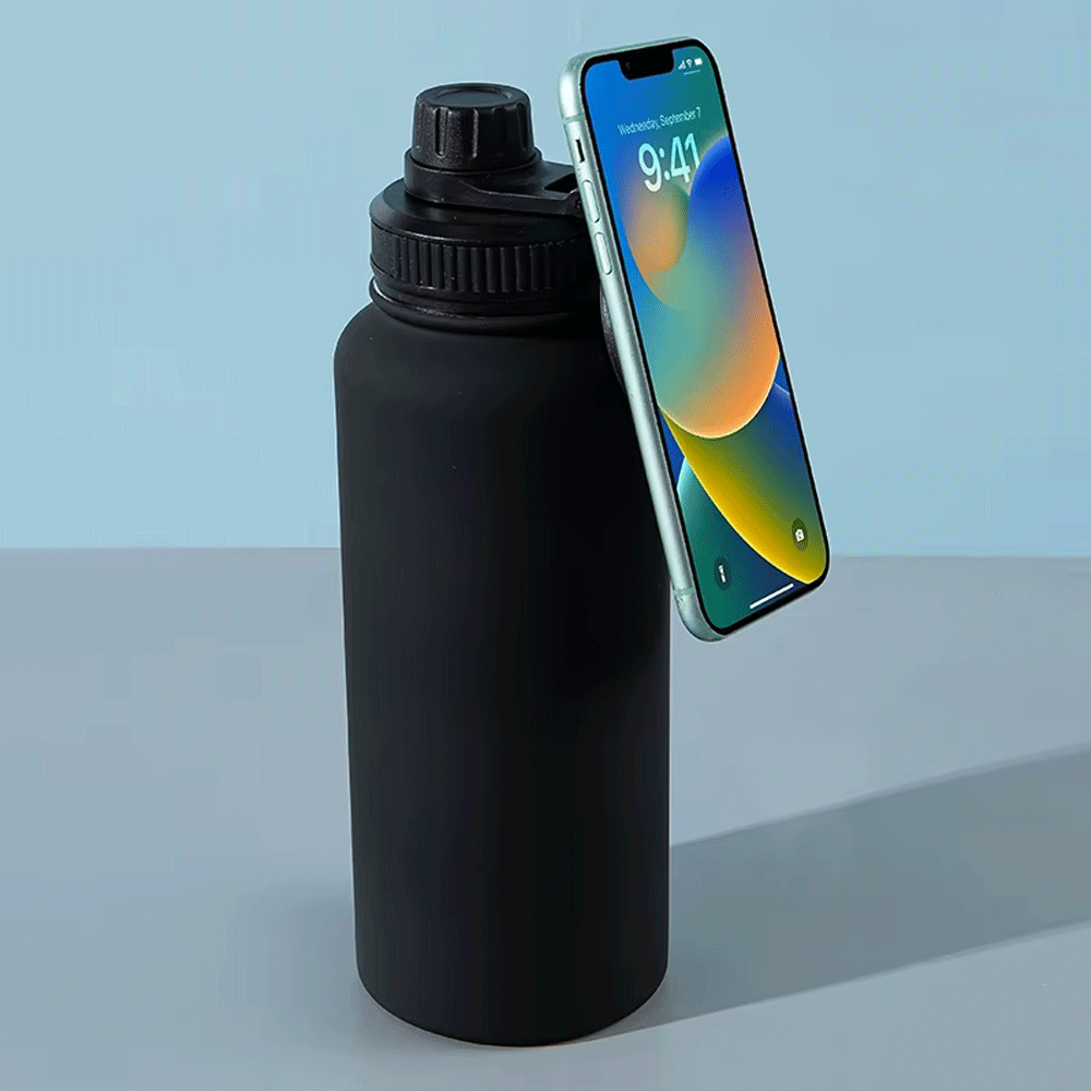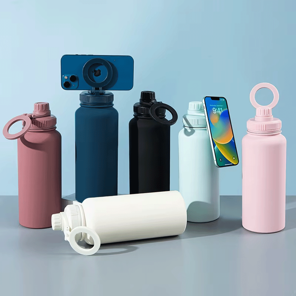 1. زجاجة ماء معزولة من الفولاذ المقاوم للصدأ مع حامل مغناطيسي مبتكر للهاتف.