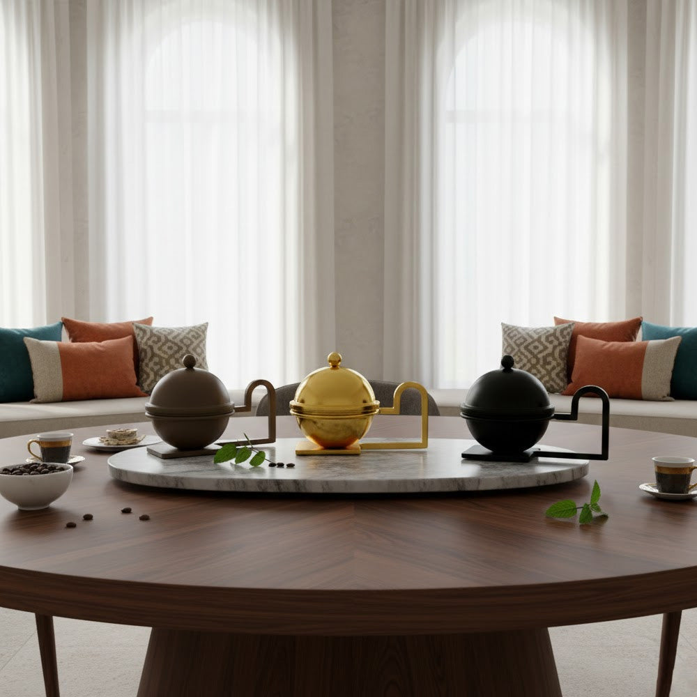 تعدد الألوان: خيارات ألوان متنوعة (ذهبي/فضي/اسود/بني ترابي) تتيح لك تنسيق "طقم" متكامل بألوان مختلفة على سفرة واحدة.