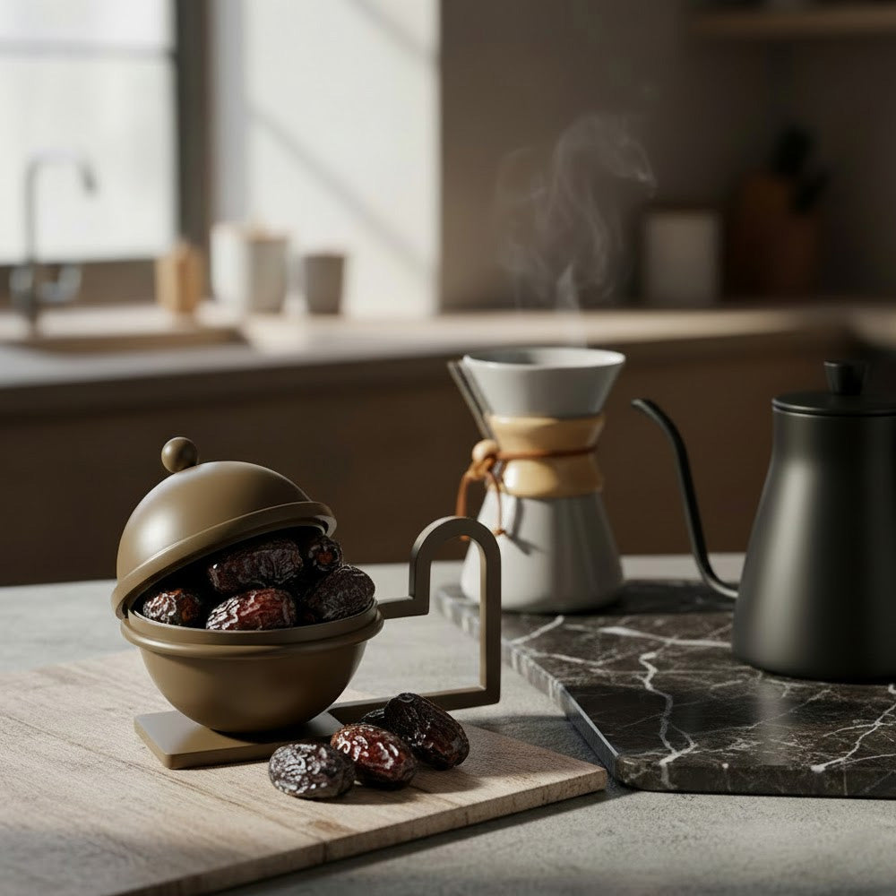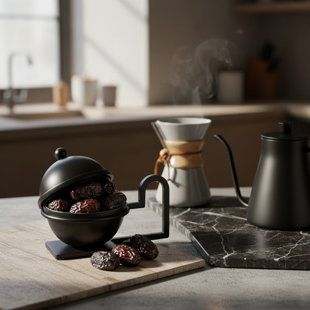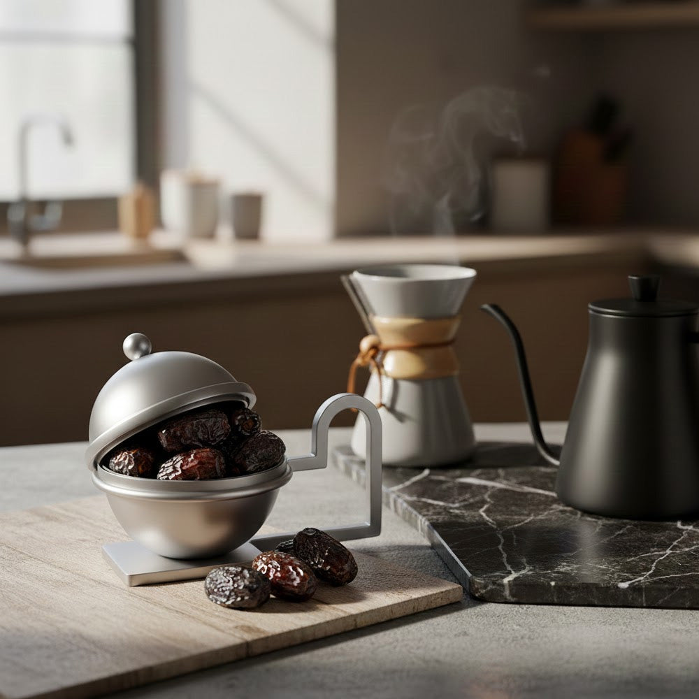 تصميم عصري: شكل كروي (Orb) يكسر روتين أطباق التمر التقليدية المسطحة.