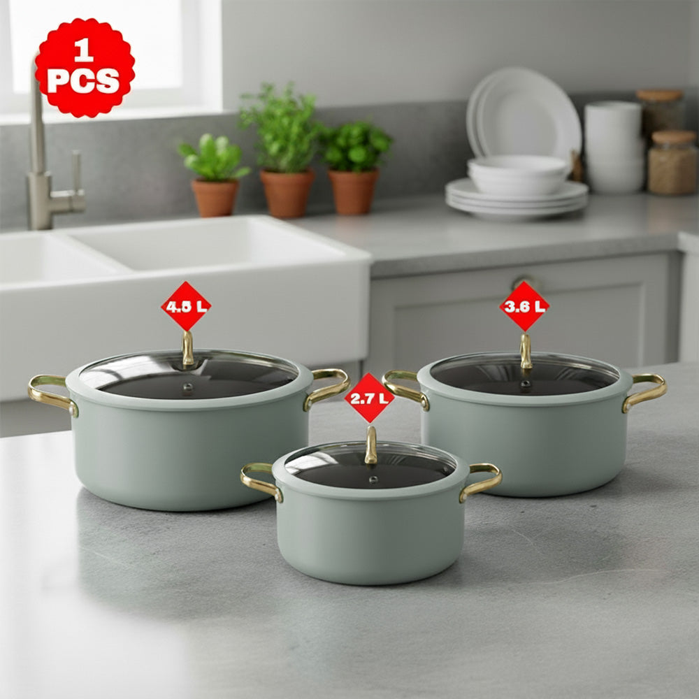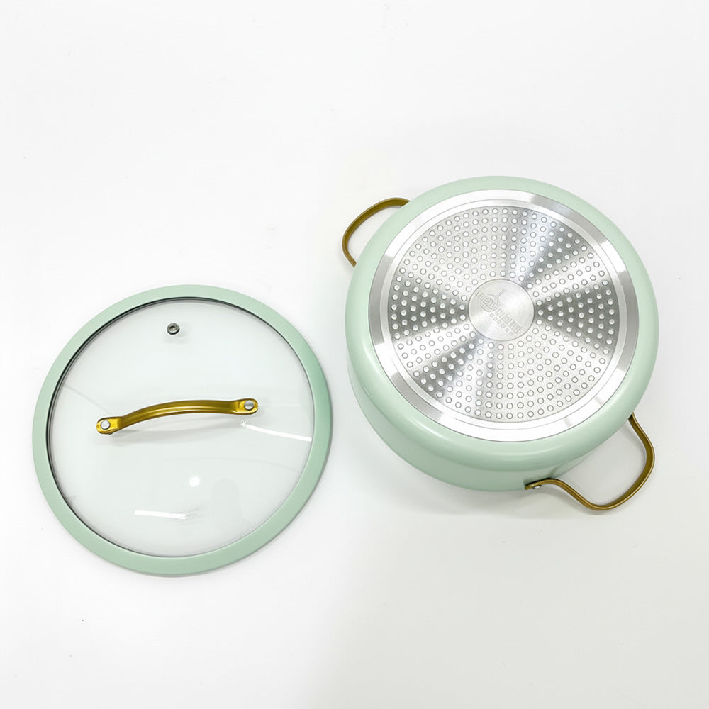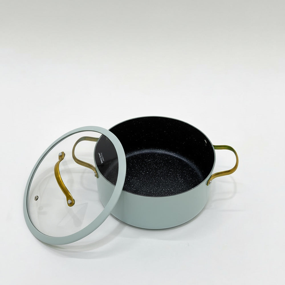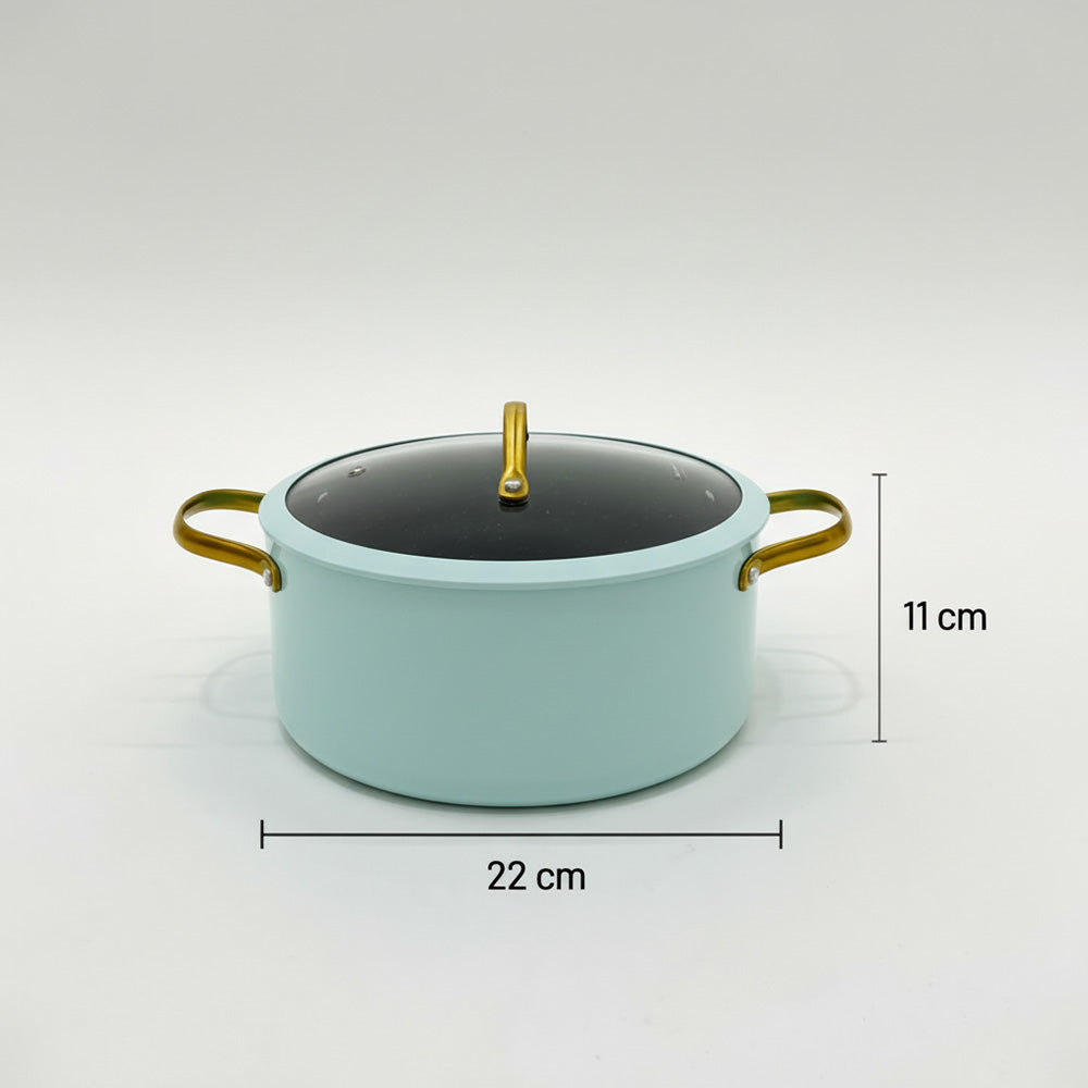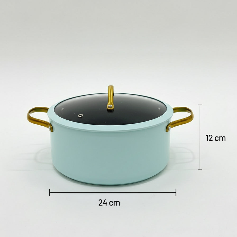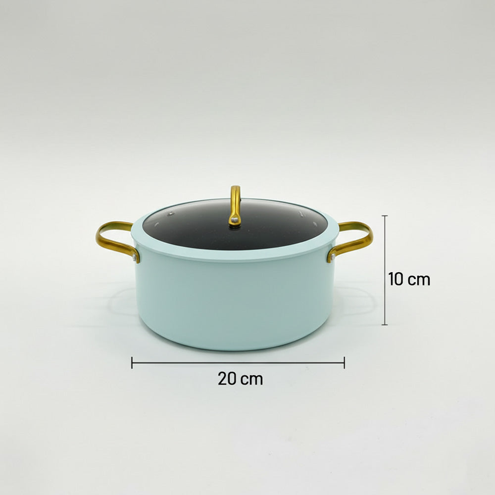أضفِ لمسةً من الأناقة والعملية إلى مطبخك مع قدر الطهي الأنيق غير اللاصق بلونه الأزرق الفاتح المنعش ومقابضه الذهبية. مصنوع من الألومنيوم عالي الجودة، ويوفر توزيعًا ممتازًا للحرارة لنتائج طهي متساوية وكفاءة في استهلاك الطاقة.