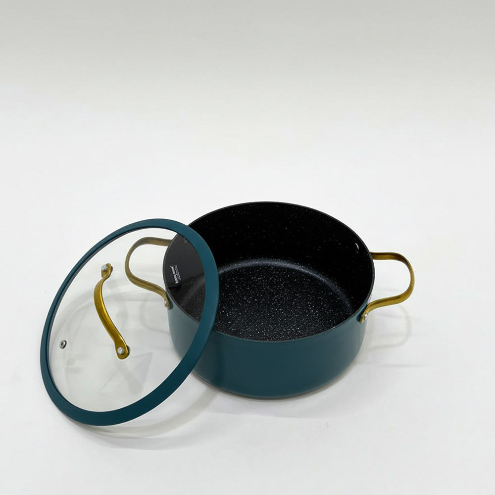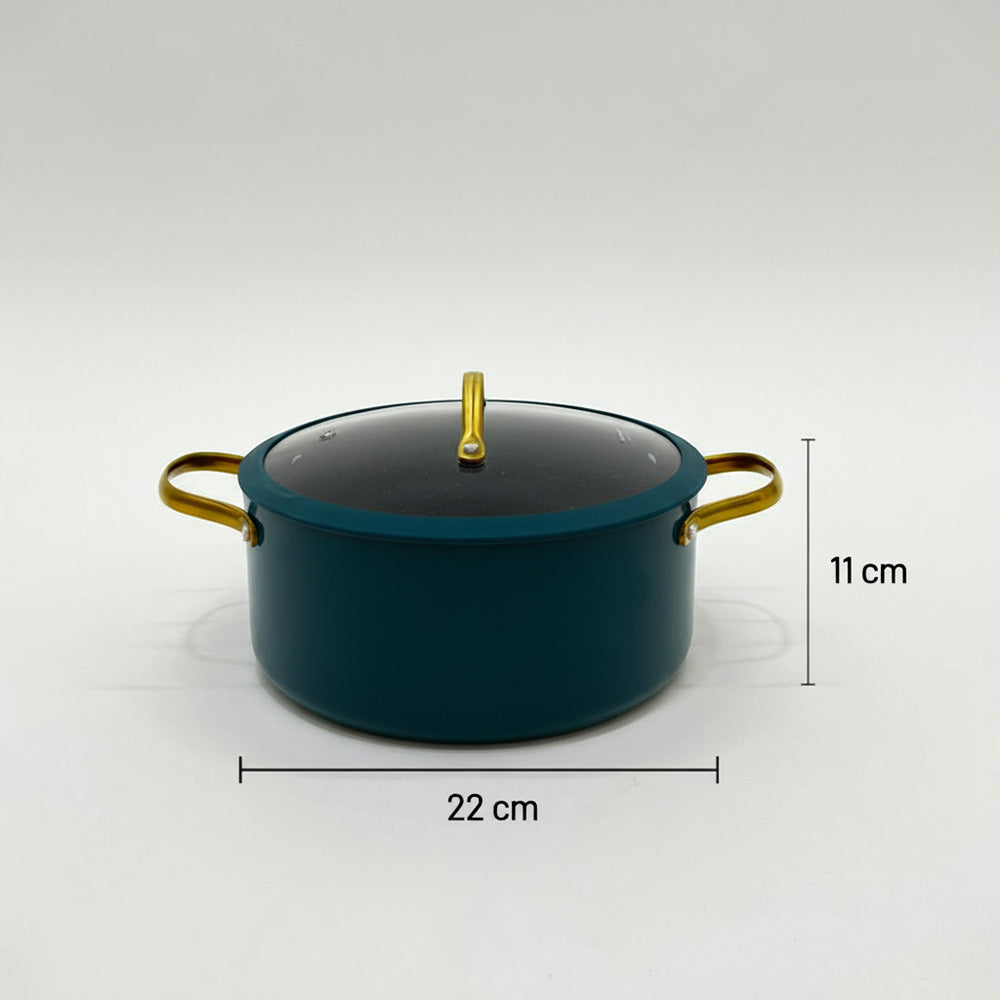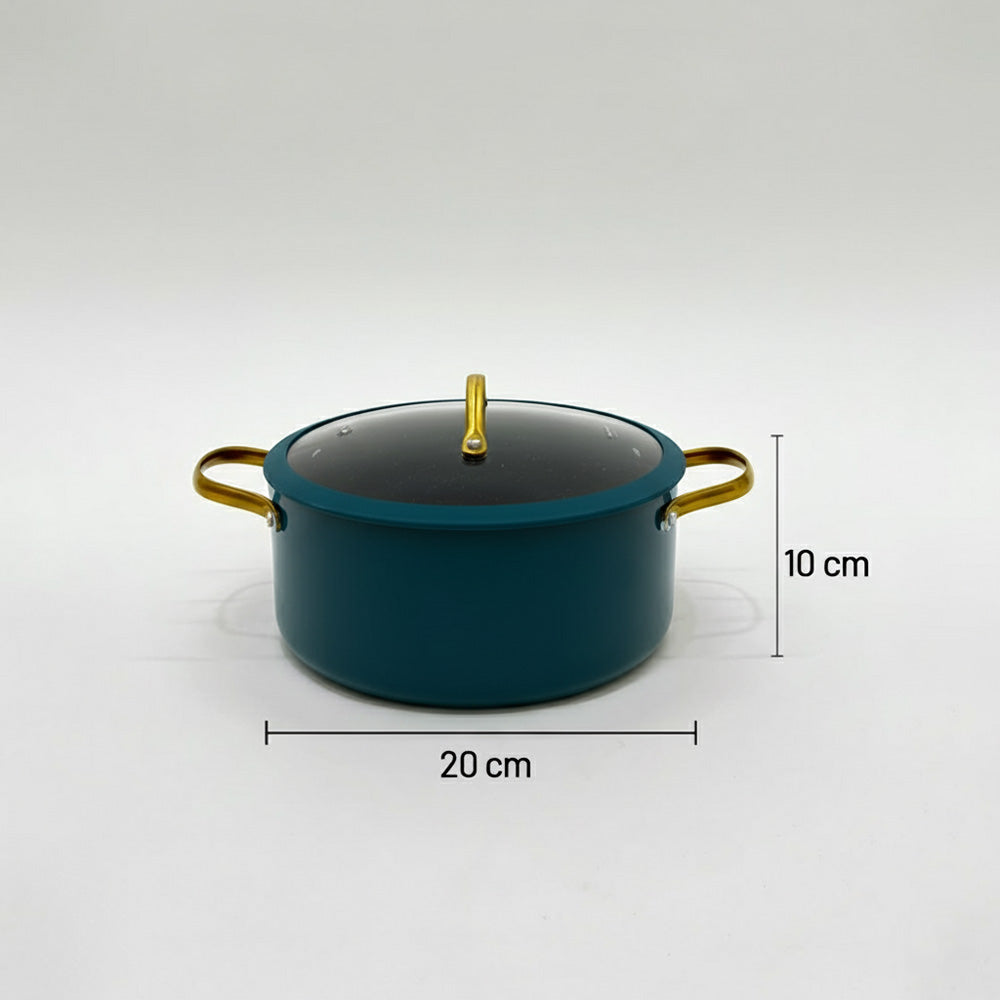 أضف لمسة من الأناقة العصرية إلى مطبخك مع قدرنا الفاخر غير اللاصق، المصمم بلون أزرق مخضر خلاب ومقابض ذهبية. مصنوع من الألومنيوم المتين لأداء يدوم طويلاً، ويضمن توزيعًا متساويًا للحرارة لنتائج طهي مثالية في كل مرة.