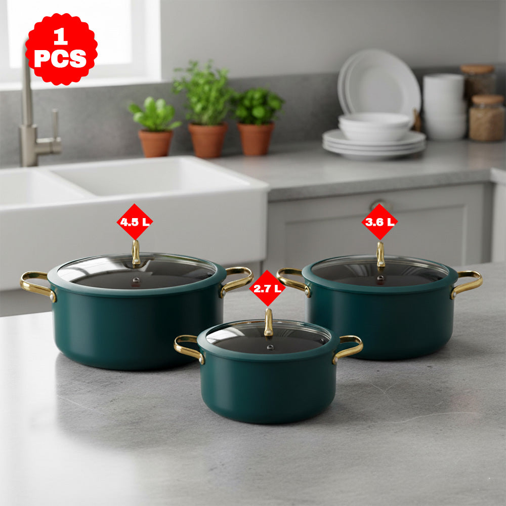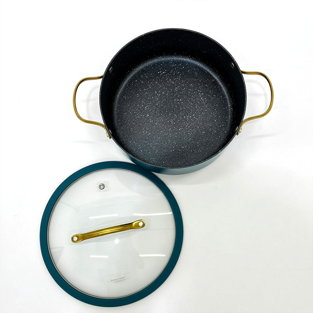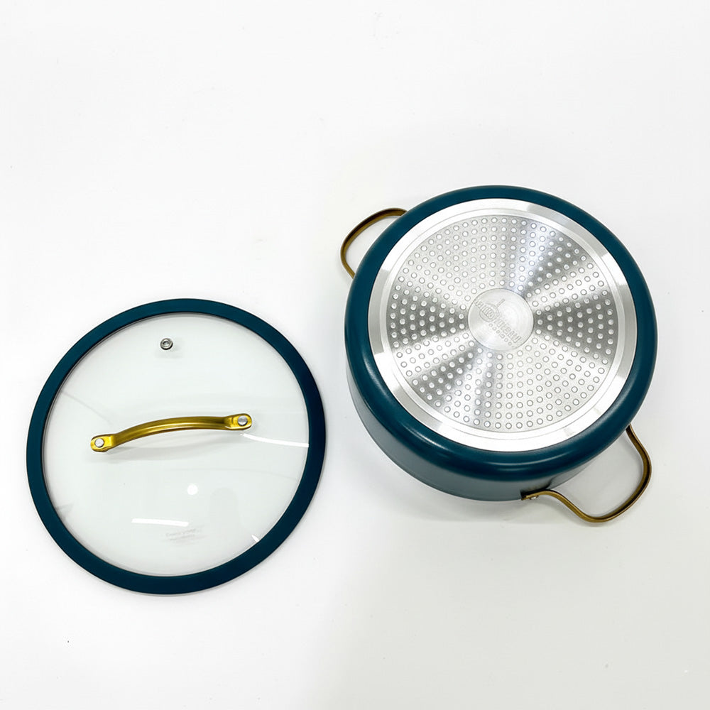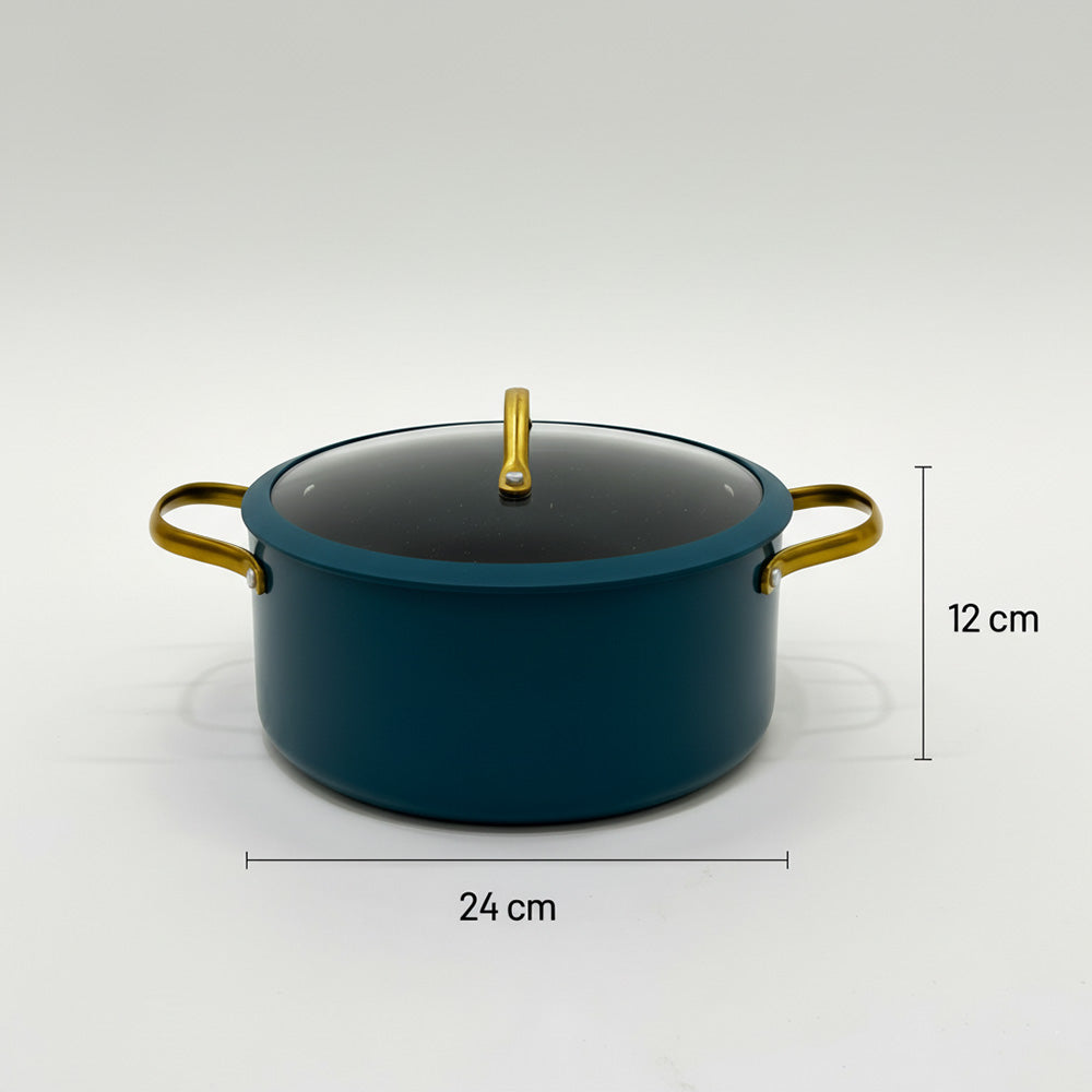 أضف لمسة من الأناقة العصرية إلى مطبخك مع قدرنا الفاخر غير اللاصق، المصمم بلون أزرق مخضر خلاب ومقابض ذهبية. مصنوع من الألومنيوم المتين لأداء يدوم طويلاً، ويضمن توزيعًا متساويًا للحرارة لنتائج طهي مثالية في كل مرة.