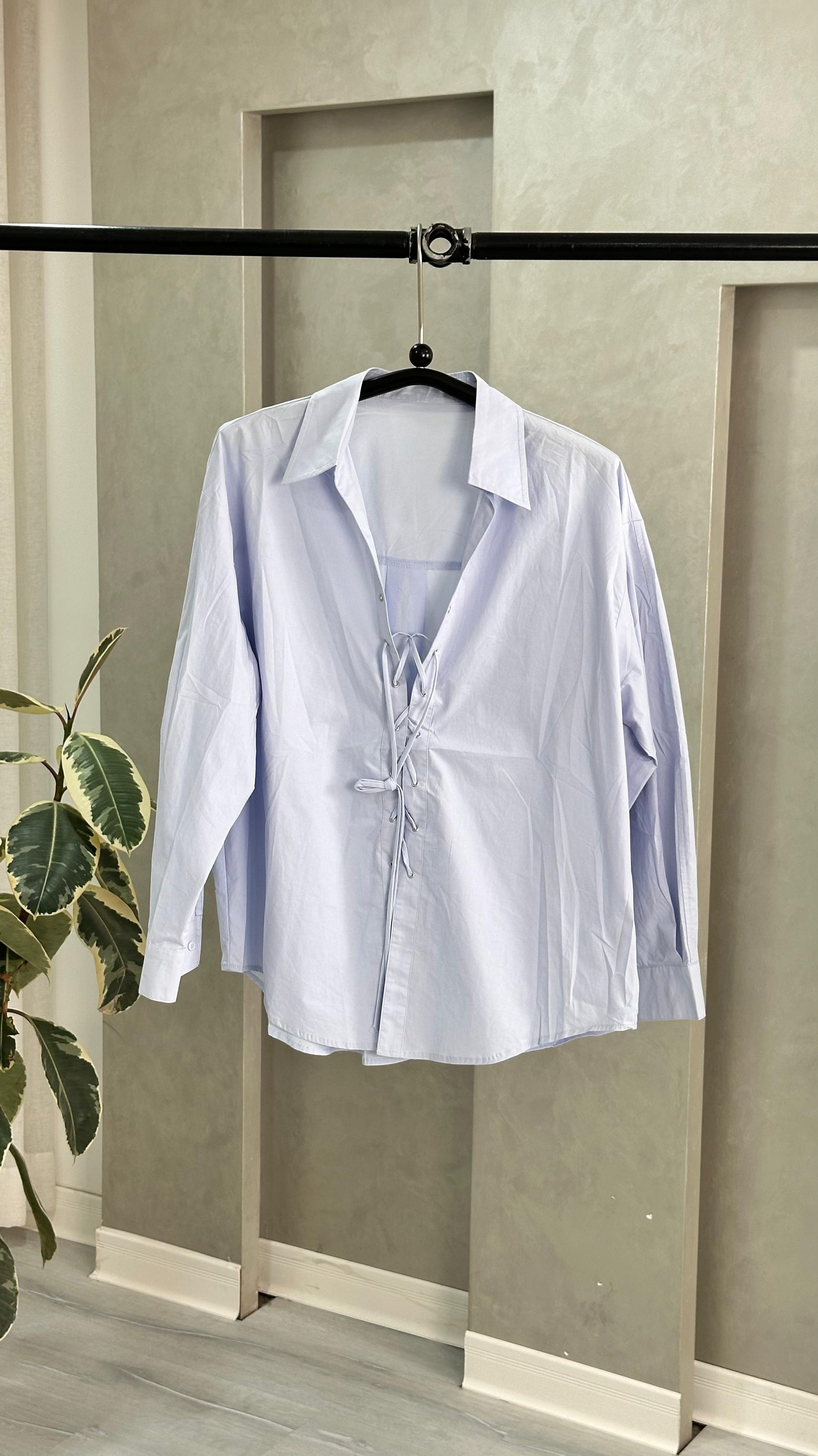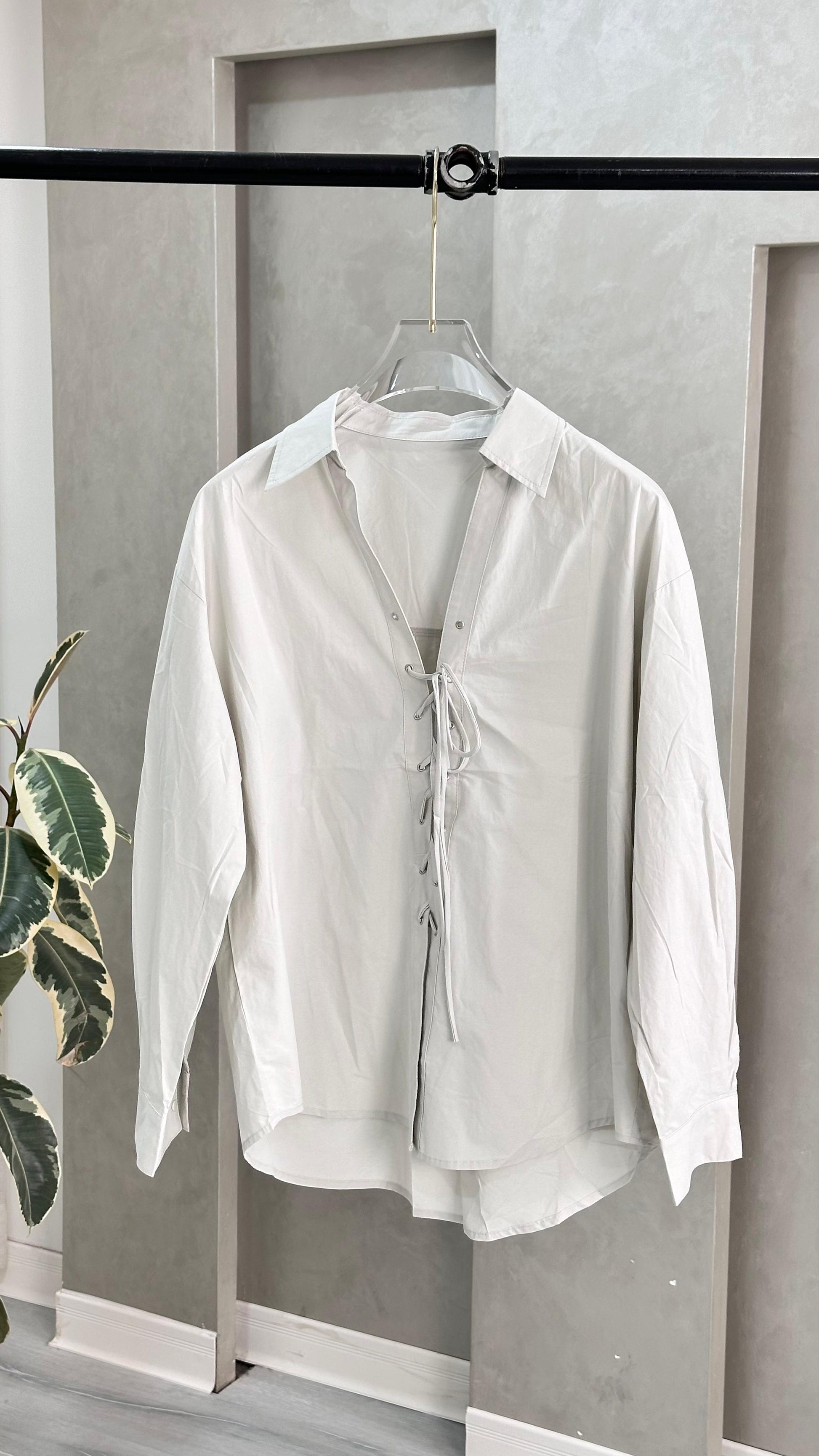 اللباس عبارة عن قميص بأكمام طويلة، مصنوع من قماش خفيف وناعم، ويتميز بياقة كلاسيكية مطوية. التصميم الأمامي مزود بفتحة تربط بواسطة خيوط تمر عبر حلقات معدنية، ما يمنح القطعة طابعاً زخرفياً قابلاً للتعديل حسب الرغبة.
