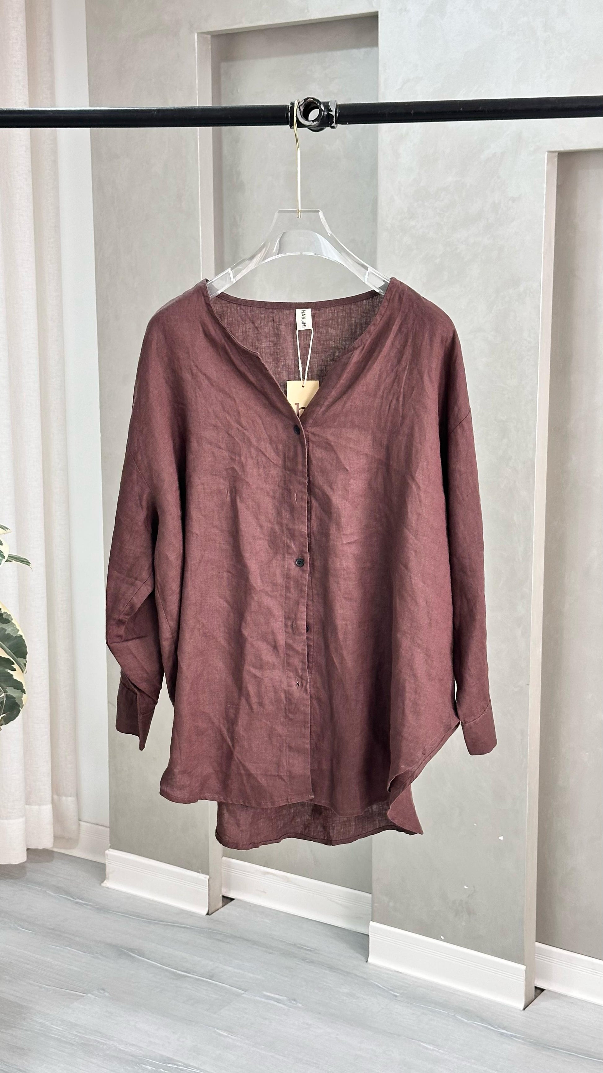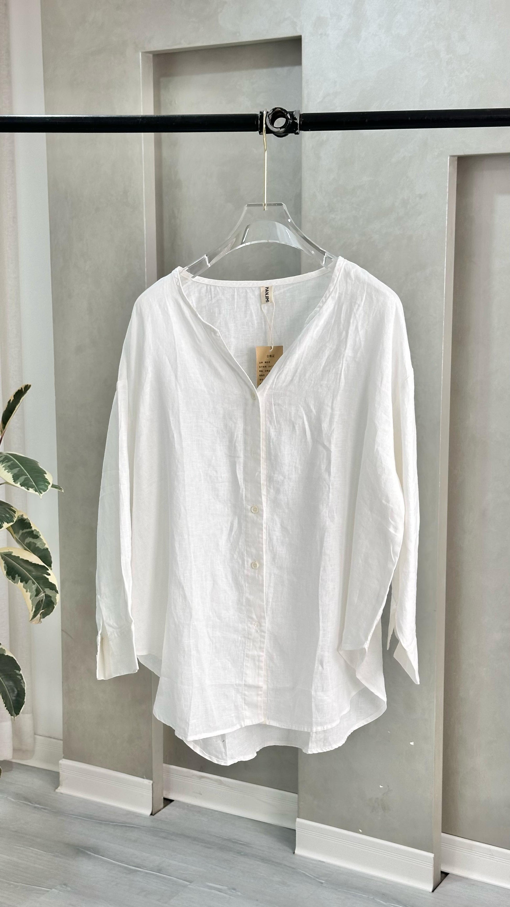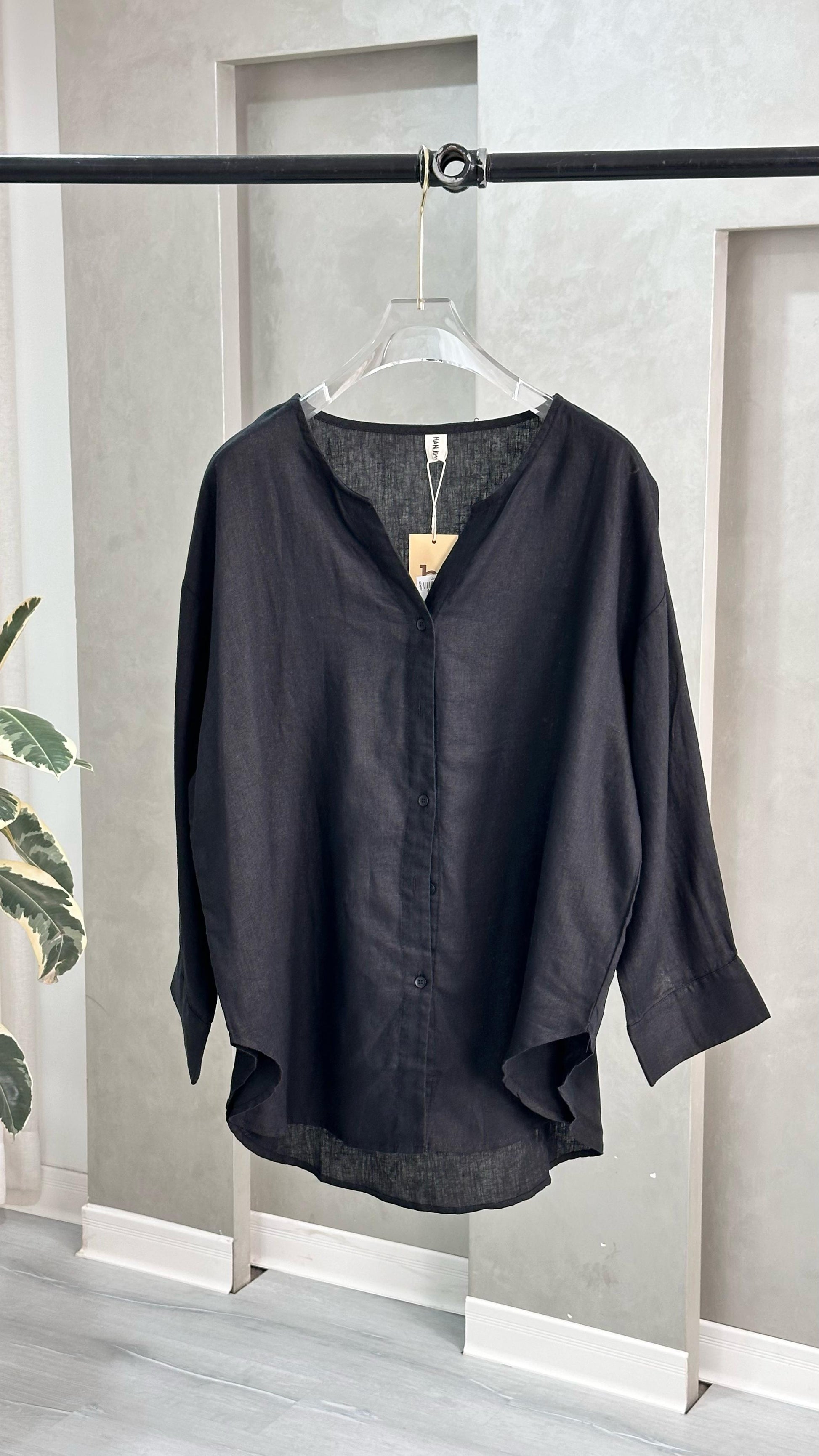 القميص الظاهر في الصورة يتميز بتصميم ناعم وانسيابي، بأكمام طويلة وقصة فضفاضة تمنحه مظهراً مريحاً وغير رسمي. يفتقر إلى الياقة التقليدية، ويأتي بياقة على شكل V مفتوحة قليلاً، ما يضفي لمسة أنثوية وعصرية على التصميم.