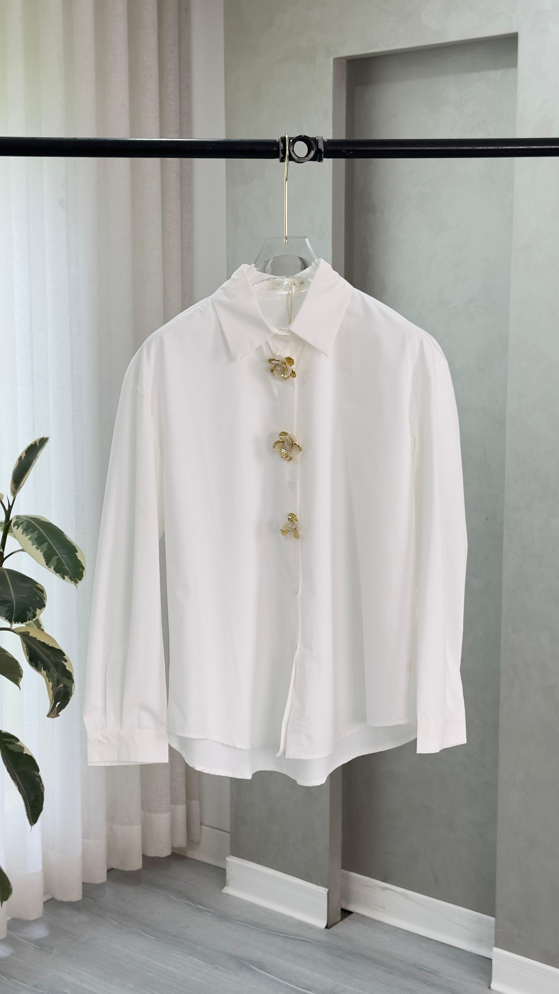 أزرار زخرفية بارزة: يتميز بأزرار كبيرة ولامعة بتصميم مميز (تبدو كالورود أو الأشكال الهندسية الذهبية)، تعمل كنقاط محورية تبرز أناقة القميص.