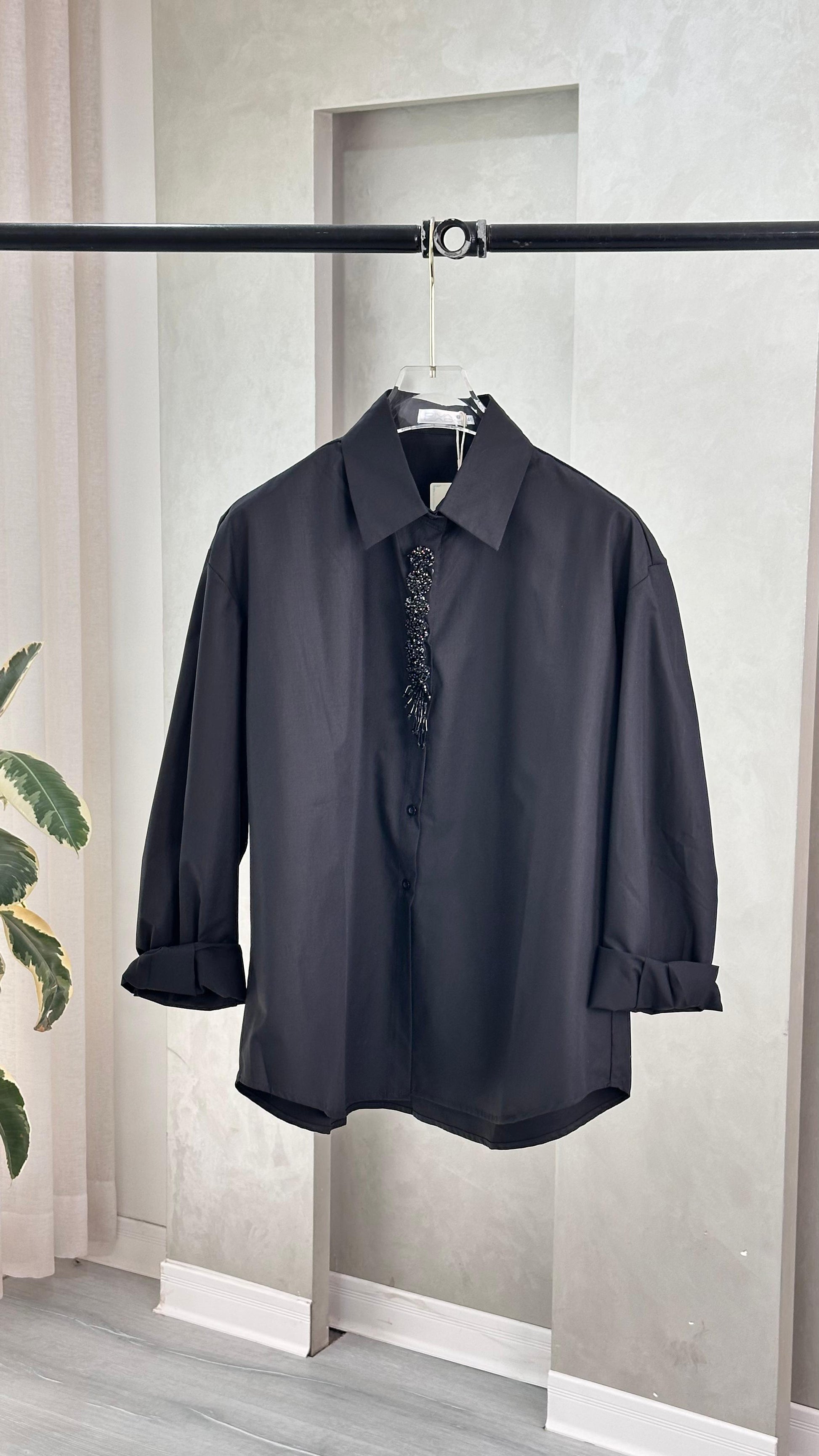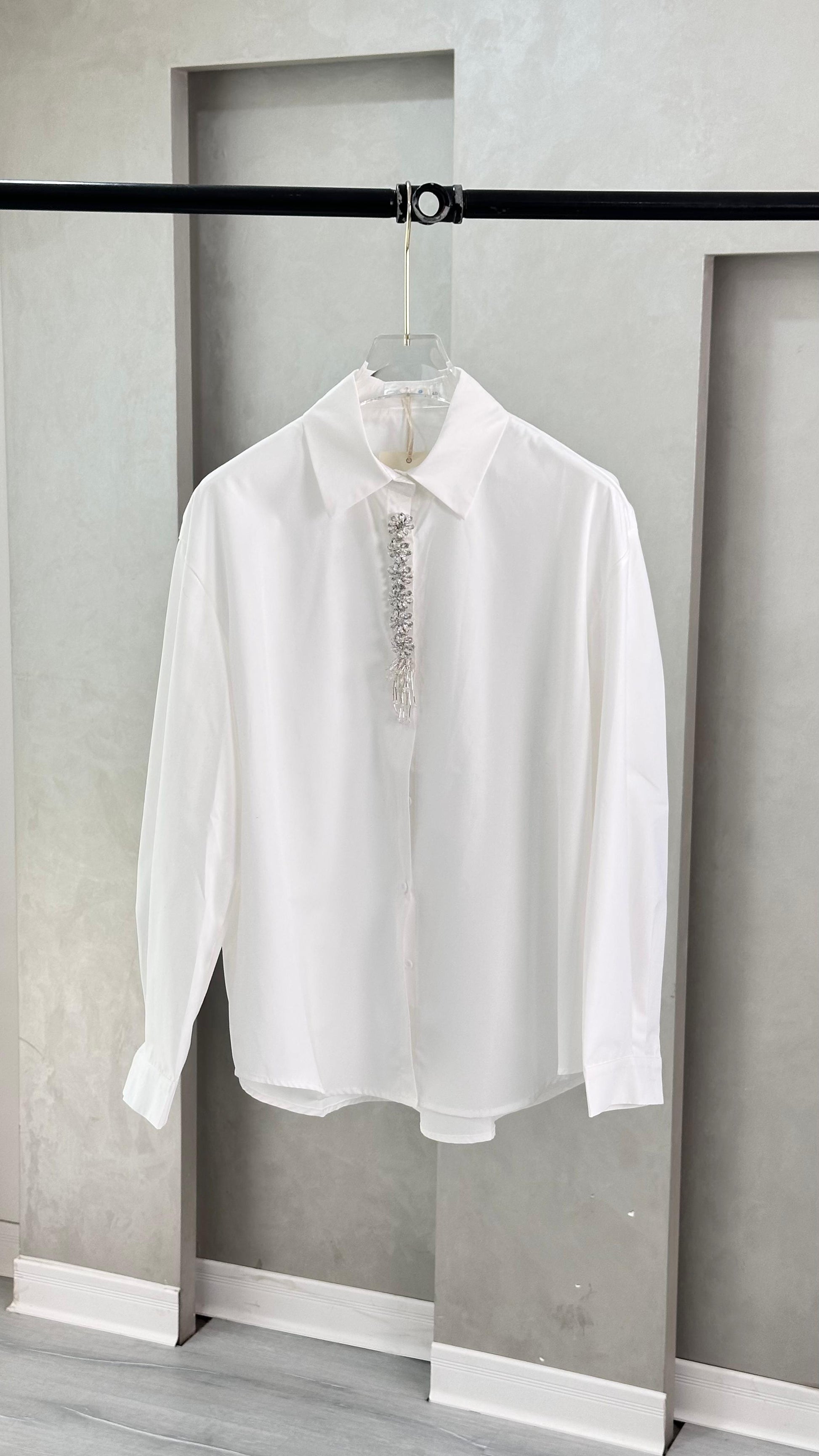 القميص طويل الأكمام، مزوّد بياقة كلاسيكية وأزرار أمامية، مع طيّات أنيقة عند الأكمام تُظهرها بشكل ملفوف. يمتاز بتفصيل زخرفي يمتد عموديًا من منطقة الياقة نحو الأسفل، مصنوع من خرز أو ترتر، يضيف لمسة لافتة إلى التصميم البسيط. القماش يبدو ناعمًا ومنسدلًا، ما يمنح القطعة مظهرًا متوازنًا بين الكلاسيكية والعصرية.اي
