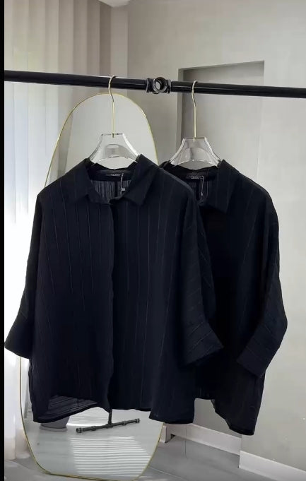 - **قميص بأكمام قصيرة**، يتميز بقصة فضفاضة ونمط خطوط طولية دقيقة تضيف لمسة ناعمة إلى التصميم، مع ياقة كلاسيكية وأزرار أمامية.