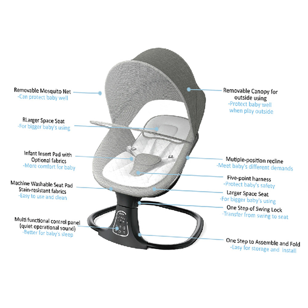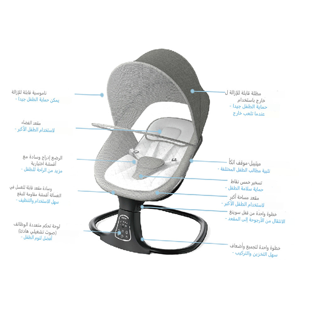 لوحة تحكم سهلة الاستخدام: تتميز بلوحة رقمية سهلة الاستخدام للتحكم في سرعات التأرجح، والألحان، والمؤقتات.