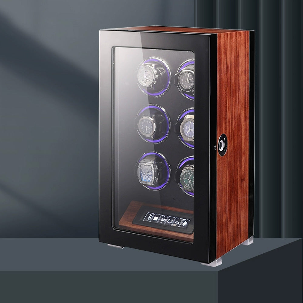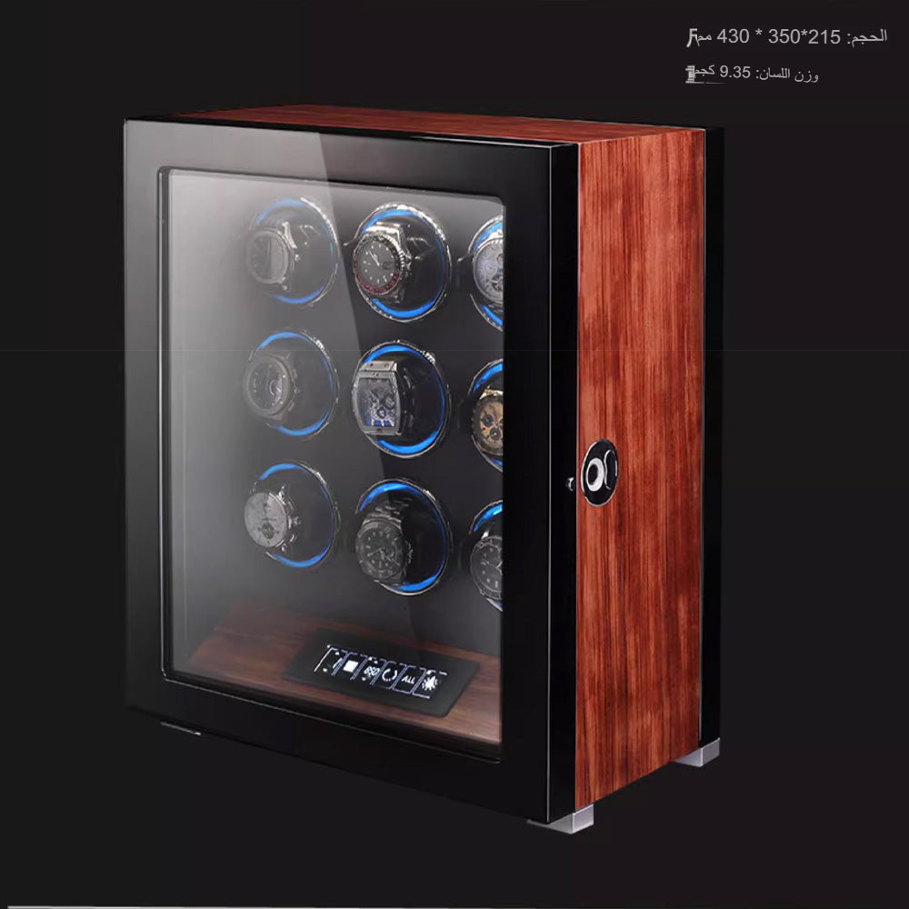علبة لف ساعات فاخرة متعددة – تصميم فاخر بتشطيب خشبي أحمر مع شاشة لمس LCD وإضاءة LED