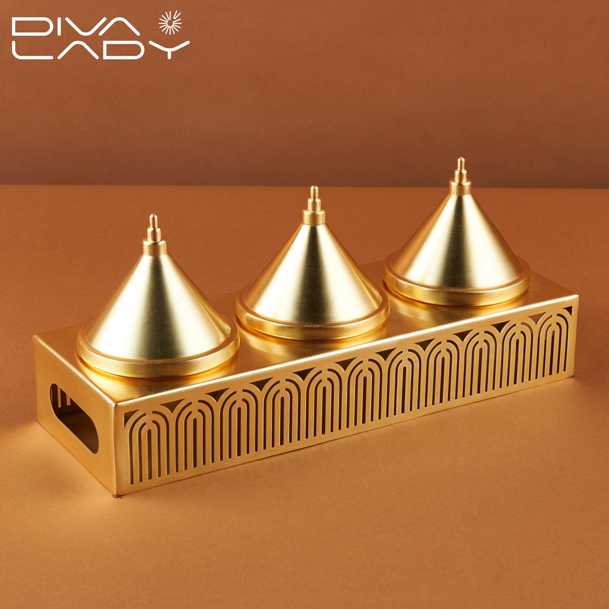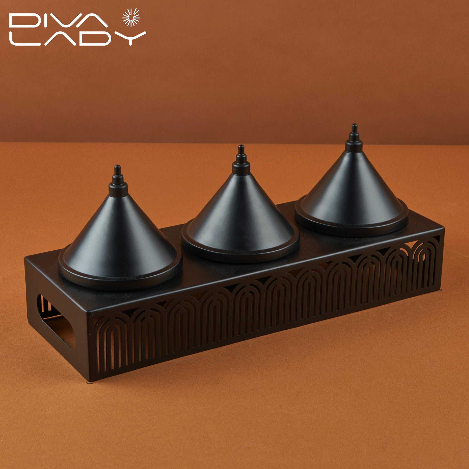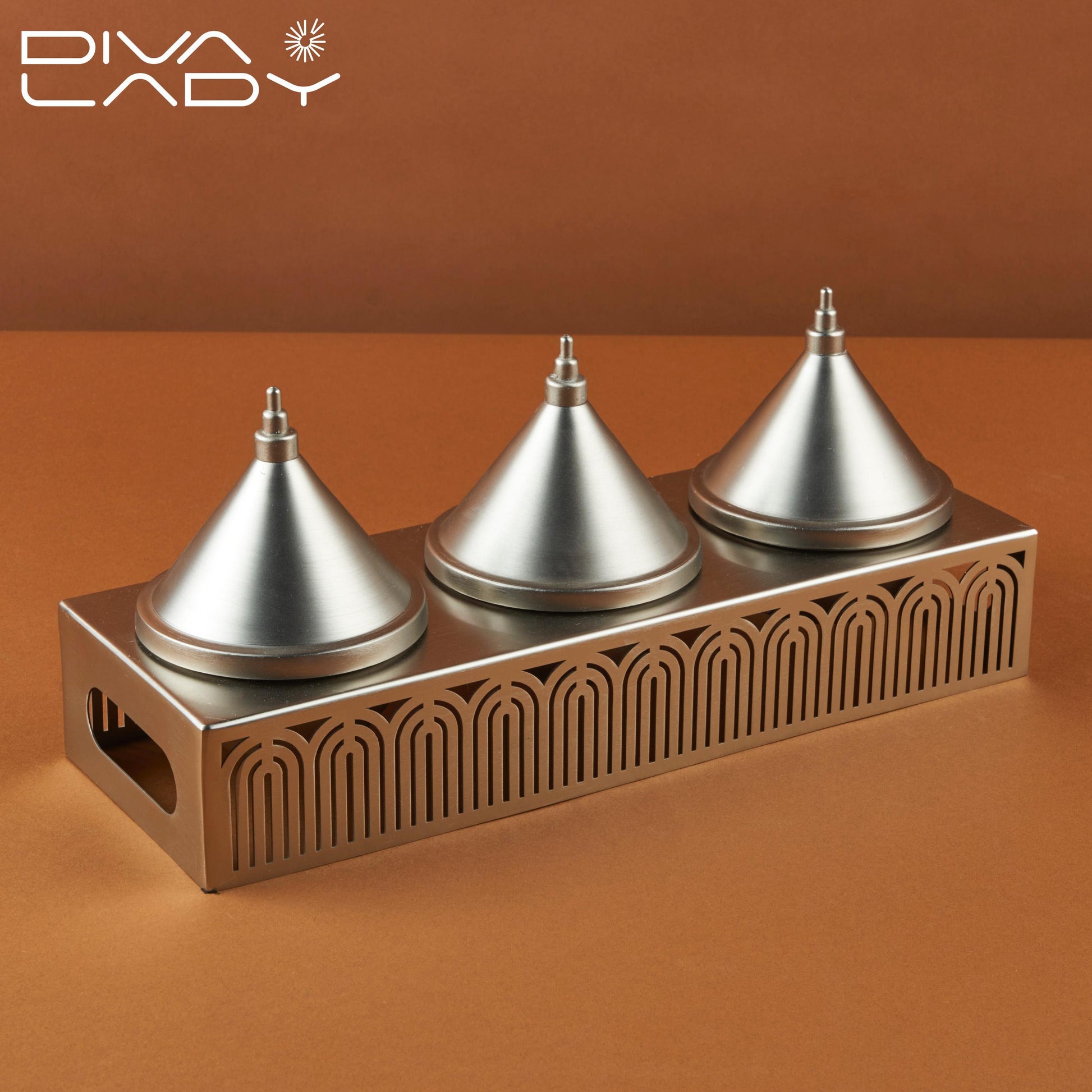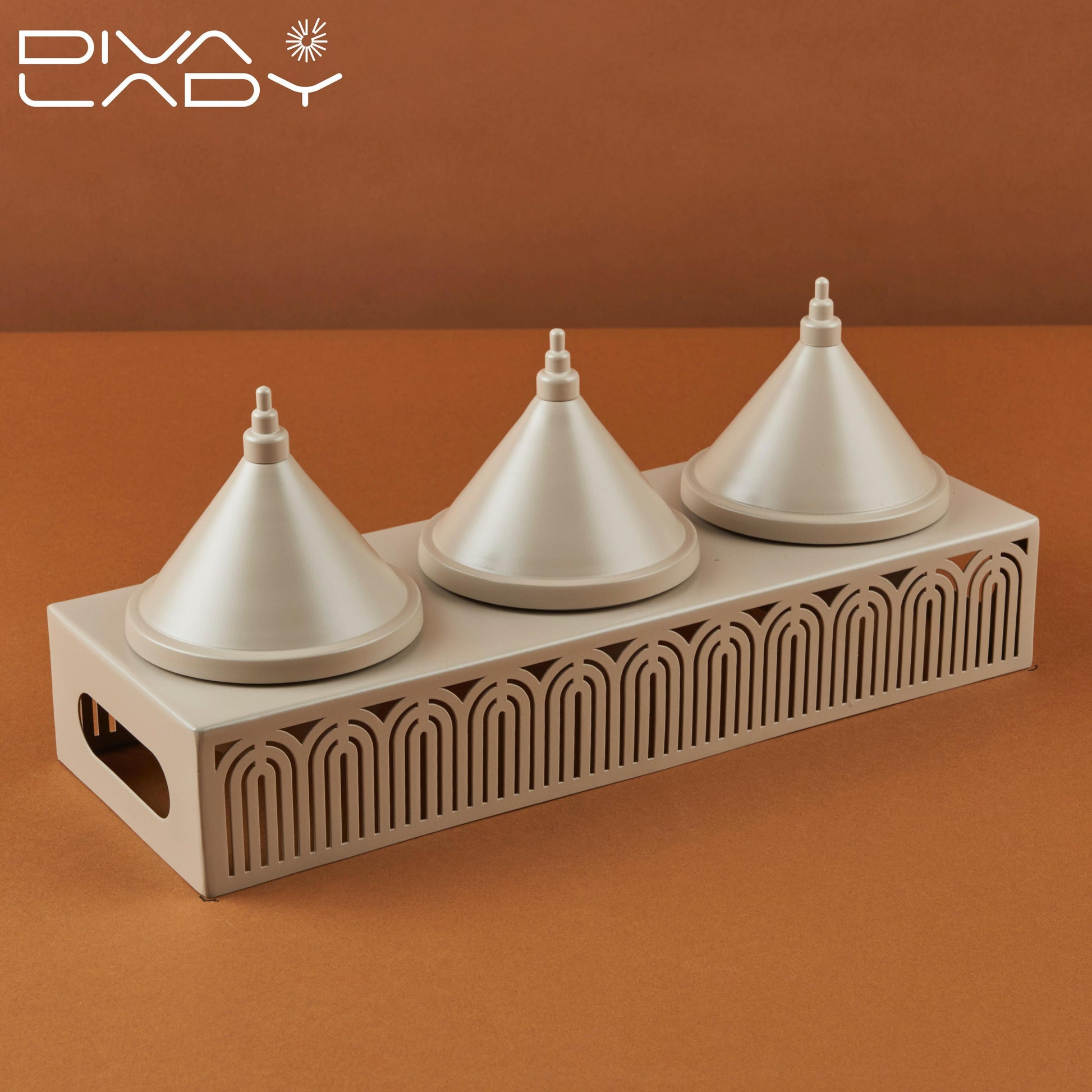 لتصميم أنيق ومزخرف، حيث تحتوي الصينية على ثلاثة أوعية معدنية مخروطية الشكل مزودة بأغطية، وهي مرتبة على قاعدة ذات نقوش جمالية تعكس الطابع التقليدي مع لمسة عصرية. المنتج مناسب لتقديم الضيافة أو تخزين التوابل والمكسرات بشكل منظم وجميل