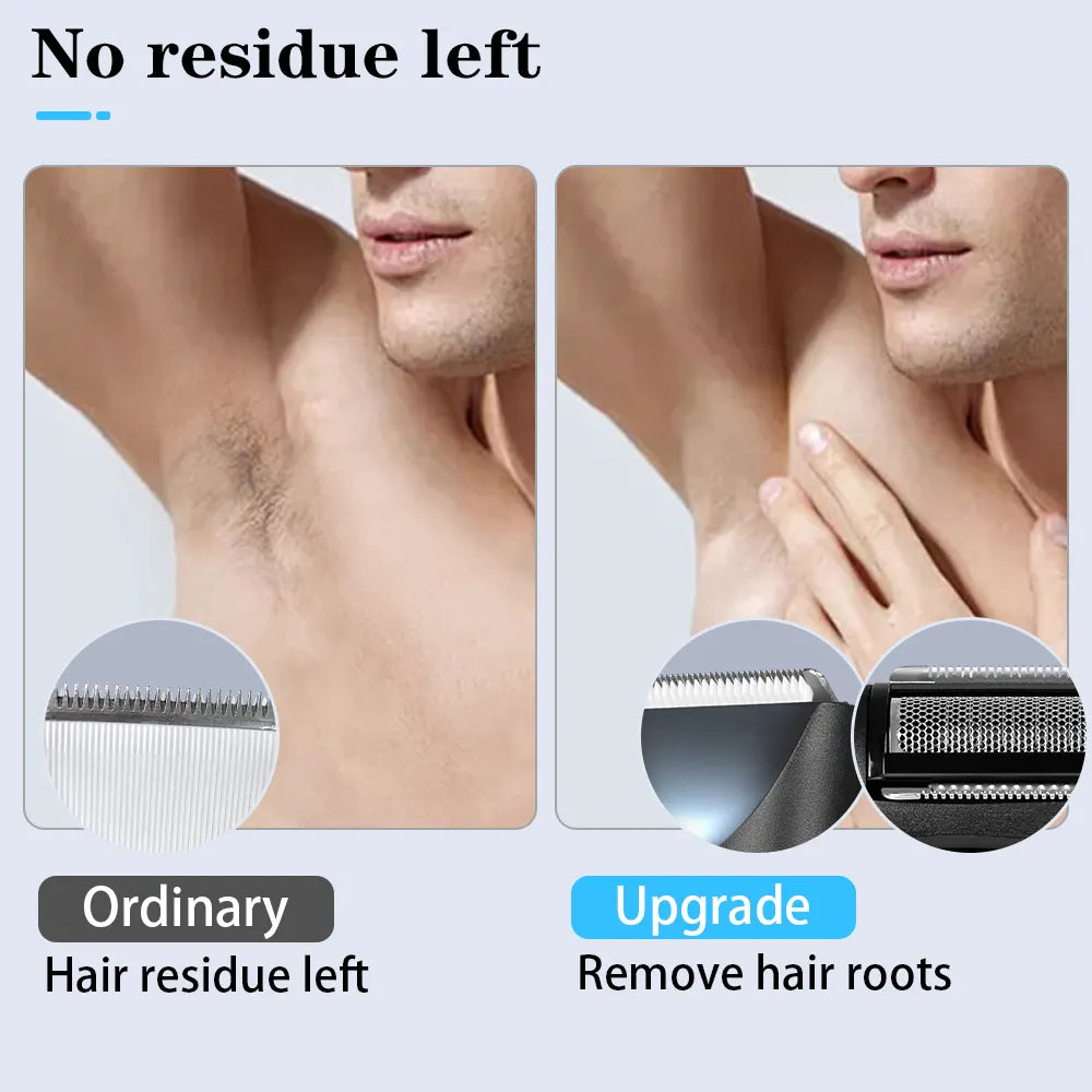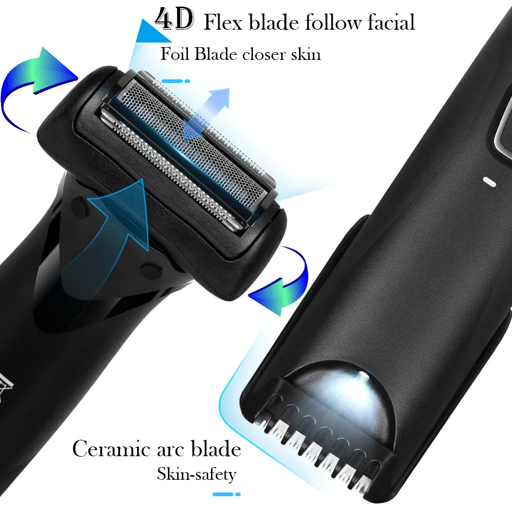 تصميم برأسين: تتميز ماكينة تشذيب شعر الجسم برأسين فريدين من نوعهما للعناية الدقيقة. هناك من يدعم الشعر الخشن مثل شعر العانة والصدر والإبط، بينما ماكينة قص الملابس المصنوعة من القماش المعدني مع قماش الشعيرات، مما يجعل أوراق الشجر خالية من القماش.