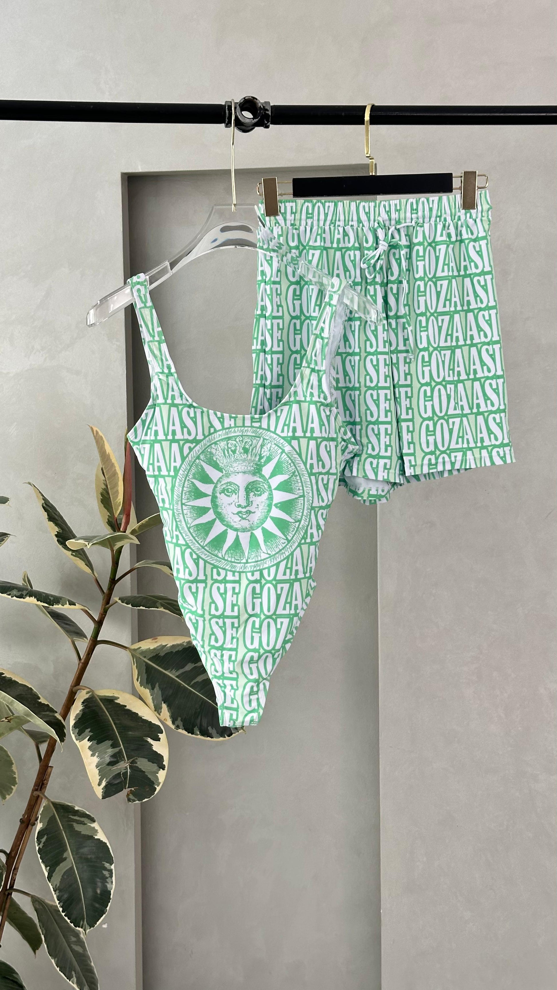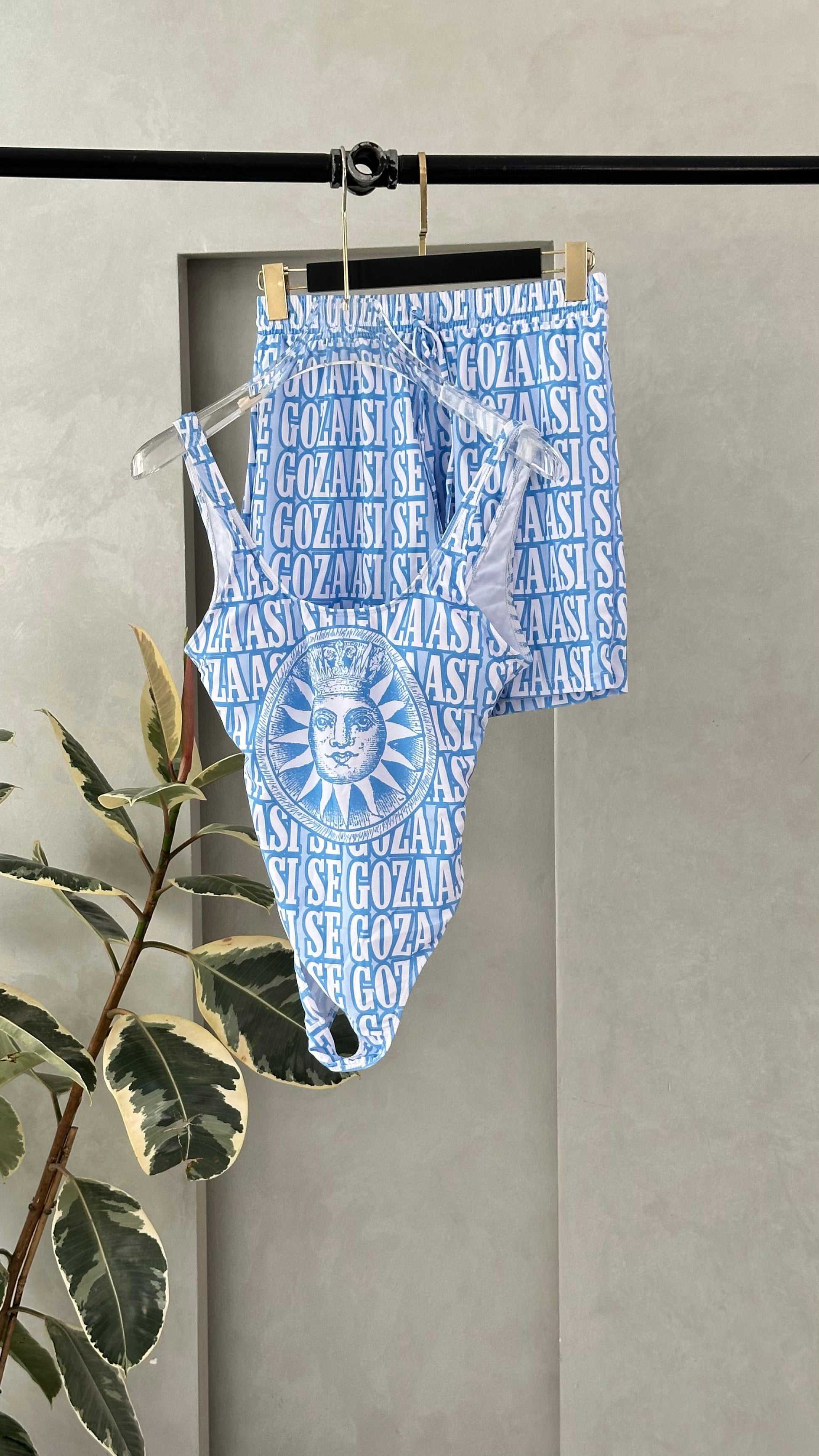 قطعة السباحة (المايوه): بقصة جريئة (High-cut/Bodysuit)، وتتميز بطبعة شمس كبيرة وواضحة في المنتصف مع أشعة محاطة بكتابات أو شعارات متكررة باللون الأبيض.