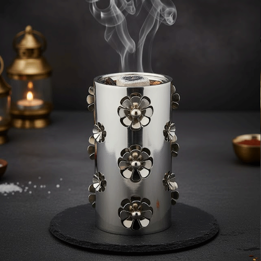 تمنحك هذه المبخرة تجربة فريدة تمزج بين الأصالة والتصميم الحديث. بفضل شكلها الأسطواني الأنيق ولمساتها اللامعة، تضيف رونقًا خاصًا أينما وُضعت، سواء على طاولة الضيافة أو في زوايا المنزل الراقية.