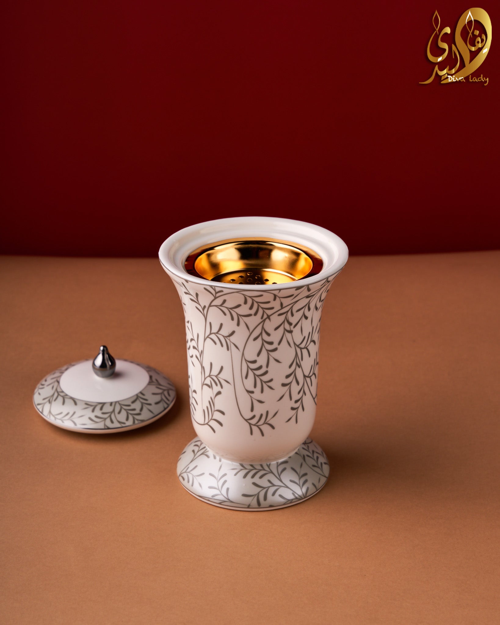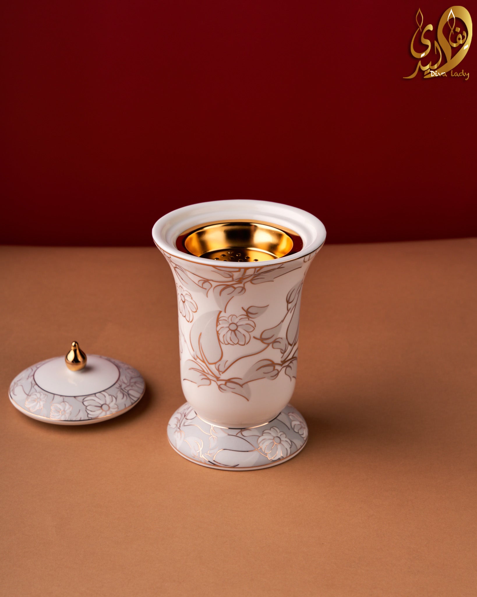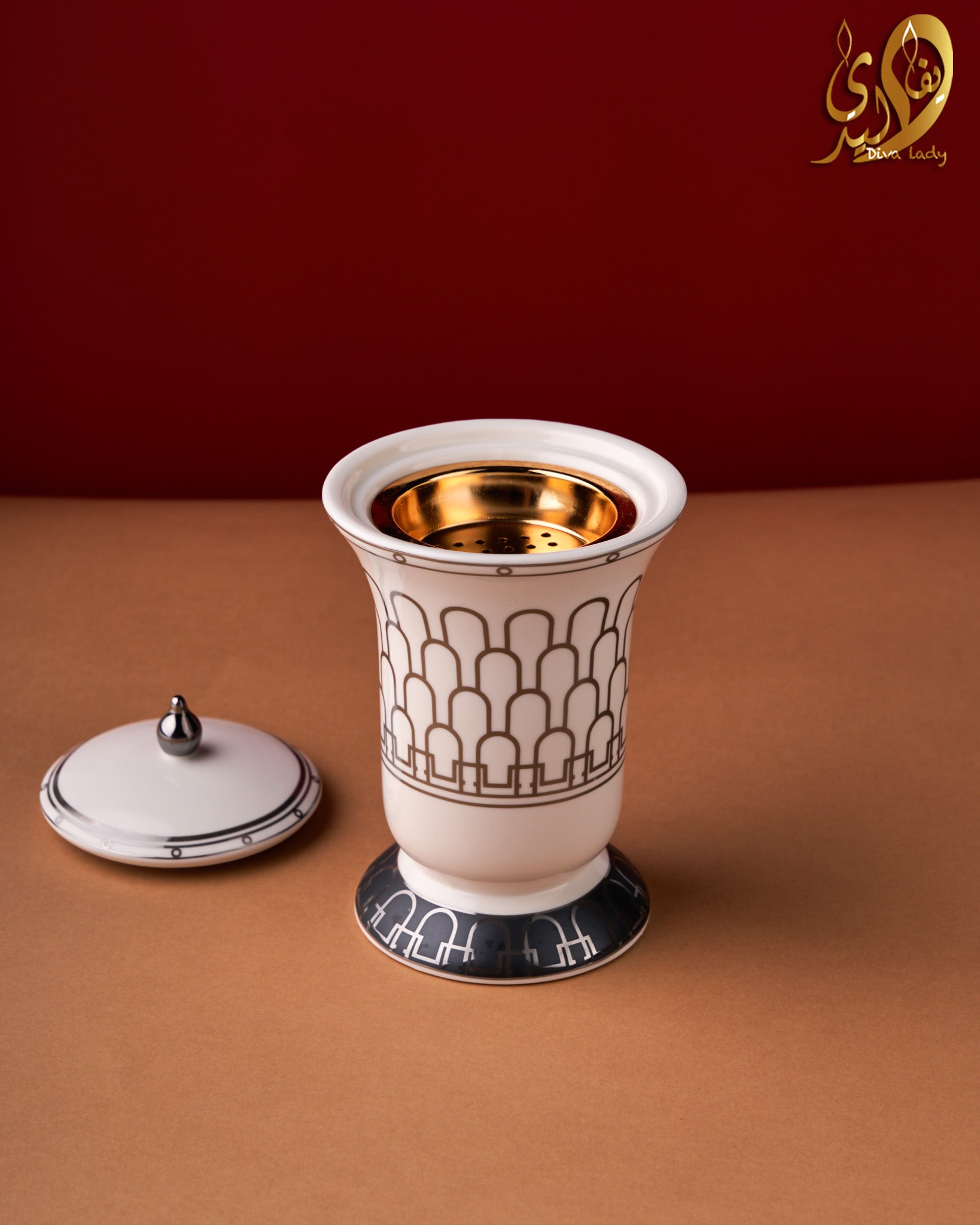 مبخرة راقية مصنوعة من البورسلان عالي الجودة، بتصميم هندسي فريد وألوان أنيقة. الجزء العلوي مطلي بلون ذهبي لامع يمنحها لمسة فخامة مميزة، وتأتي بغطاء منفصل يكمل جمالها الكلاسيكي.
