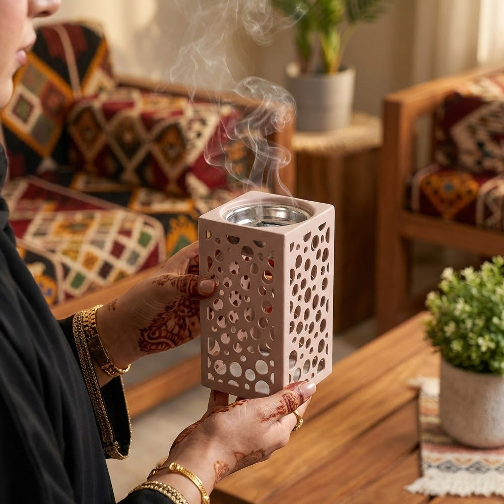 أضف لمسة من الأناقة والروح الشرقية إلى منزلك مع هذه المبخرة المصممة بعناية. تتميز بهيكل هندسي أنيق بفتحات فنية تسمح بتصاعد دخان البخور بشكل جميل يملأ المكان برائحة فاخرة وأجواء دافئة.