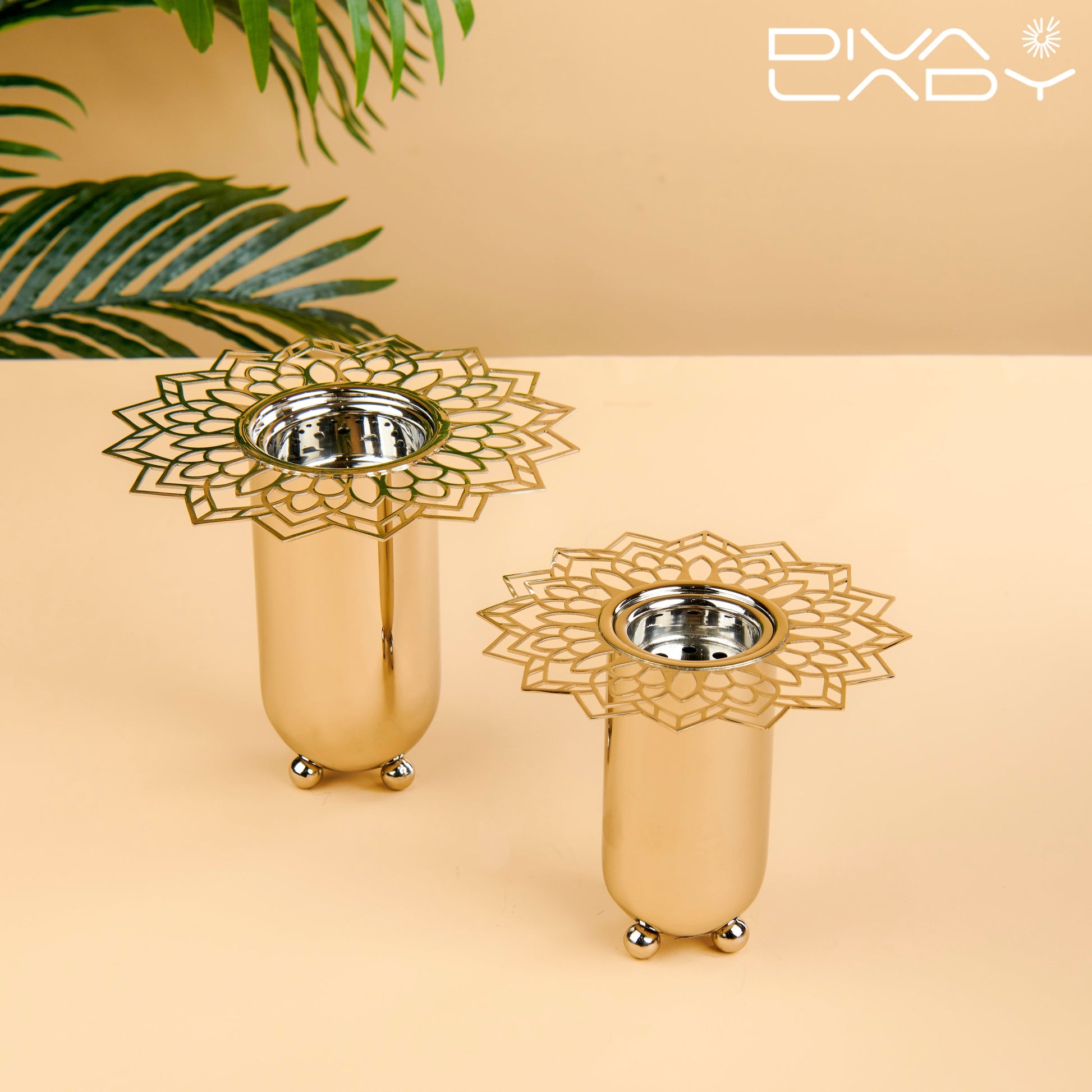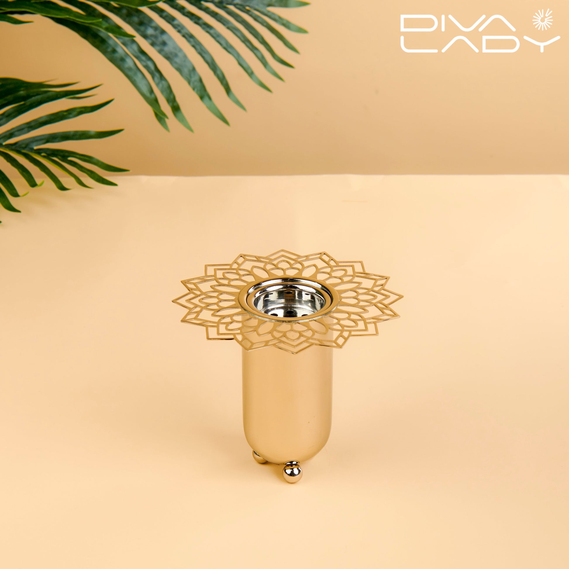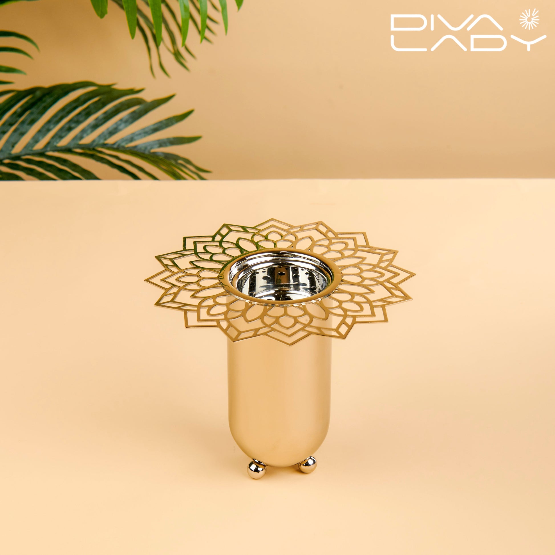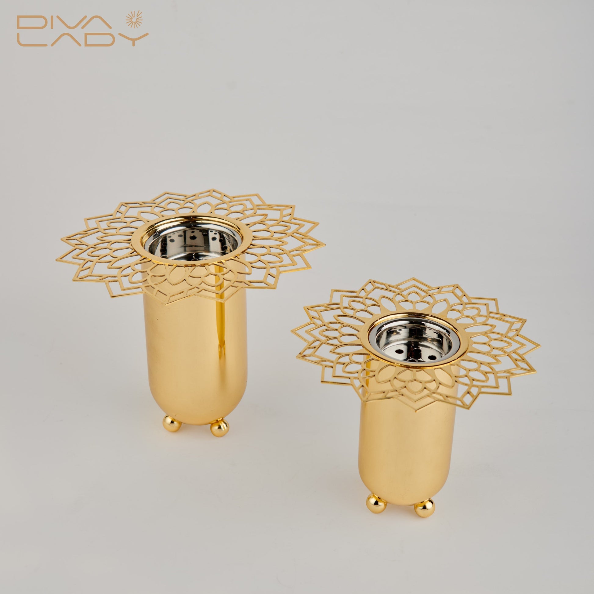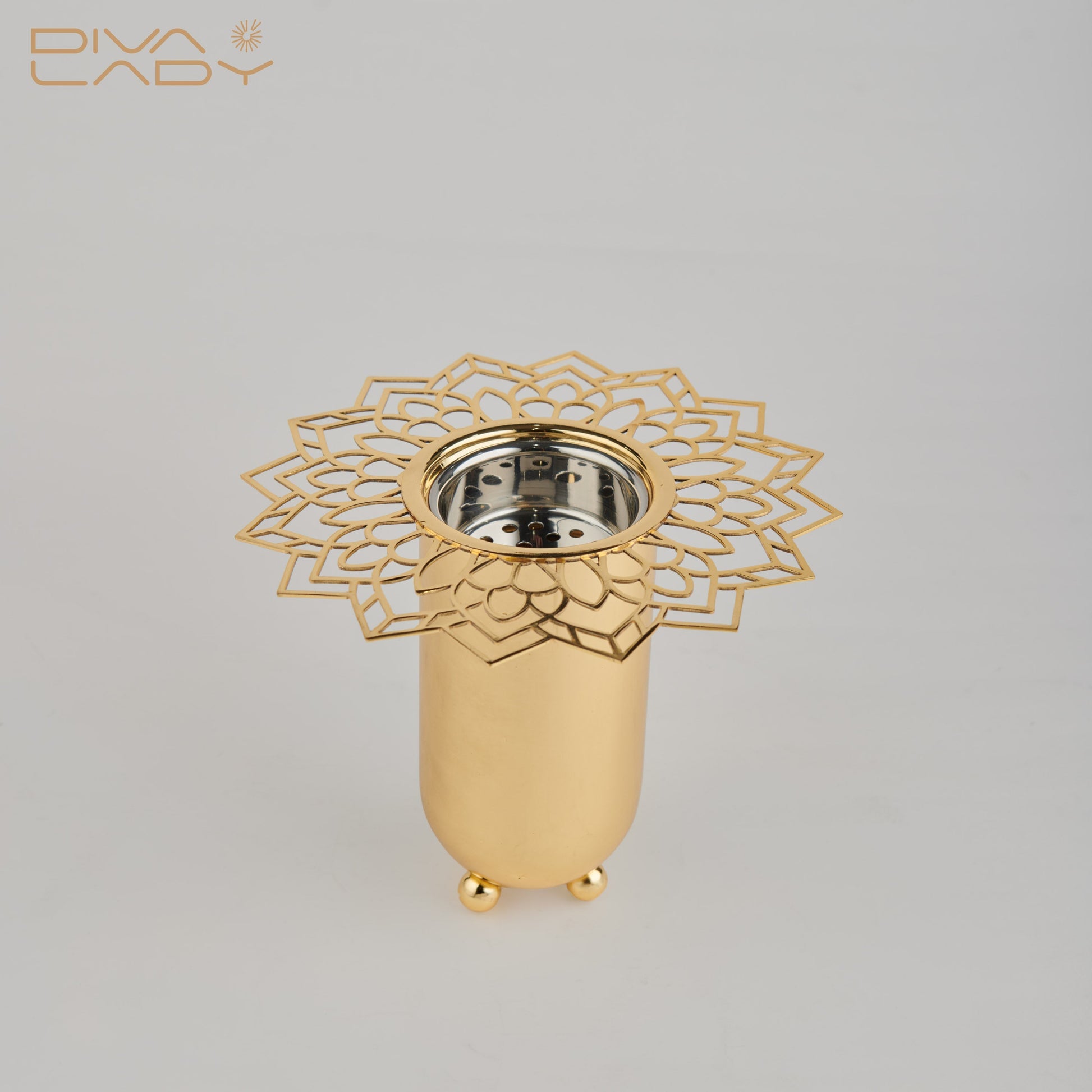 مبخرة فاخرة مطلية بالذهب بتصميم زخرفي عربي أنيق – متوفرة بعدة أحجام تناسب جميع الأذواق والاستخدامات. تأتي بقاعدة مرتفعة وثابتة مع فتحة داخلية مخصصة للفحم أو المعطرات، مما يجعلها مثالية للاستخدام اليومي أو المناسبات الخاصة.
