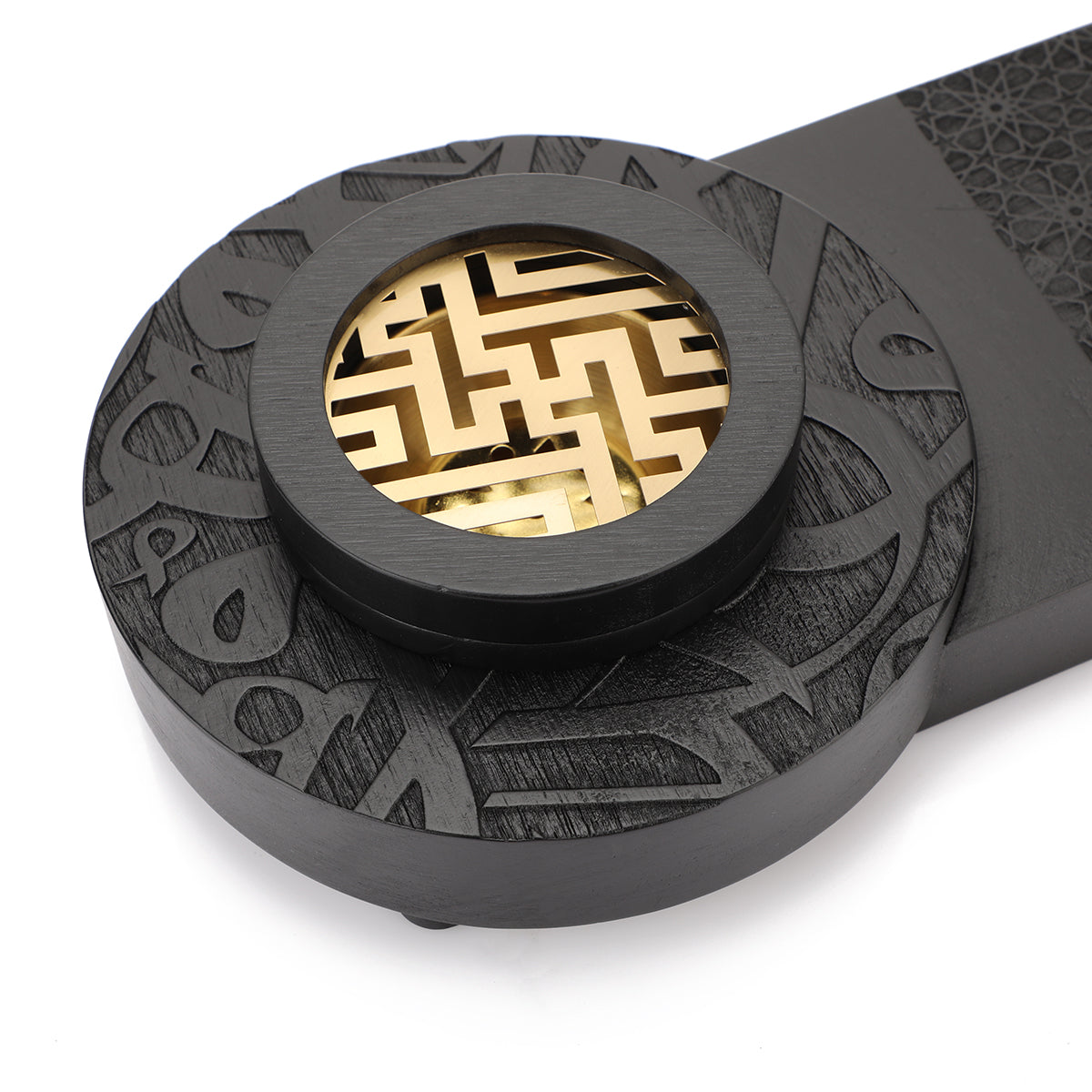 الخامة: خشب فاخر محفور يدويًا مع غطاء علوي معدني ذهبي بنقش مفرّغ