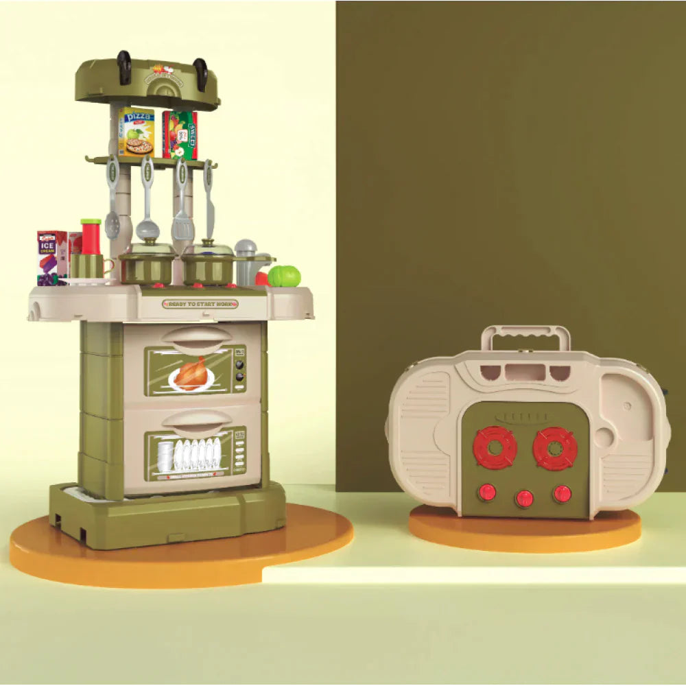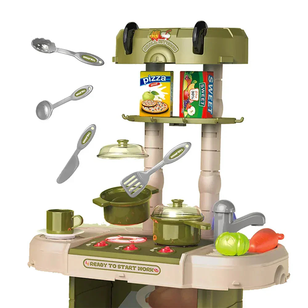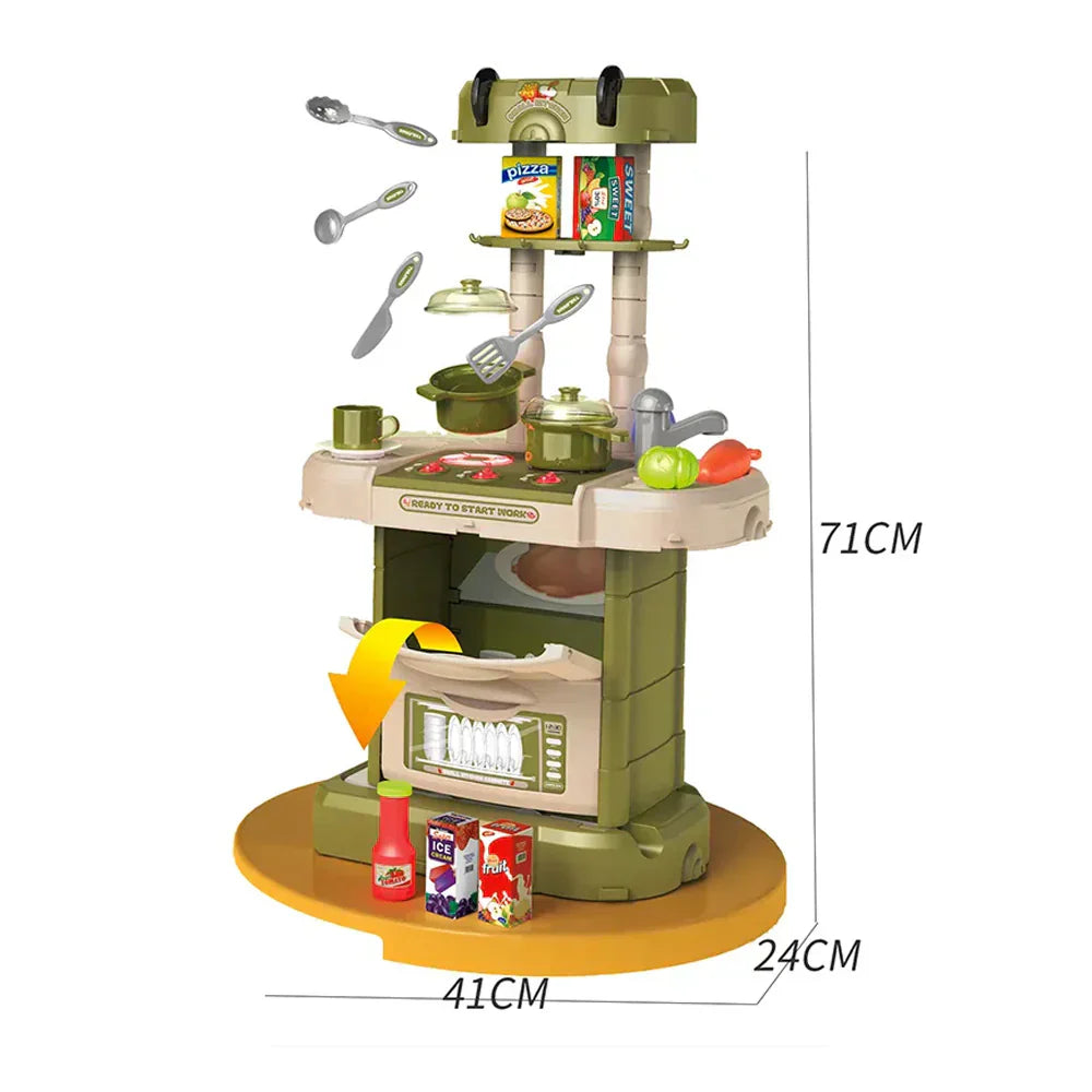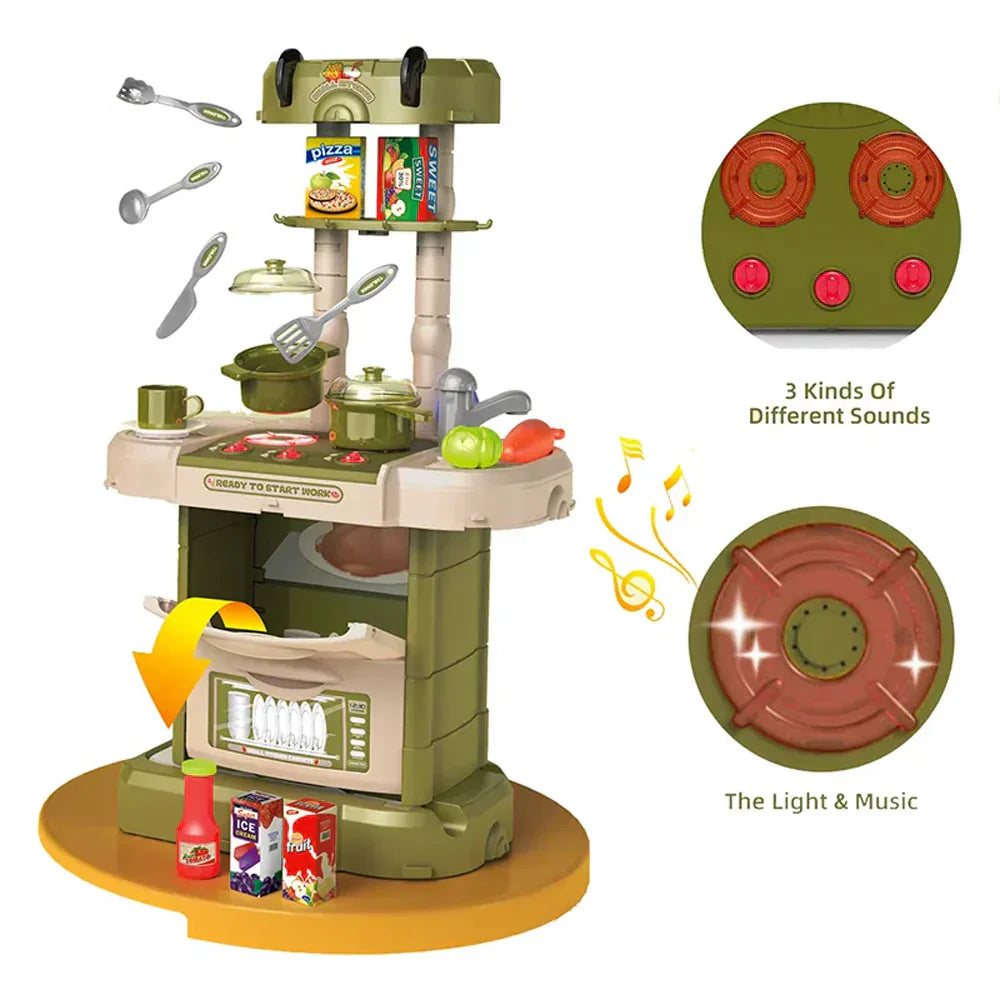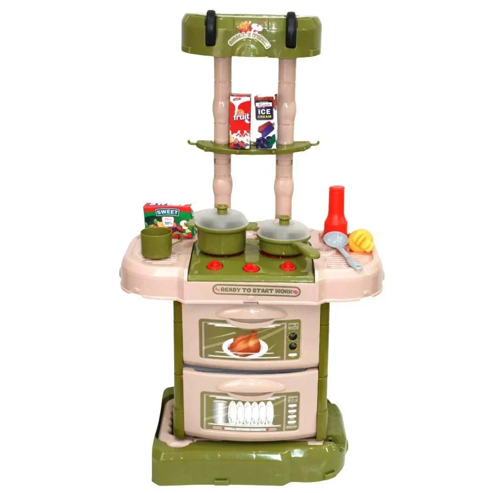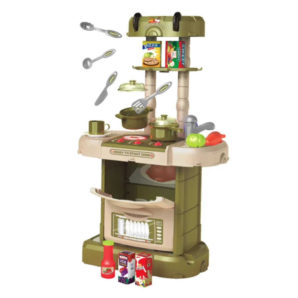 تحتوي مجموعة اللعب هذه أيضًا على وظائف إضاءة وصوت تعمل بالبطارية على الموقد وموقد المطبخ، مما يخلق أصواتًا وأضواء واقعية سيحبها طفلك. كما تتضمن وظيفة محاكاة البخار التي ستنفث الهواء البارد من الموقد مما يمنح طفلك تجربة لعب أكثر واقعية! يمكن لطفلك الصغير حتى التسوق لشراء الطعام بنفسه باستخدام عربة التسوق اللطيفة المضمنة.