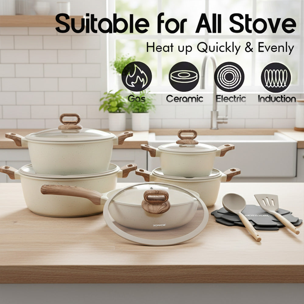 مجموعة كاملة من أواني الطهي الجرانيتية غير اللاصقة، مكونة من 15 قطعة، تتميز بأواني طهي متينة، ومقالي، وأدوات سيليكون، وواقيات أواني. مصممة لتسخين متساوٍ، وسهولة تنظيف، وأداء يدوم طويلاً. 🔍 المحتويات (١٥ قطعة)